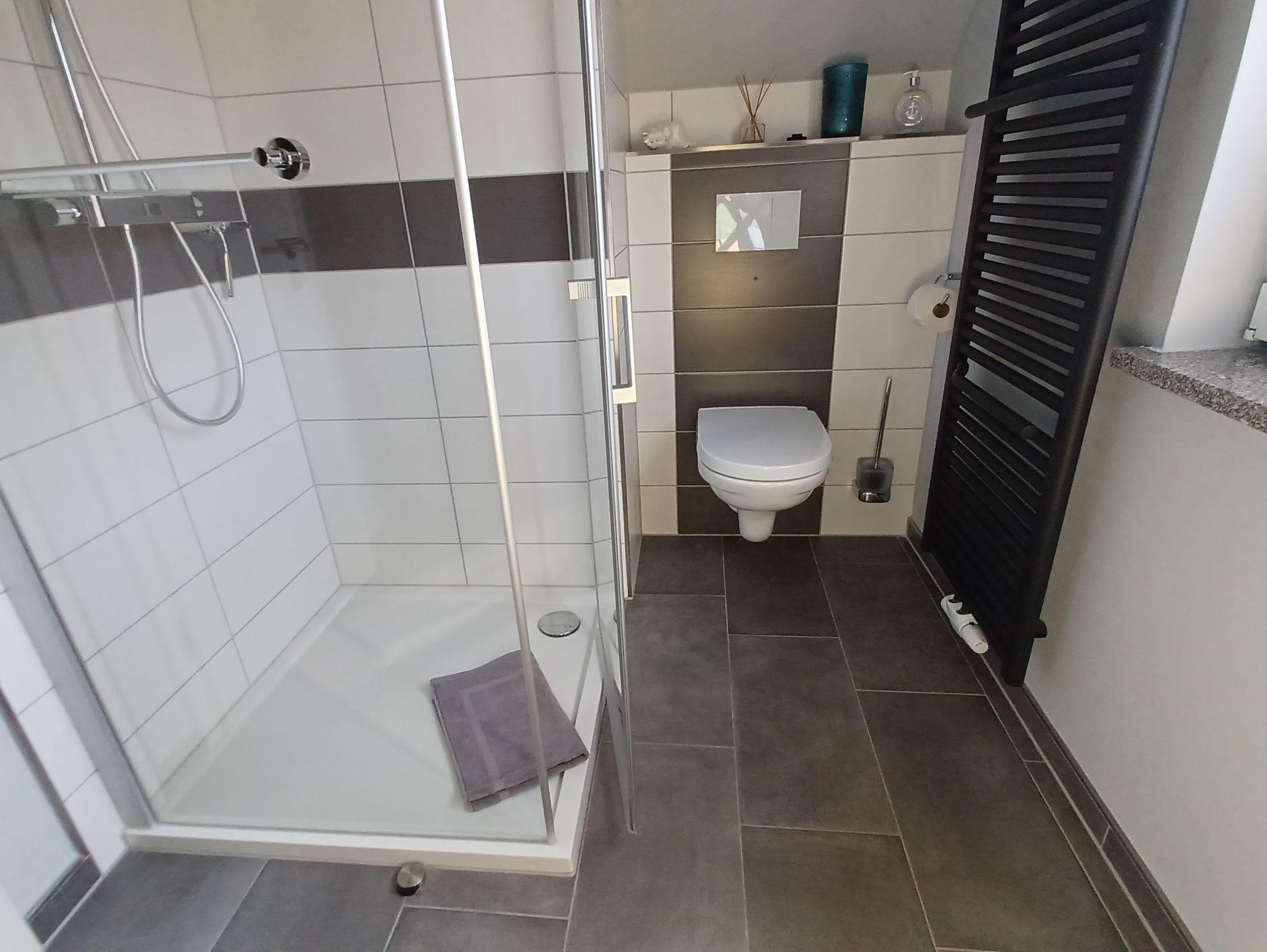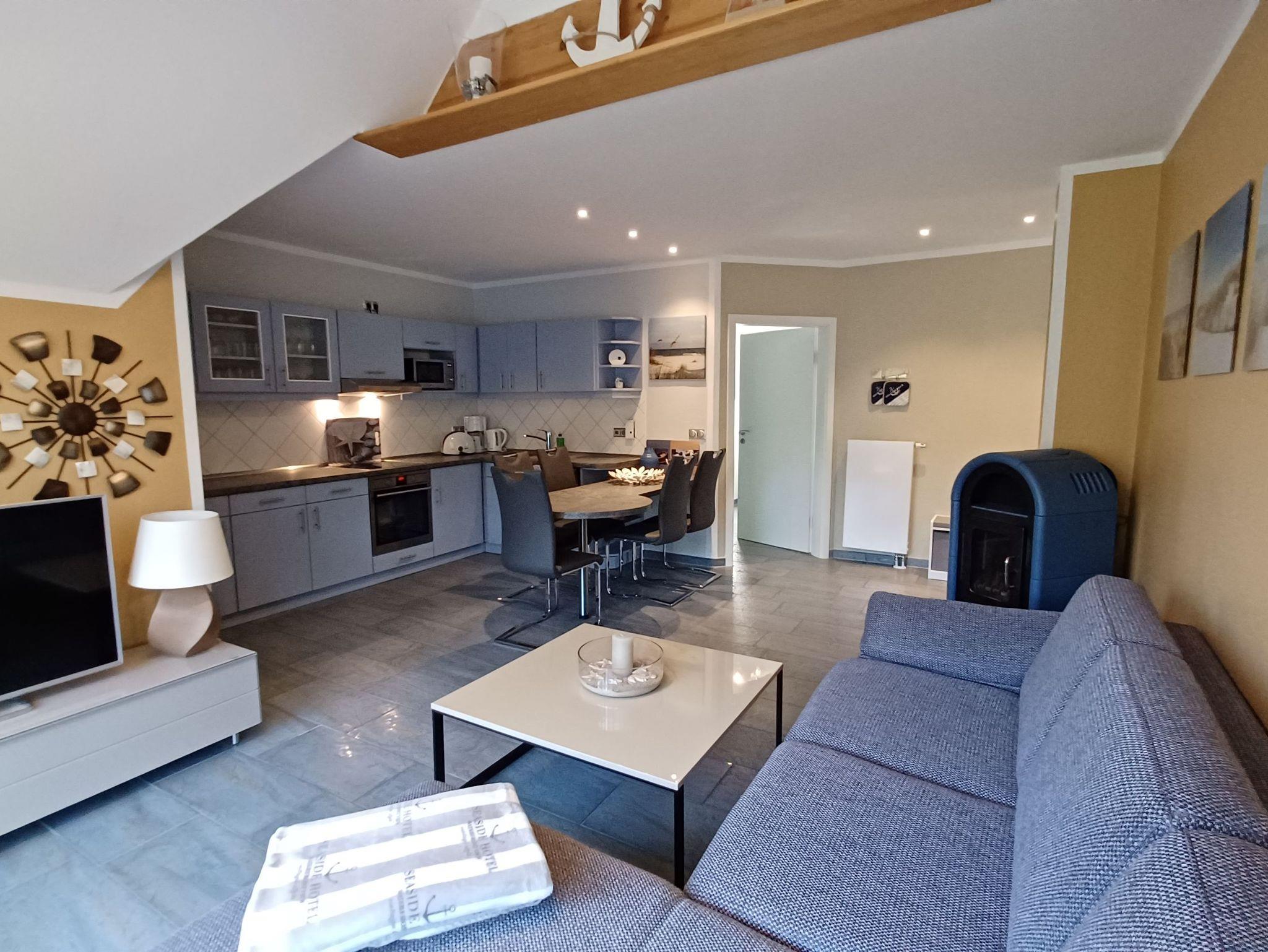 Die Wohnung wurde mit viel Liebe zum Detail von den Vermietern eingerichtet. Das Wohnzimmer verfügt über eine gemütliche Couch , SAT- TV und einen Kamin. Im Schlafzimmer befindet sich ein Doppelbett 1,80 x 2,00 cm (mit getrennten Matratzen) und viel Stauraum. Im 2. Schlafzimmer befindet sich ein Bett 0,90 x 2,00 m (ausziehbar). Auch bei der Küchenausstattung wurde auf jedes Detail geachtet, damit die Gäste sich rundum Wohlfühlen können. Zur Ausstattung gehören alle notwendigen Küchenutensilien und laden mit dem Essplatz zum gemeinsamen kochen ein. Die Küchenzeile wurde mit Kaffeemaschine, Wasserkocher, Kühlschrank mit Gefrierfach, Mikrowelle, Geschirrspüler und Herd mit Cerankochfeld sowie einem Backofen ausgestattet. Das moderne Badezimmer wurde mit einer ebenerdigen Dusche und Fön ausgestattet. Alle Räume der Ferienwohnung sind mit Fliegengasen und einer Aussenjalousie ausgestattet. Die Wohnung ist eine Nichtraucherwohnung. Für unsere Gäste steht ein kostenloses WLAN bereit. Die Bettwäsche und Handtücher können bei der Zimmervermittlung dazu gebucht werden - ein Paket 19,50 € (1 Badetuch, 1 Handtuch, 1 Kopfkissen, 1 Bezug und 1 Spannbettlaken).