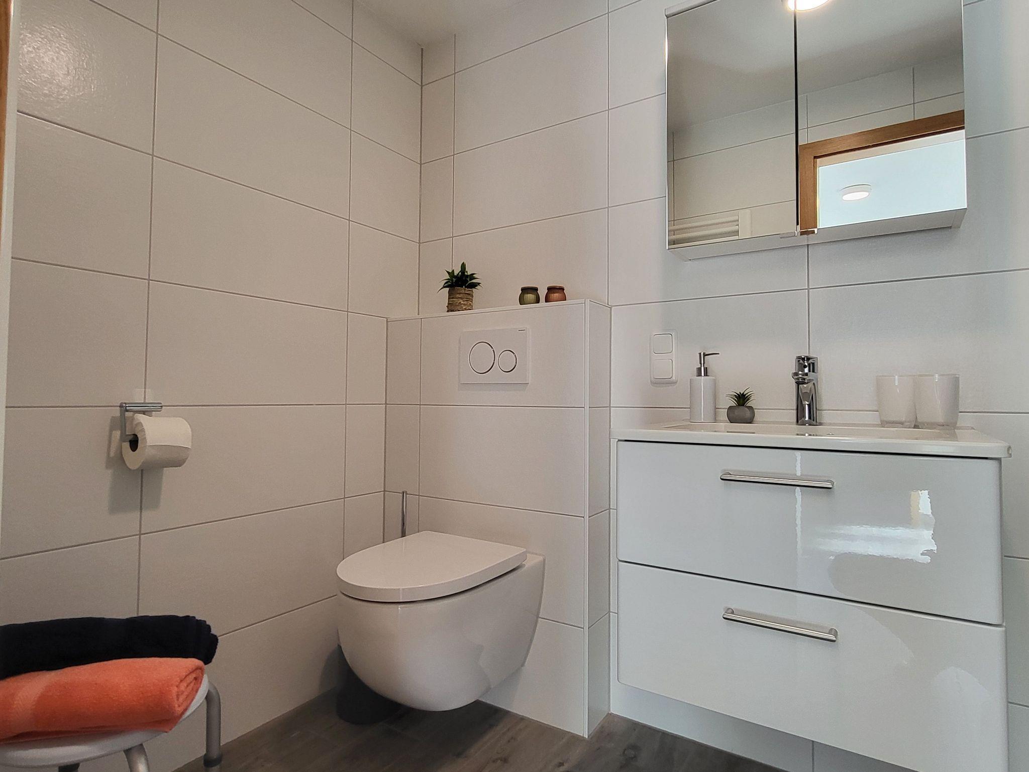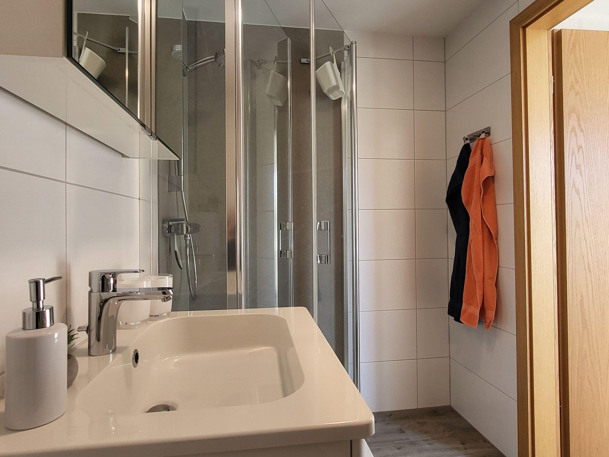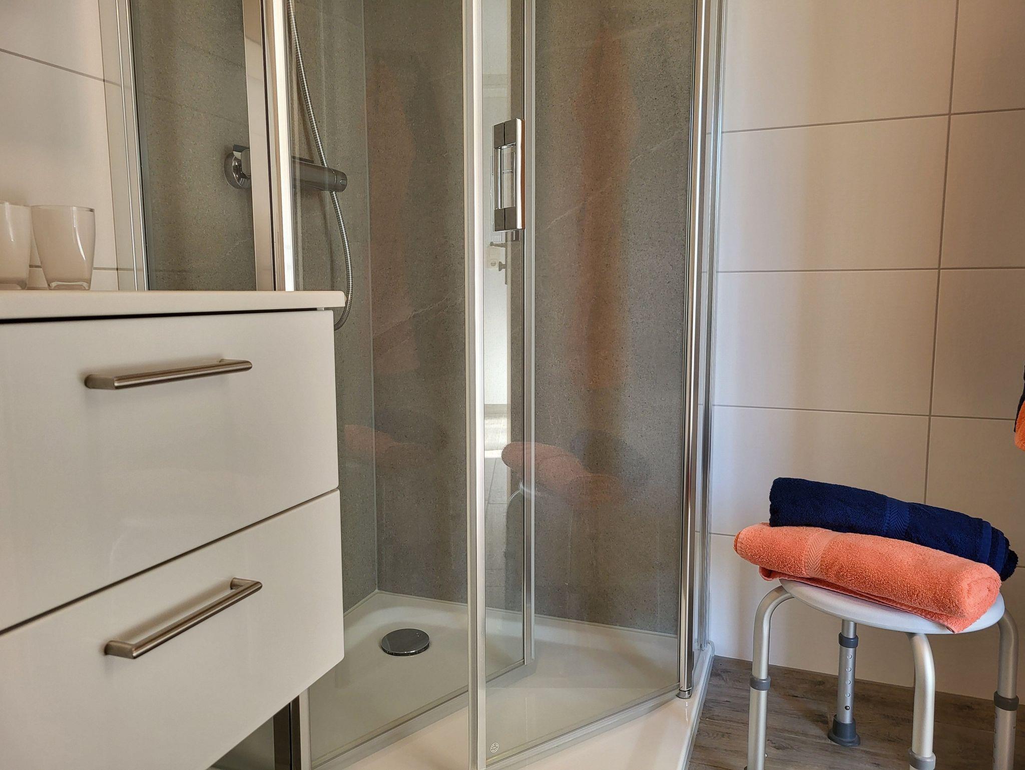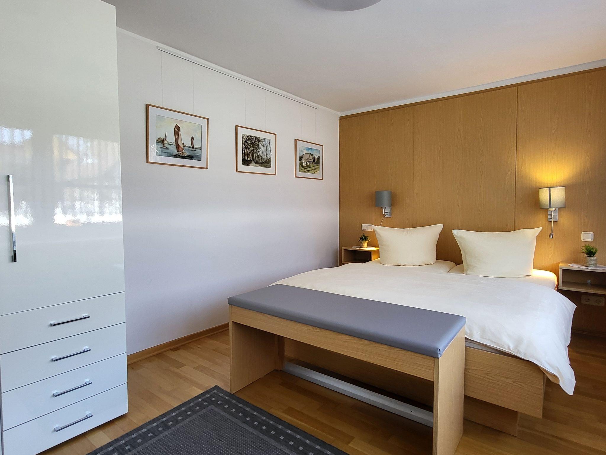 Das Schlafzimmer verfügt über ein Doppelbett 1,60 x 2,00 m (getrennte Matratzen). Die Bettwäsche ist inclusive, Handtücher können in der Zimmervermittlung für 7,00 € pro Person (1 Badetuch, 1 Handtuch) dazugebucht werden.Das Bad verfügt über eine ebenerdige Dusche.