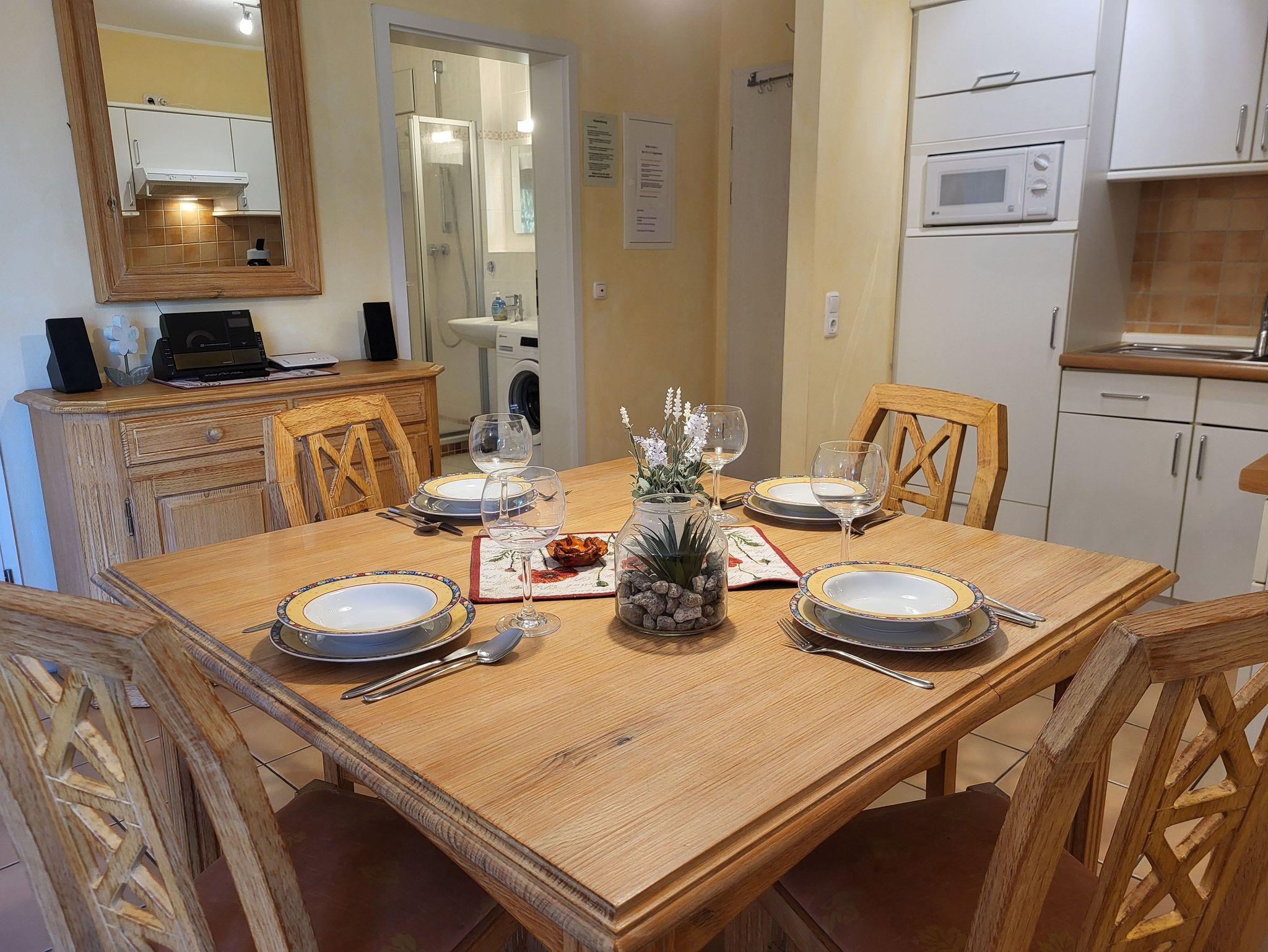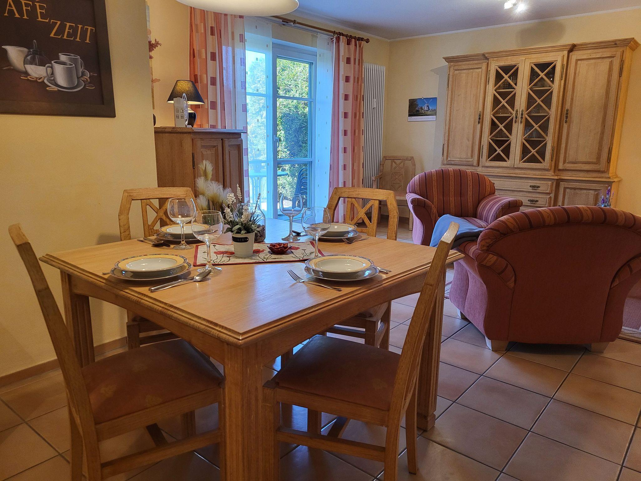 die zentral gelegene und hochwertig ausgestattete Ferienwohnung im Erdgeschoss in der Schmiedestraße ist für bis zu 4 Personen geeignet. Direkt am Wohnzimmer gelangen Sie auf die sonnige Westseitige Terrasse mit Gartenmöbel und Sonnenschutz. Das Wohnzimmer ist mit SAT- TV, offene Küchenzeile mit Essplatz und einer gemütlichen Couch ausgestattet. Die offene Küchenzeile lädt zum Kochen ein, zur Ausstattung gehört ein Herd mit Backofen und Cerankochfeld, Kühlschrank mit Gefrierfach, Mikrowelle und ein Geschirrspüler.Das Schlafzimmer ist ausgestattet mit einem Doppelbett 1,80 x 2,00 m ( getrennte Matratzen ) und das Kinderzimmer mit einem Etagenbett für unsere kleinen Gäste.Das innenliegende Badezimmer verfügt über eine ebenerdige Dusche und Waschmaschine mit Trocknerfunktion. Den feinsandigen Strand an der Seebrücke erreichen Sie in ca. 15 min. Fußweg.. Die Bettwäsche und Handtücher können bei der Zimmervermittlung dazugebucht werden, ebenso können Kinderbett und Hochstuhl für je 10,00 € pro Woche hinzugebucht werden. Ein Wäschepaket 19,50 € (1 Badetuch, 1 Handtuch, 1 Laken, 1 Kopfkissen, 1 Bezug). Die Fenster sind mit mechanischen Außenjalousien ausgestattet. Unsere Wohnung ist eine Nichtraucherwohnung. Haustiere sind herzlich willkommen.Der Parkplatz Nr. 10 befindet sich vor dem Haus. Die Ferienwohnung ist mit WLAN ausgestattet.
