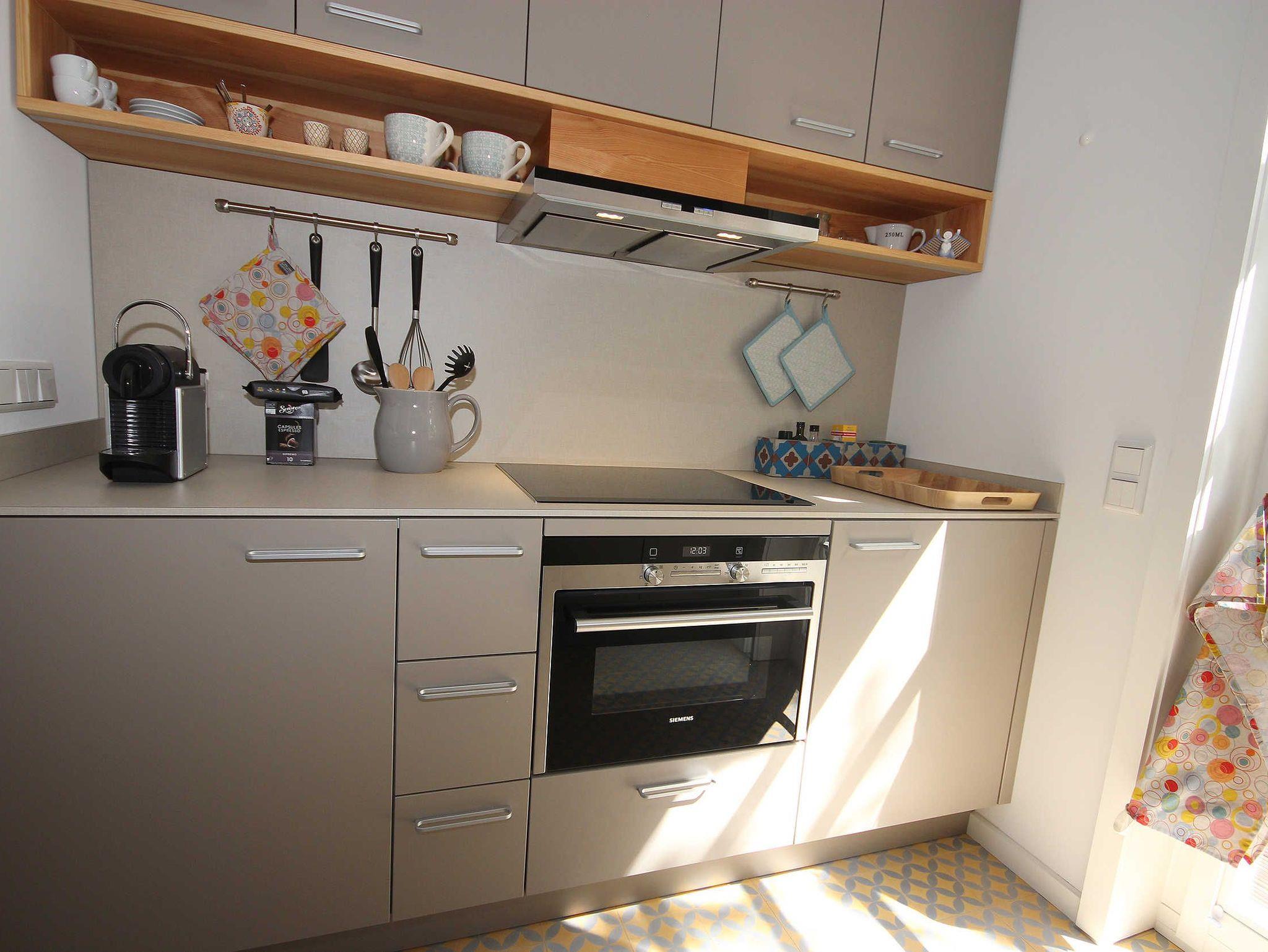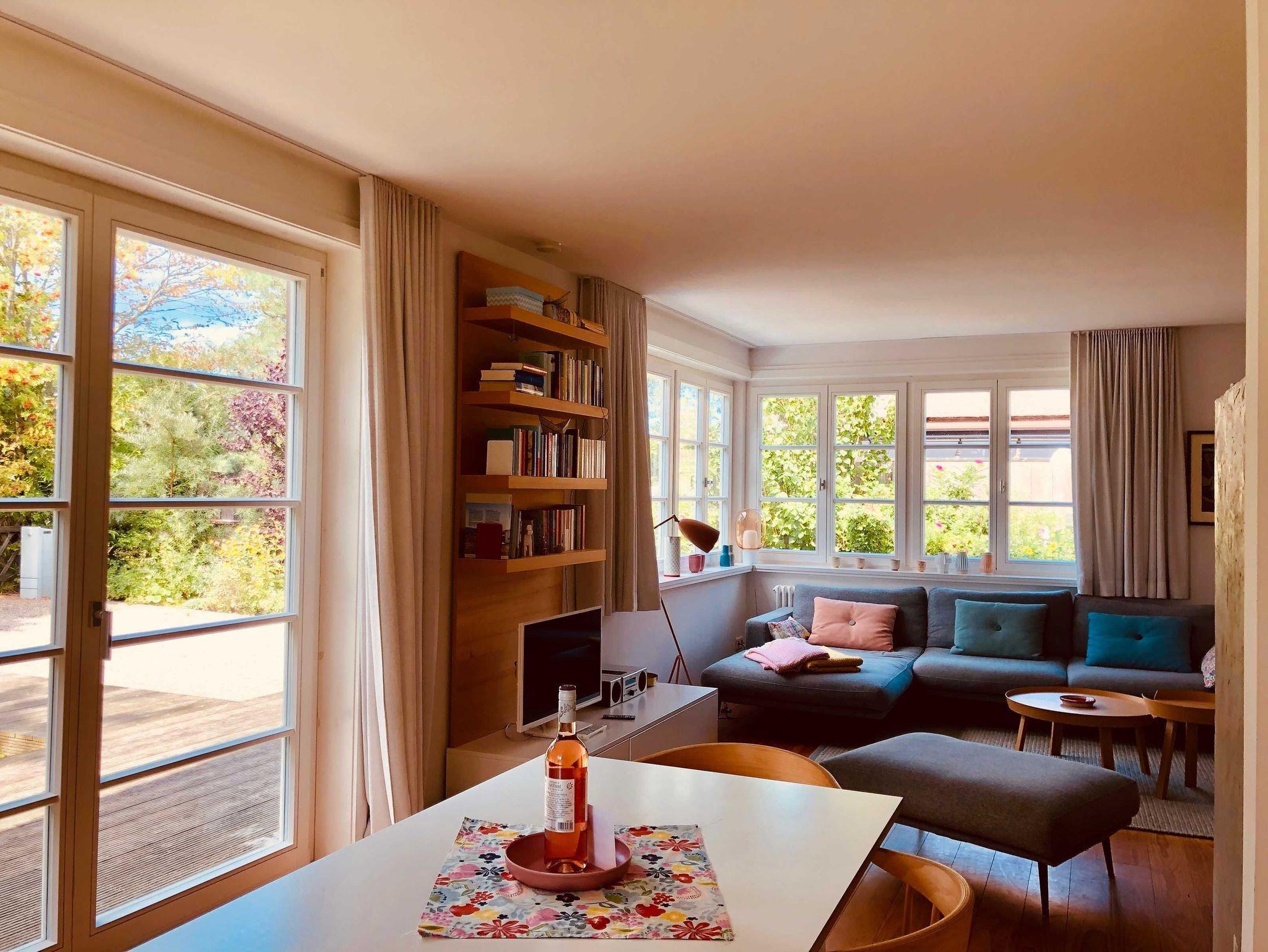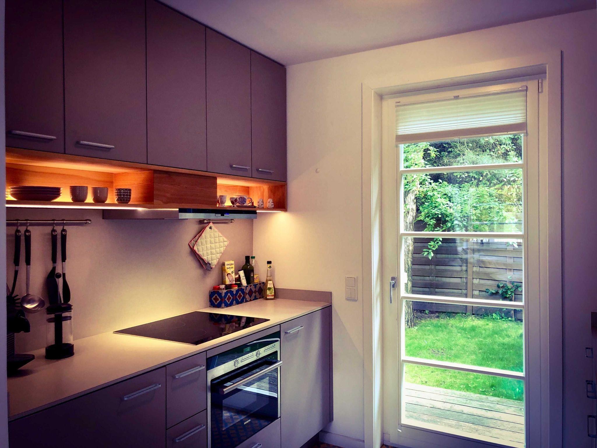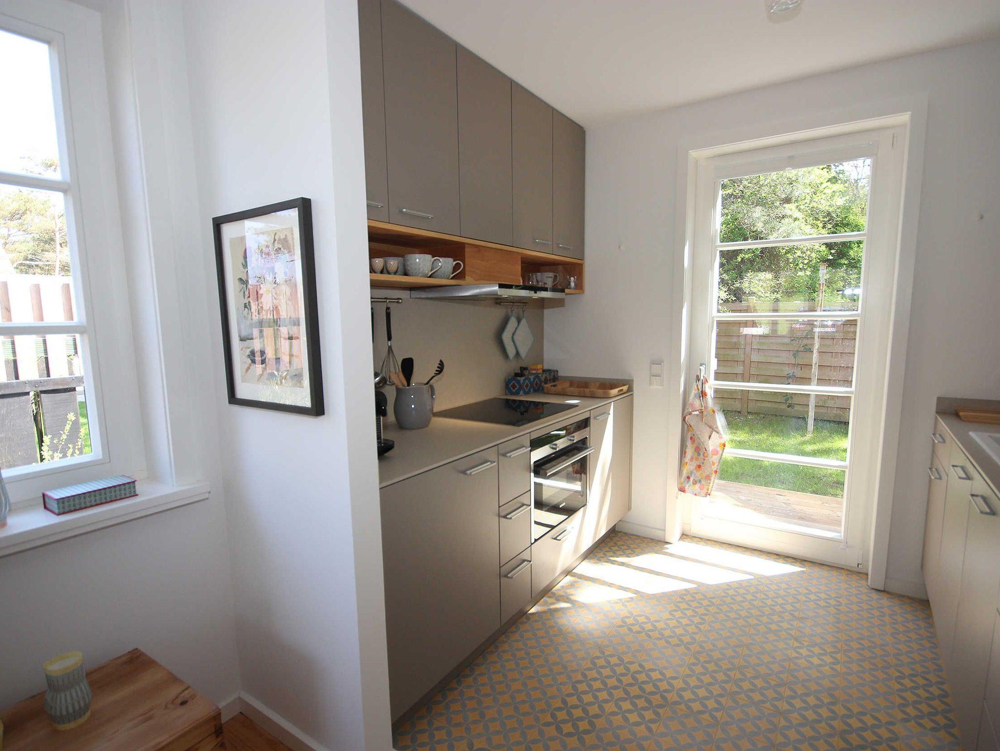 Im Erdgeschoss befindet sich der helle und großzügig gestaltete Wohnraum mit Essbereich. Die komfortabel ausgestattete Küchenzeile ist mit Backofen inklusive integrierter Mikrowelle, Geschirrspülmaschine, Espressomaschine, Wasserkocher und Toaster ausgestattet.