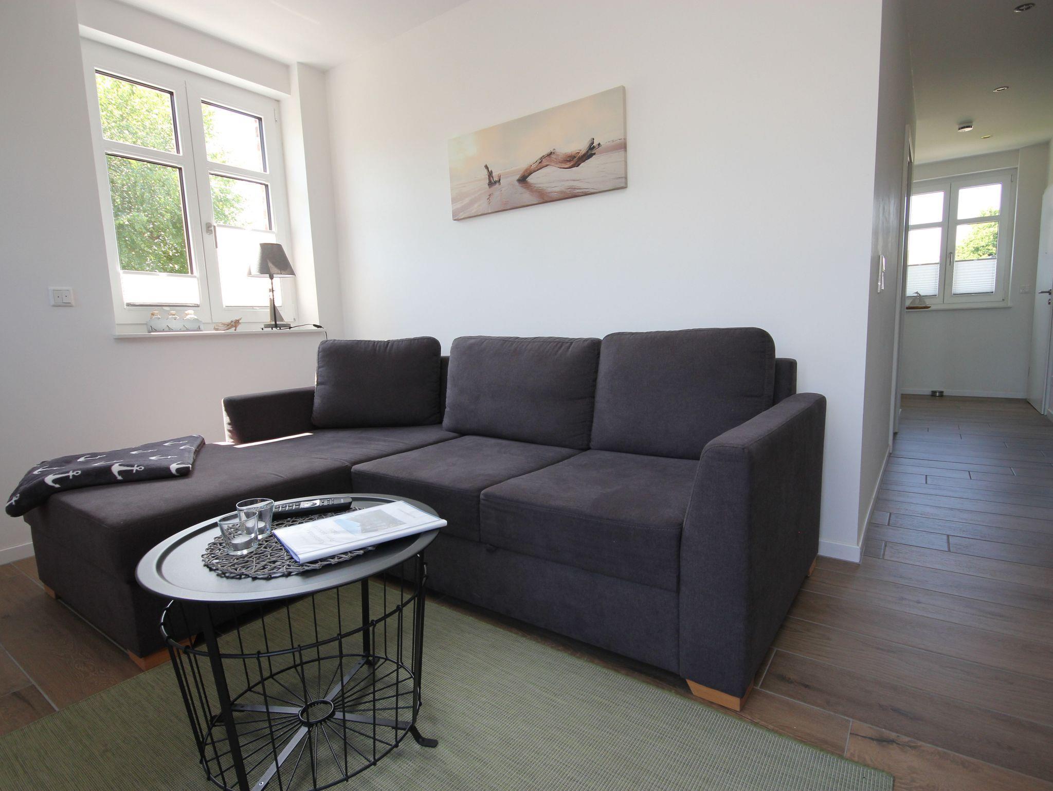 Die offene Wohnküche wurde mit SAT-TV, kostenlosem WLAN-Gastzugang, einer Küchenzeile und einer Schlafcouch ausgestattet.