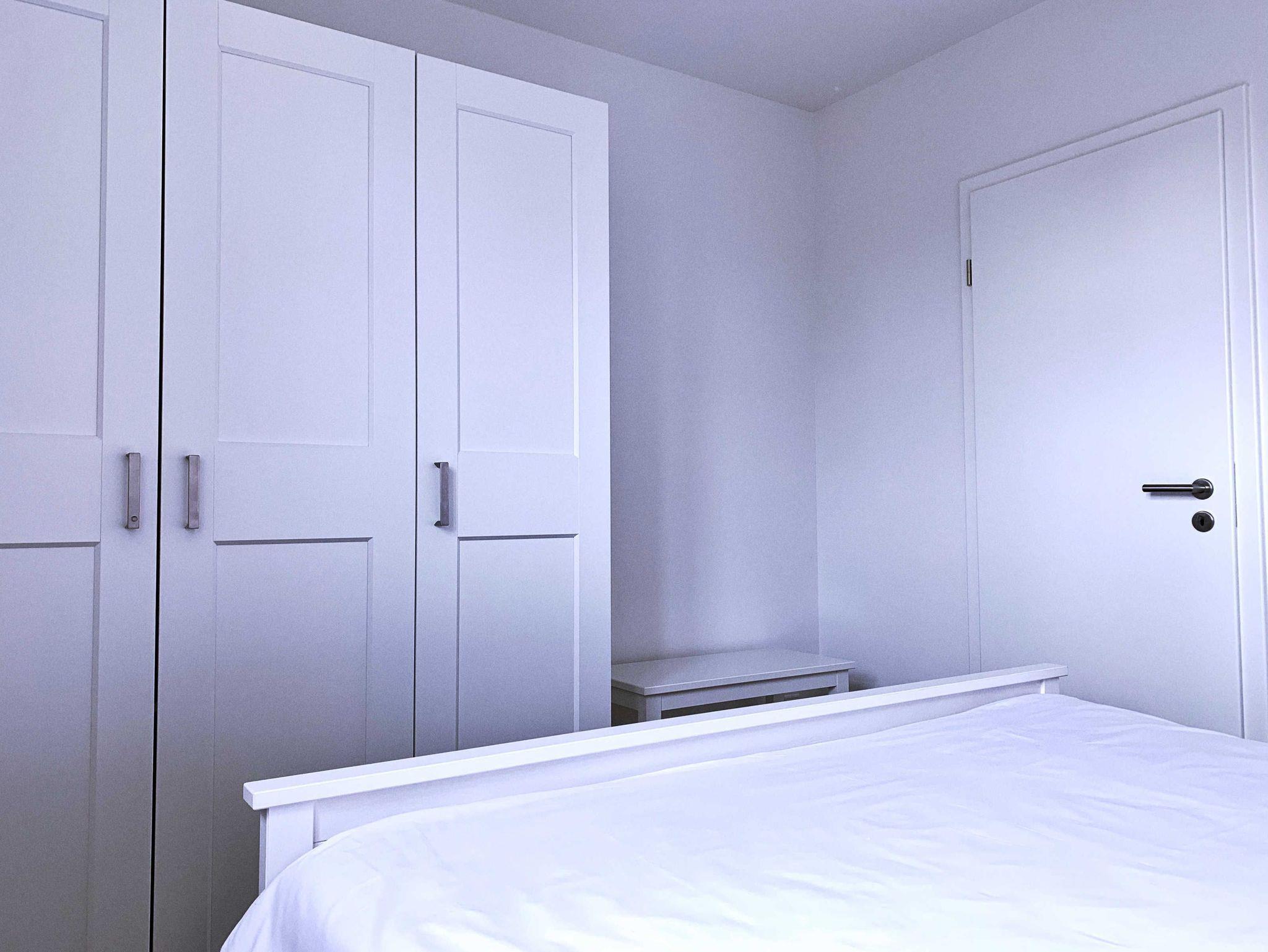 Der Schlafraum besitzt ein Doppelbett (1,60 x 2,00 m) mit getrennten Matratzen und einem Topper sowie einem Kleiderschrank mit genügend Stauraum. Bei Bedarf kann dort ein Kinderreisebett aufgestellt werden.