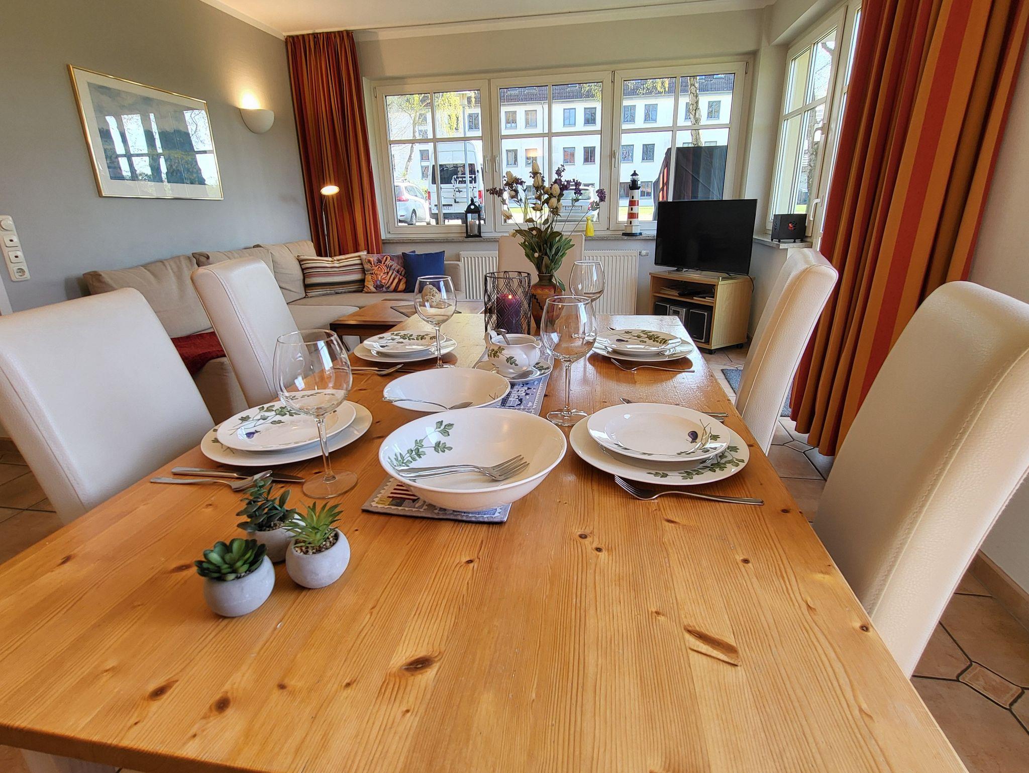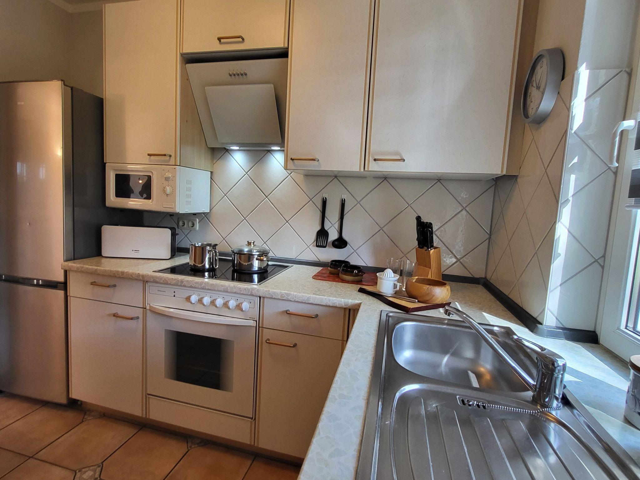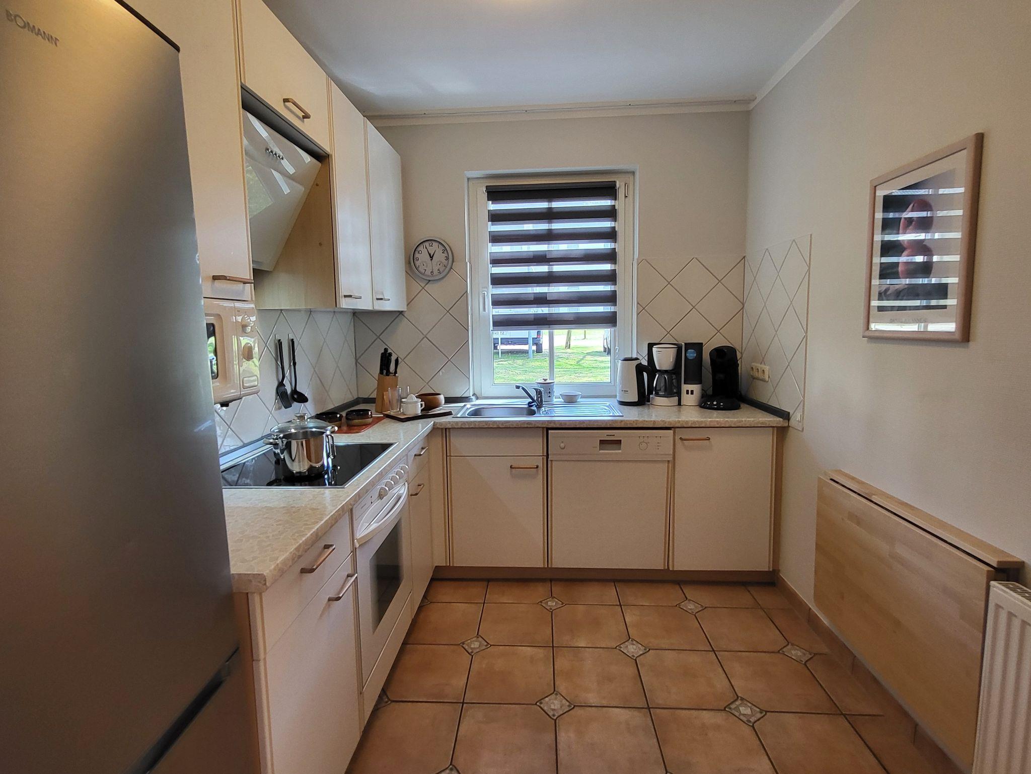 Die separate Küche ist mit einer Einbauküche mit Mikrowelle, Geschirrspüler, großzügiger Kühl- und Gefrierkombination und einem Herd mit Backofen ausgestattet, sodass der Zubereitung leckerer Mahlzeiten nichts im Wege steht. Kostenloses WLAN steht selbstverständlich auch bereit. Die Wohnung wird inklusive Bettwäsche übergeben. Handtücher können in der Zimmervermittlung für 7,00 pro Person (1 Badetuch, 1 Handtuch) dazugebucht werden.