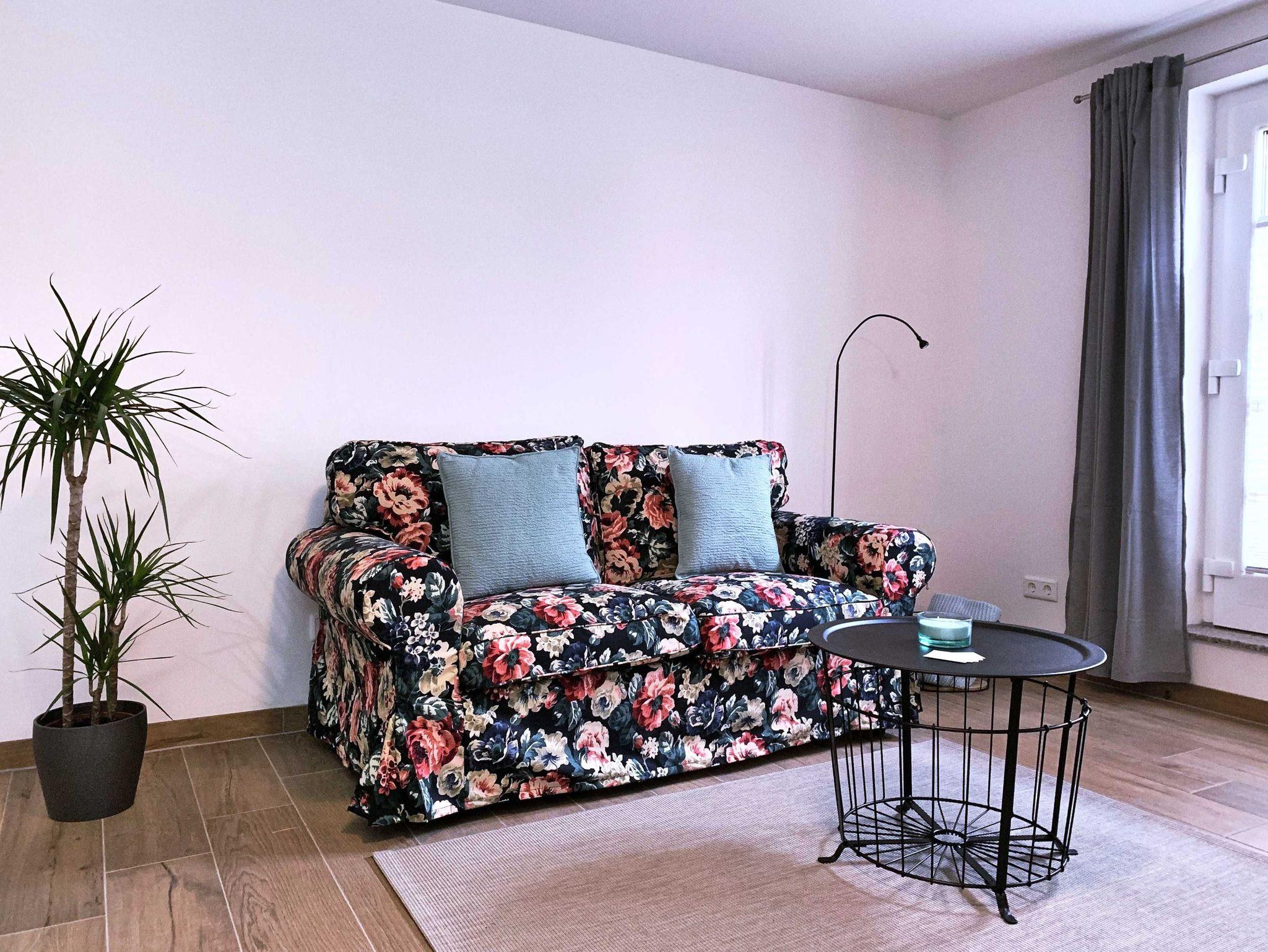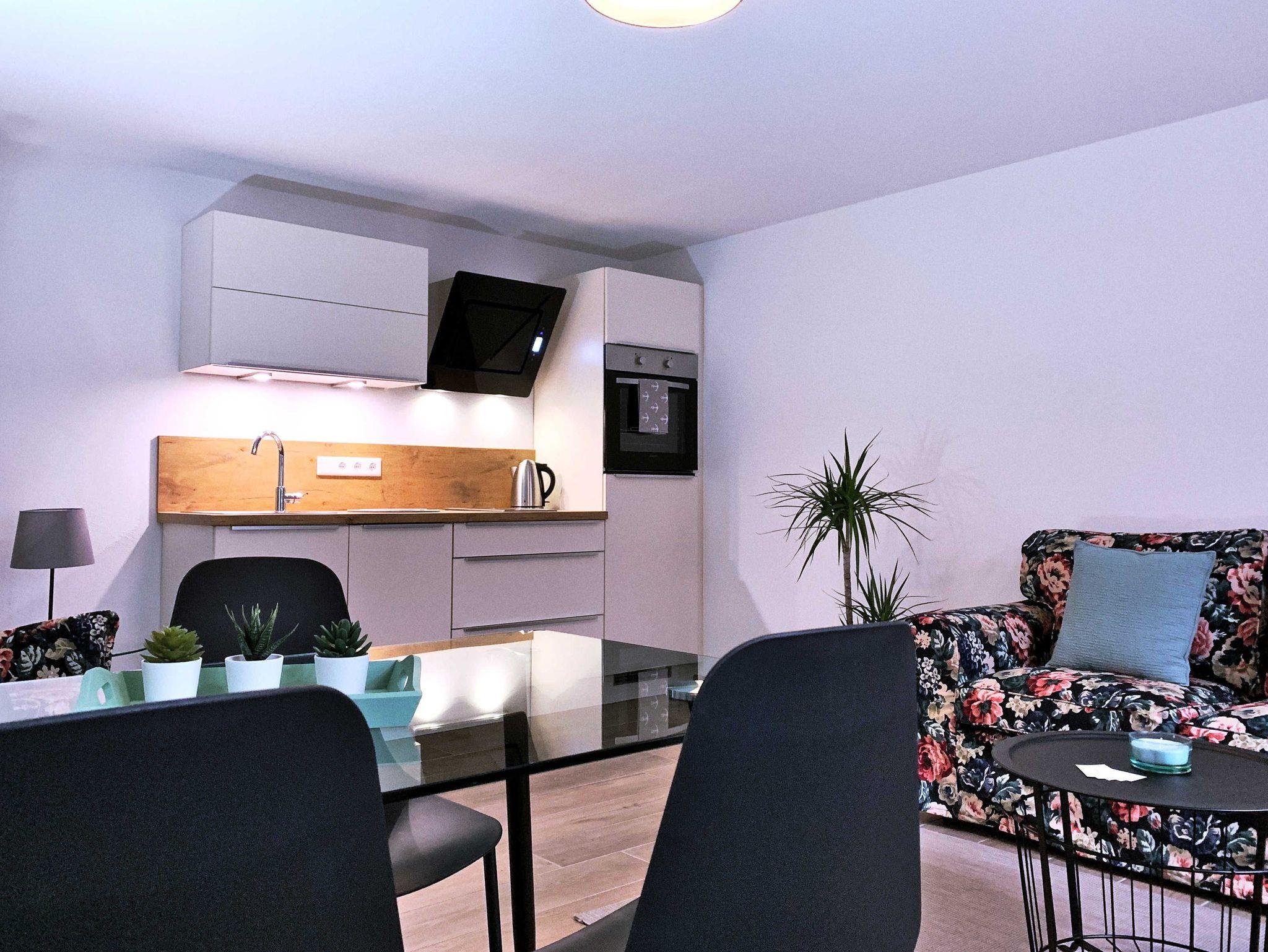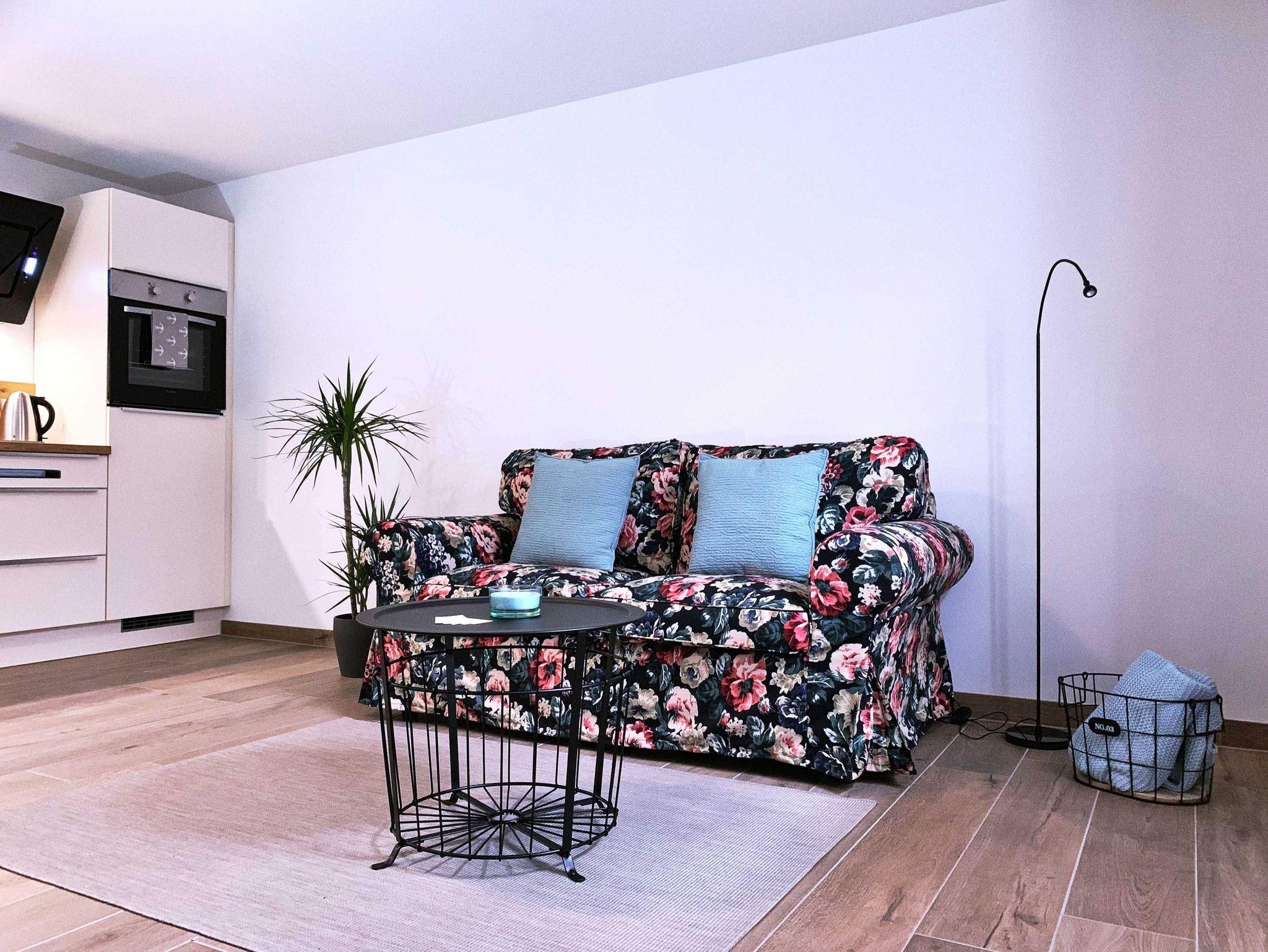 Die offene Wohnküche wurde mit SAT-TV, kostenlosem WLAN-Gastzugang, einer Küchenzeile sowie einer Couchgarnitur mit Ohrensessel ausgestattet.