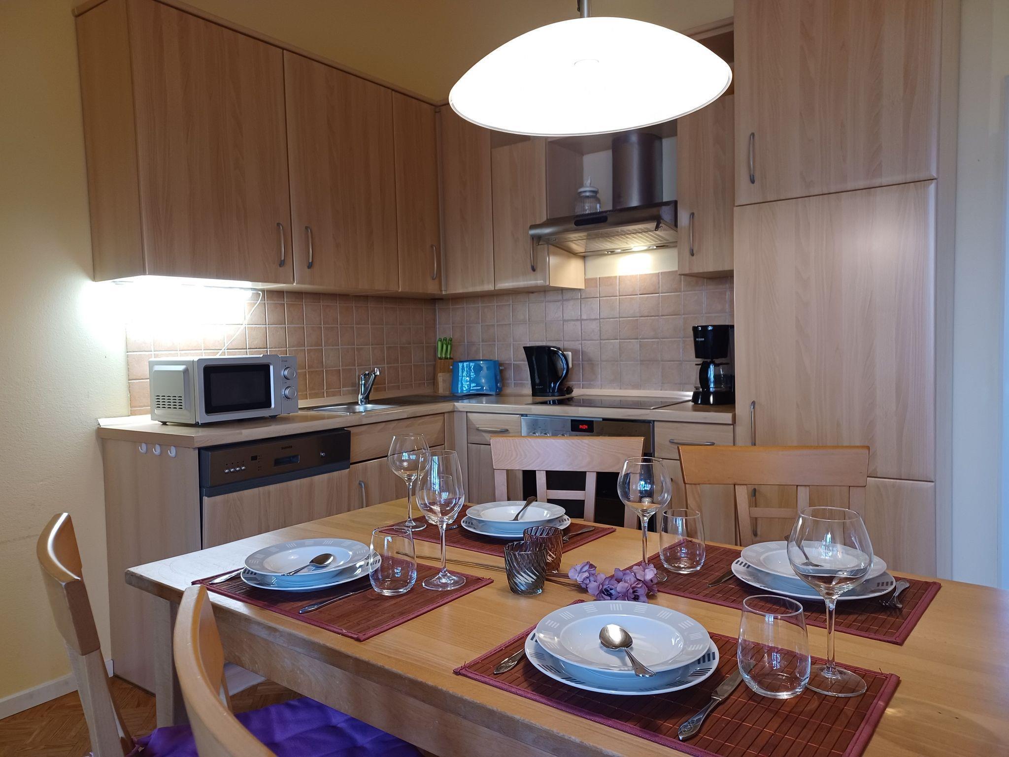 Der offene Wohn- und Küchenbereich ist geschmackvoll eingerichtet und ist mit einem Kaminofen, einem TV mit USB/HDMI und Radio ausgestattet. Zur Ausstattung der offenen Küchenzeile gehört eine Kaffeemaschine, Wasserkocher, Kühlschrank mit Gefrierfach, Mikrowelle, Geschirrspüler und Herd mit Cerankochfeld und Backofen.