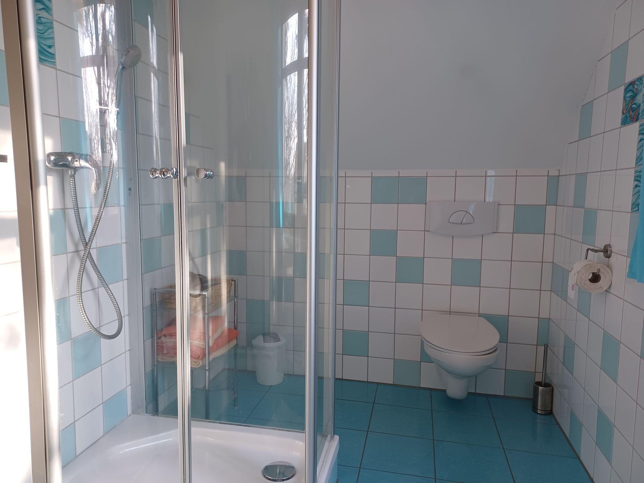 Das Badezimmer ist mit Dusche, WC und Fön ausgestattet.