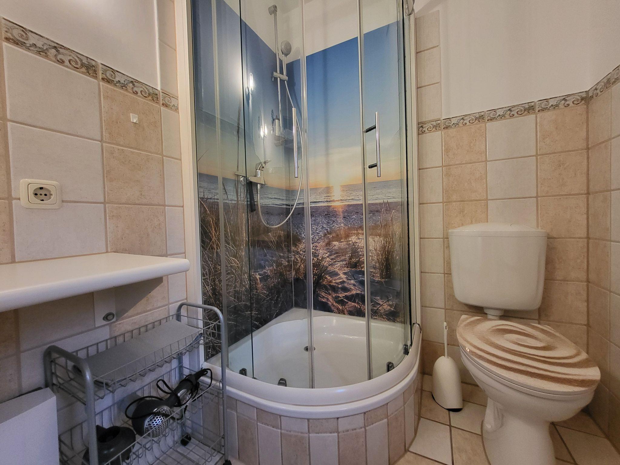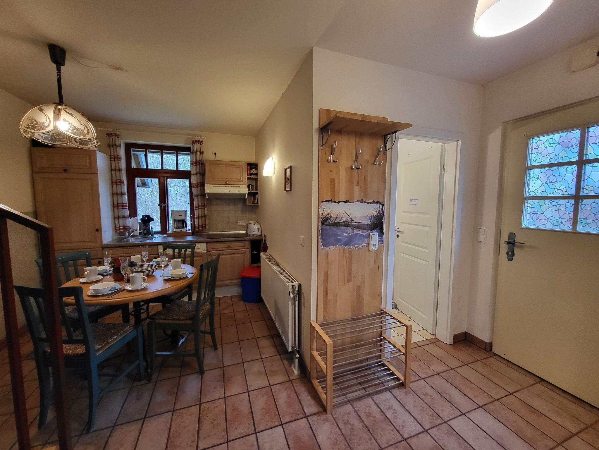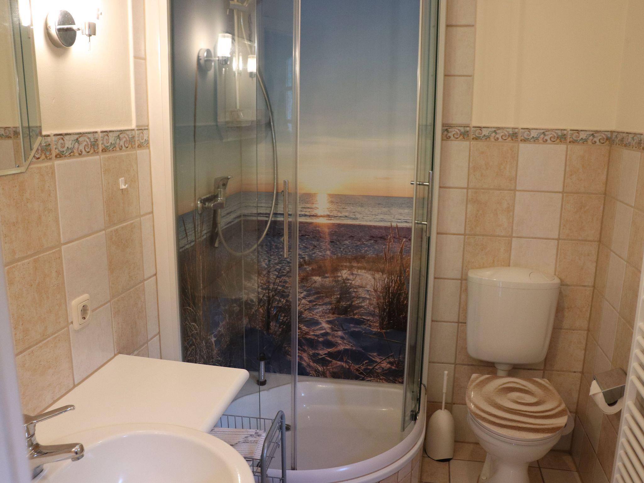 Im Erdgeschoss befindet sich ein Bad mit Dusche und WC, sowie ein Wohnzimmer mit SAT- TV. Die offene Küchenzeile ist ausgestattet mit einem Essbereich, Geschirrspüler, Induktionskochfeld, kleiner Minibackofen, Kühlschrank mit Gefrierfach, Kaffeemaschine und Wasserkocher.