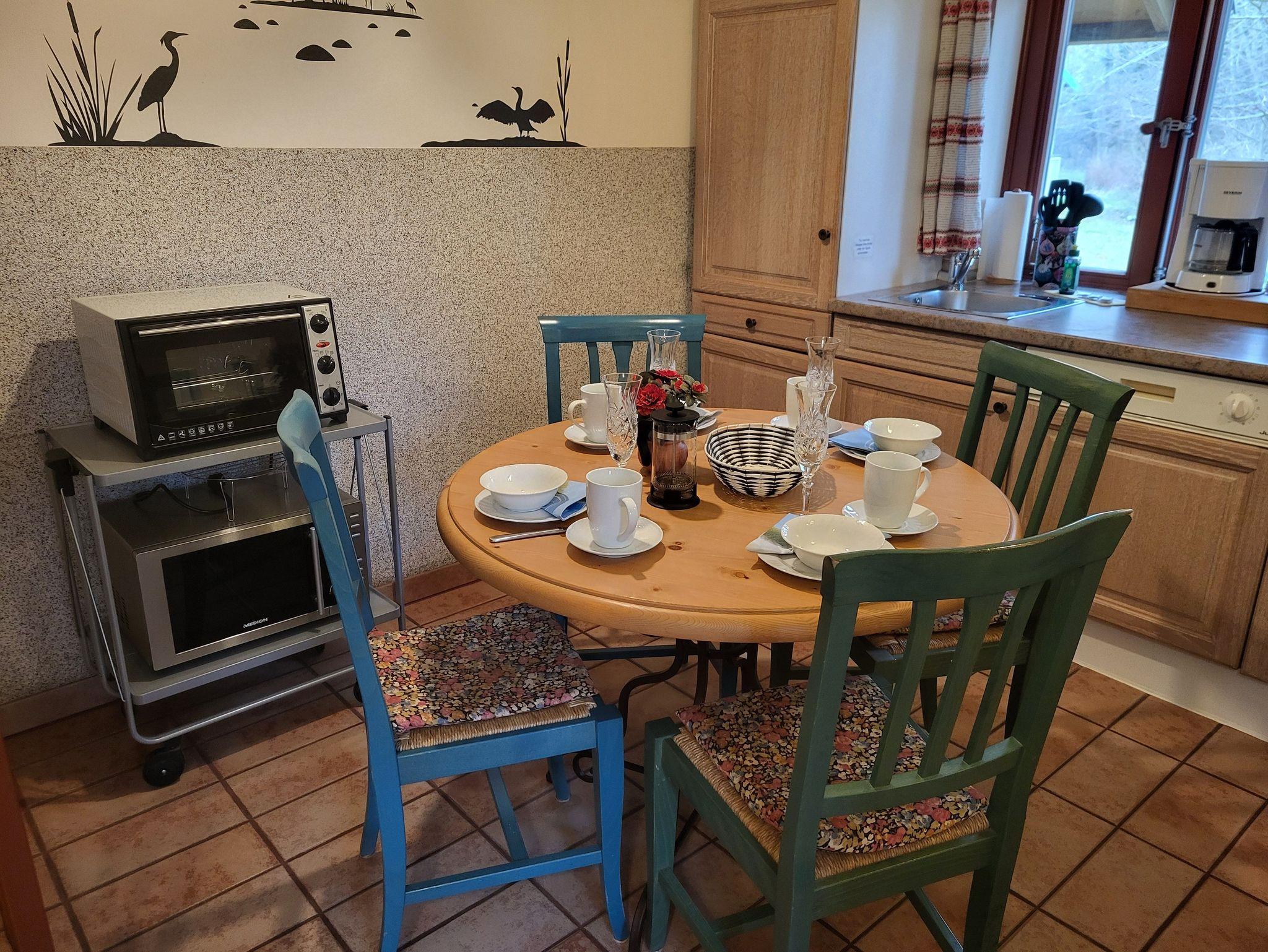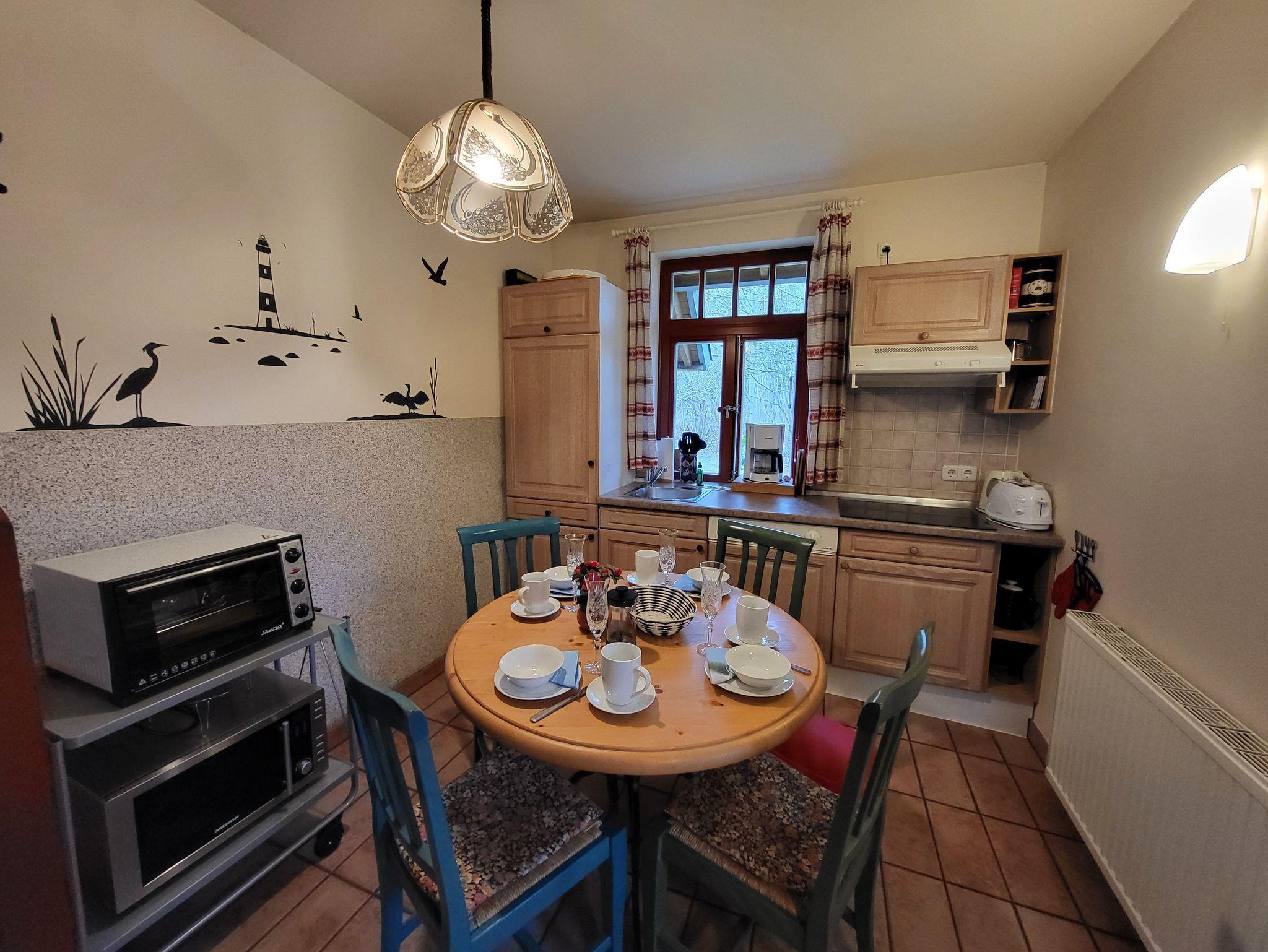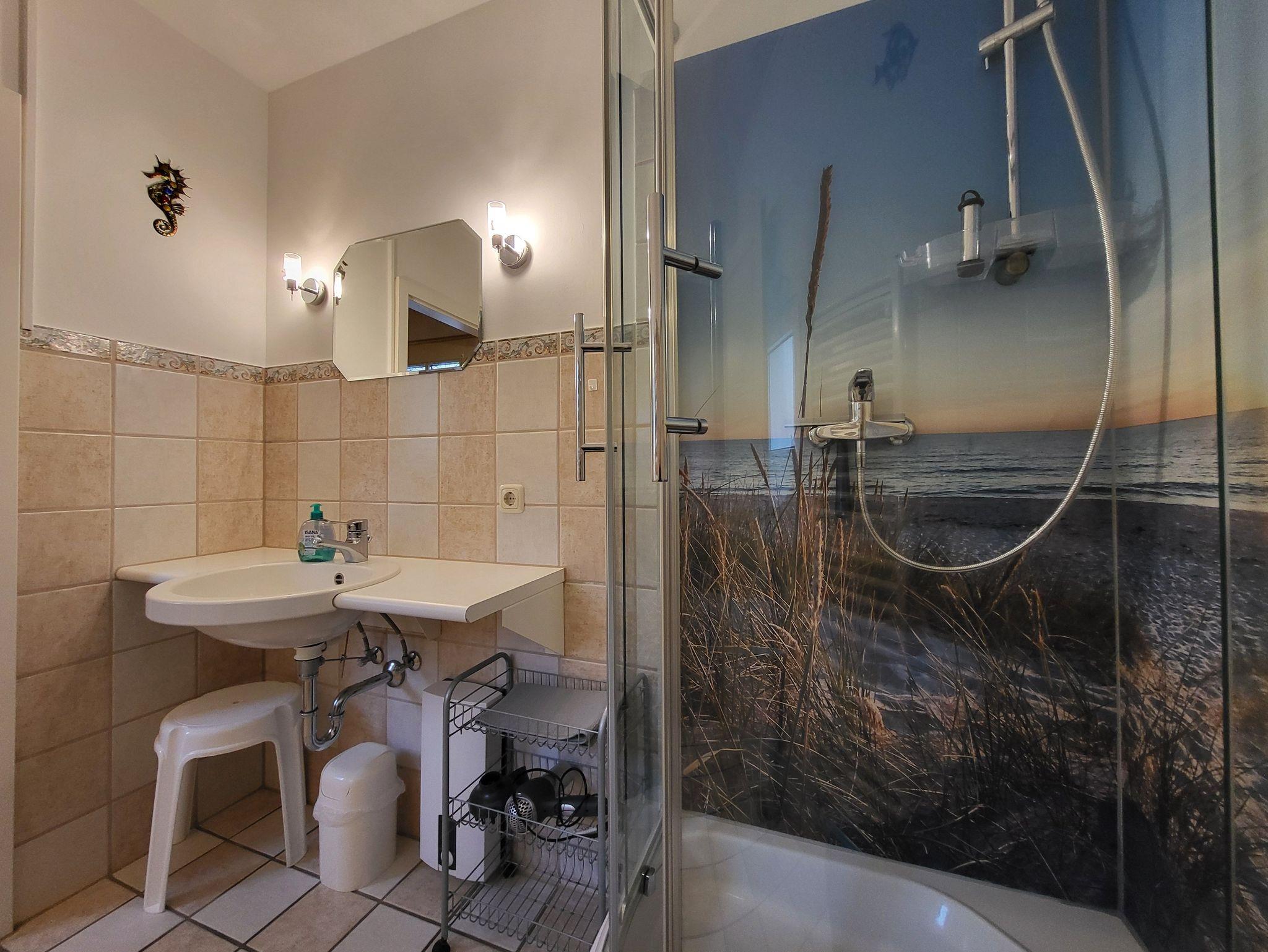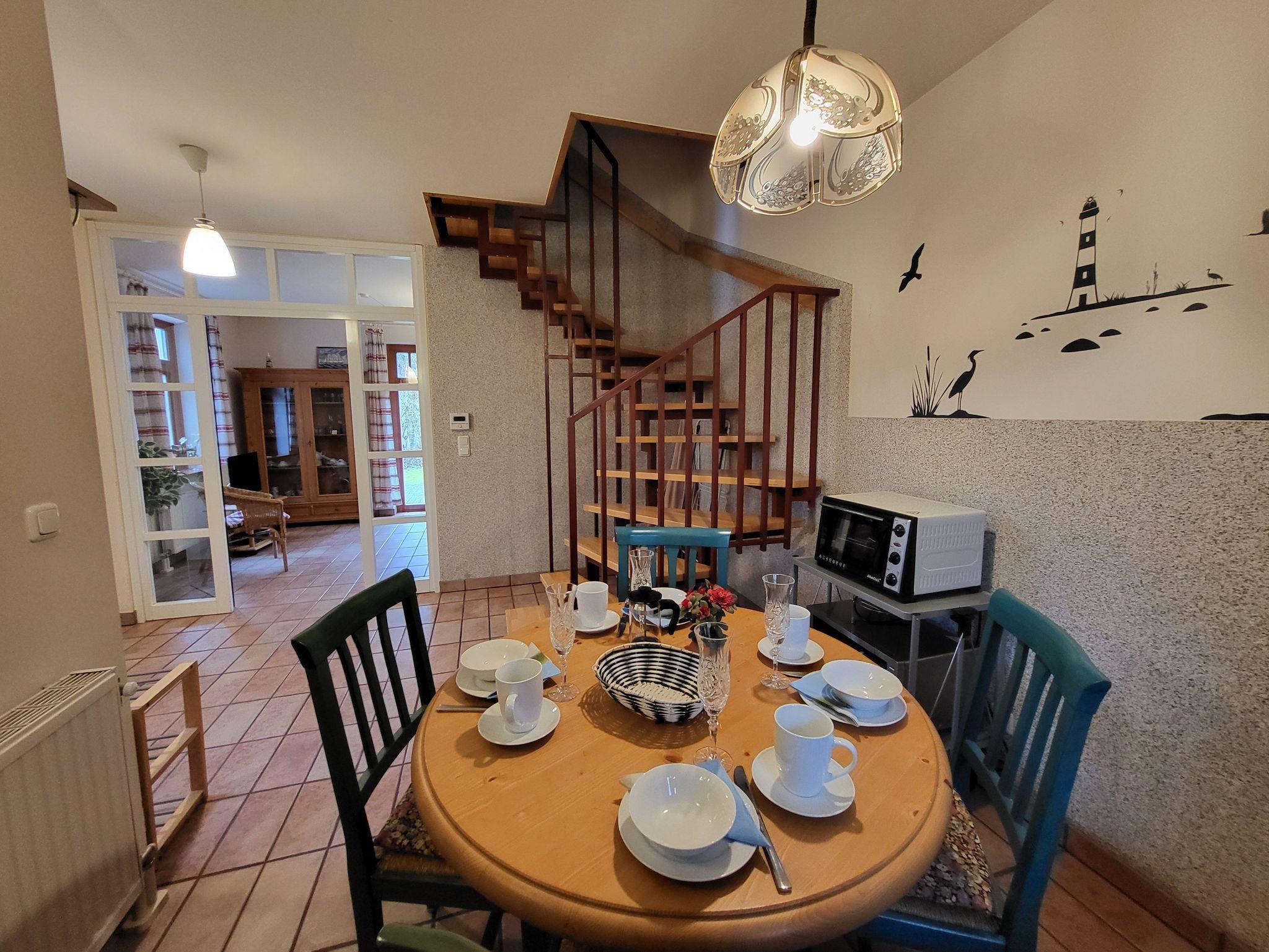 Im Erdgeschoss befindet sich ein Bad mit Dusche und WC, sowie ein Wohnzimmer mit SAT- TV. Die offene Küchenzeile ist ausgestattet mit einem Essbereich, Geschirrspüler, Induktionskochfeld, kleiner Minibackofen, Kühlschrank mit Gefrierfach, Kaffeemaschine und Wasserkocher.