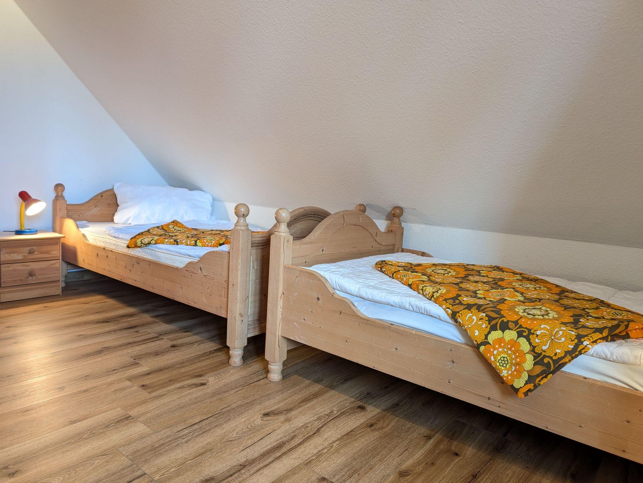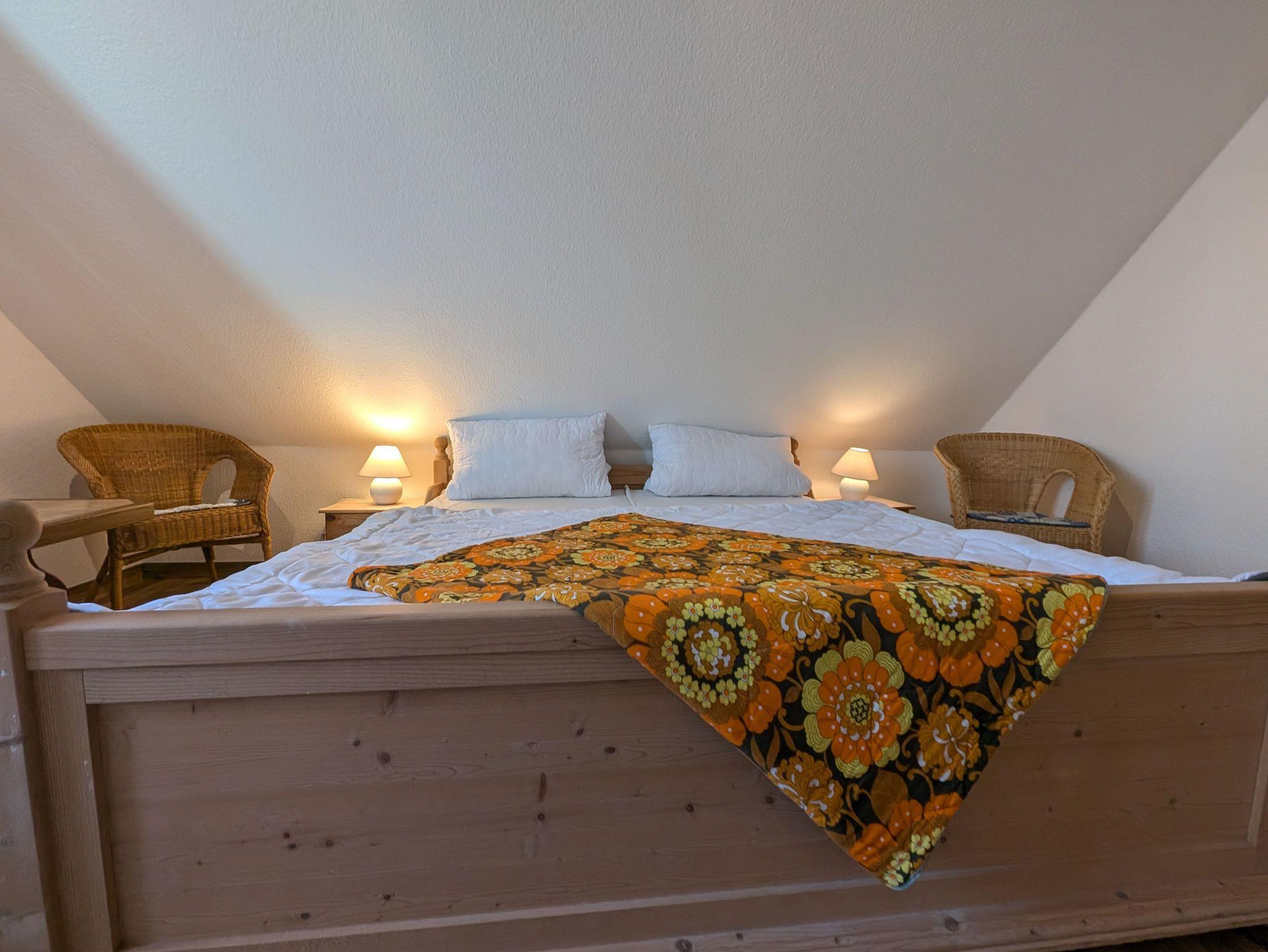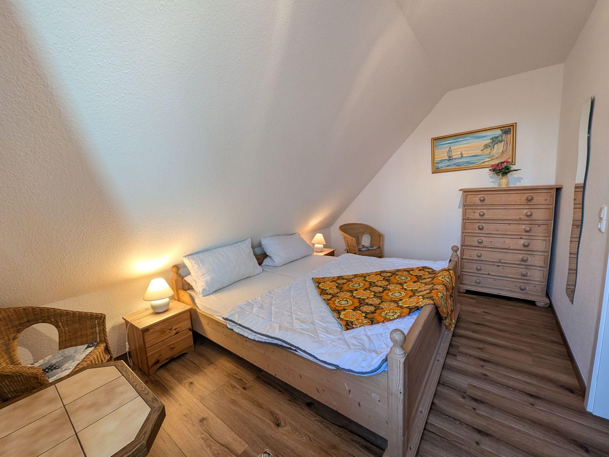 Im Obergeschoss befinden sich 2 Schlafzimmer, die bis zu 4 Personen Platz bieten und mit Mückenschutz ausgestattet sind. Das 1. Schlafzimmer ist ausgestattet mit einem Doppelbett 1,80 x 2,00 m (getrennte Matratzen) und das 2. Schlafzimmer mit zwei Einzelbetten (jeweils 0,90 x 2,00 m). Bettwäsche und Handtücher sind nicht inklusive, können aber über die Zimmervermittlung dazu gebucht werden (12,50 € pro Bettwäsche- Set und 7,00 € pro Handtuchpaket - (1 Badetuch, 1 Handtuch).