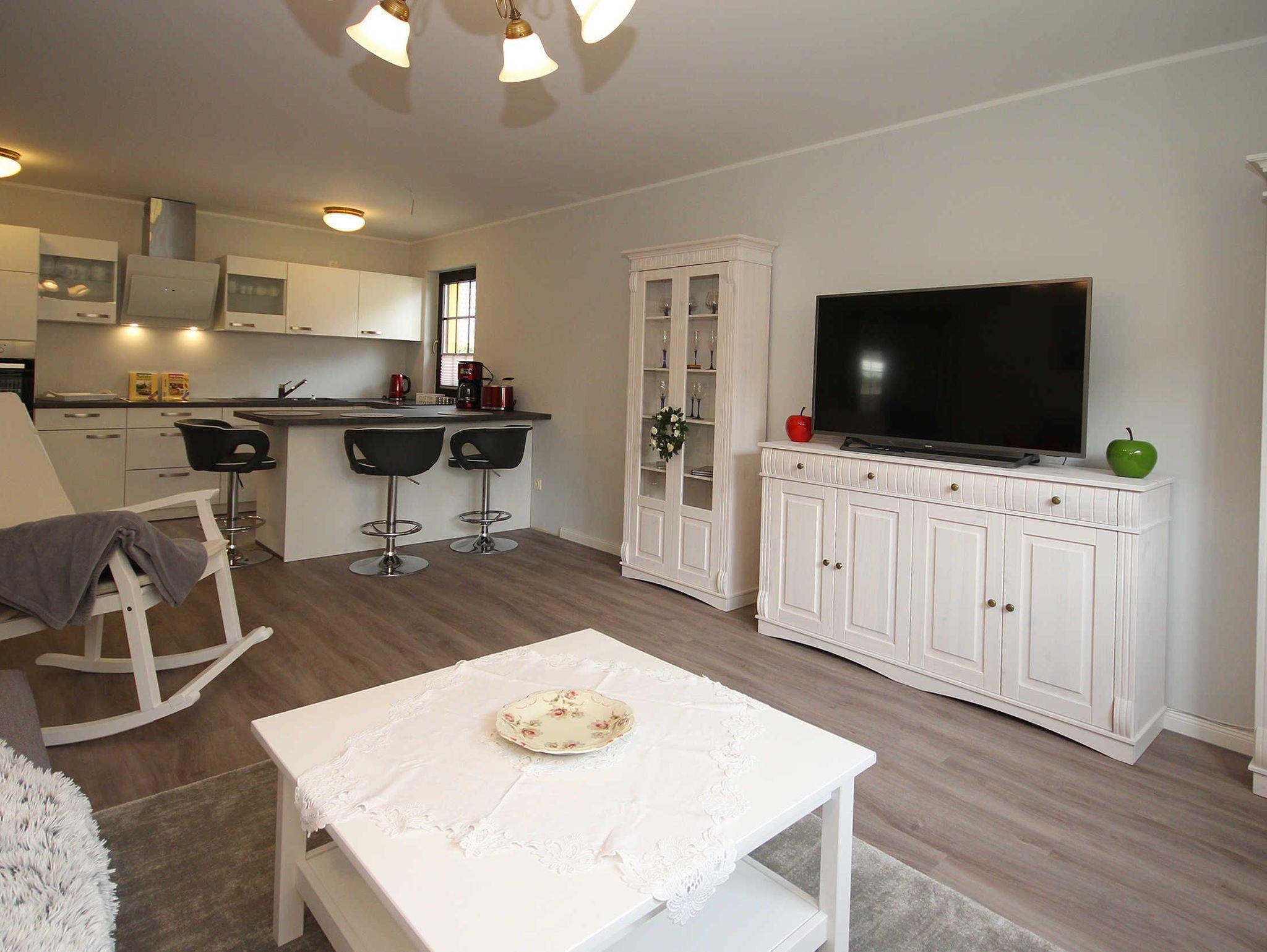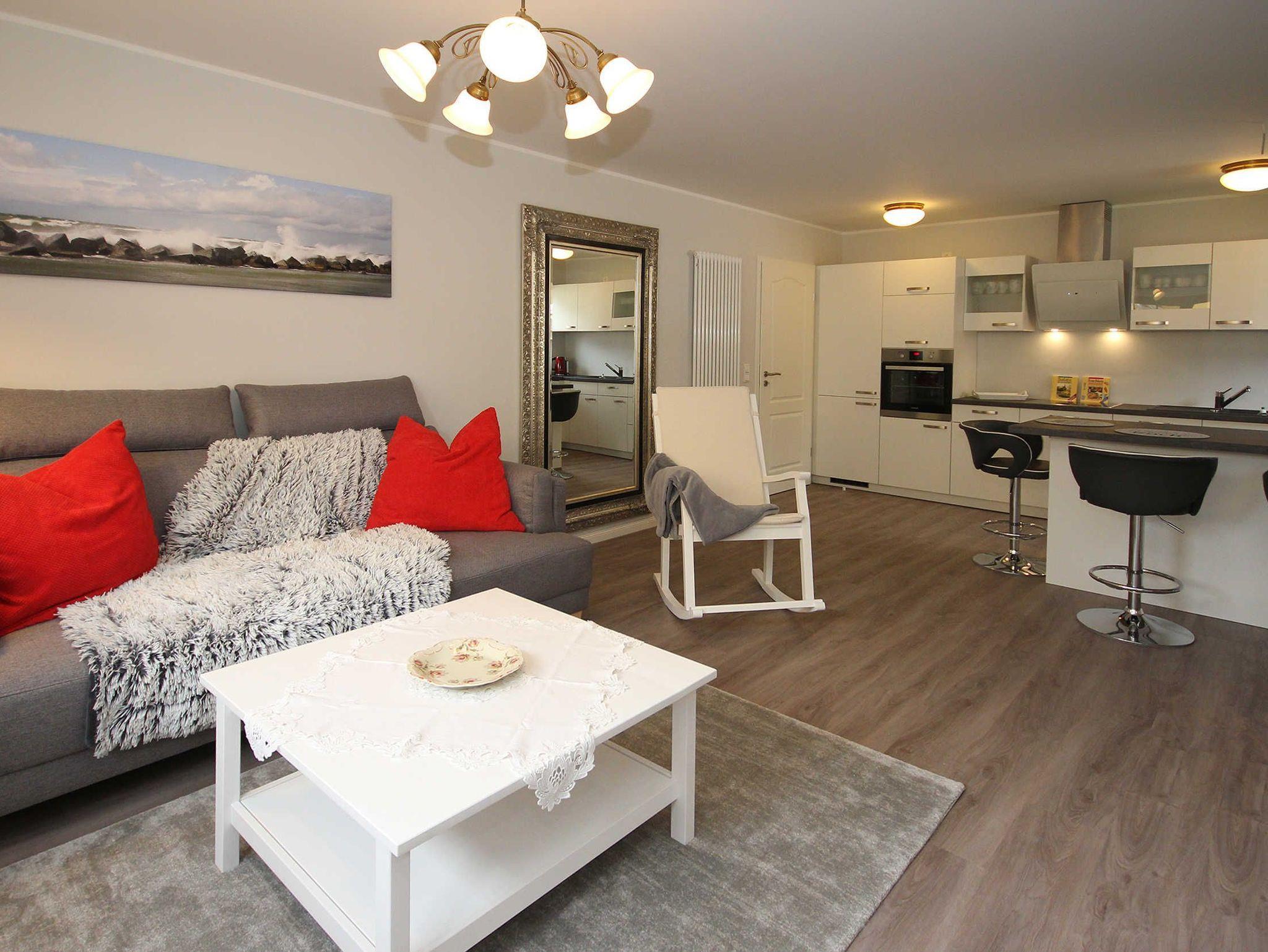 die neue und komfortable Ferienwohnung mit liebevoller Ausstattung zum Detail und separatem Eingang liegt im Erdgeschoss. Genießen Sie die Ostseitige Terrasse mit einer gemütlichen Sitzecke auf der Terrasse, beim Frühstück oder lassen Sie den Abend am Strand in 250 m Entfernung ausklingen.Das Wohnzimmer verfügt über eine gemütliche Couch, kostenlosen WLAN- Gastzugang und SAT-TV. An das Wohnzimmer schließt sich die offene Küchenzeile an und lädt Sie zum Kochen ein und ist ausgestattet mit einer Kühl- Gefrierkombination, Cerankochfeld und Backofen in Augenhöhe. Das separate Schlafzimmer verfügt über ein Doppelbett 1,80 x 2,00 m (durchgehende Matratzen) und einem Kleiderschrank mit viel Stauraum.In der Ferienwohnung ist die Bettwäsche nicht vorhanden, die Handtücher können in der Zimmervermittlung für 7,00 € pro Person (1 Badetuch, 1 Handtuch) dazugebucht werden. Eine Fußbodenheizung im Bad und einer ebenerdigen Dusche runden das Bild ab. Für unsere Gäste sind die Fahrräder inclusive . Unsere Wohnungen sind Nichtraucherwohnungen. Die Kaution beträgt 100,- € und wird nach Abreise zurücküberwiesen.