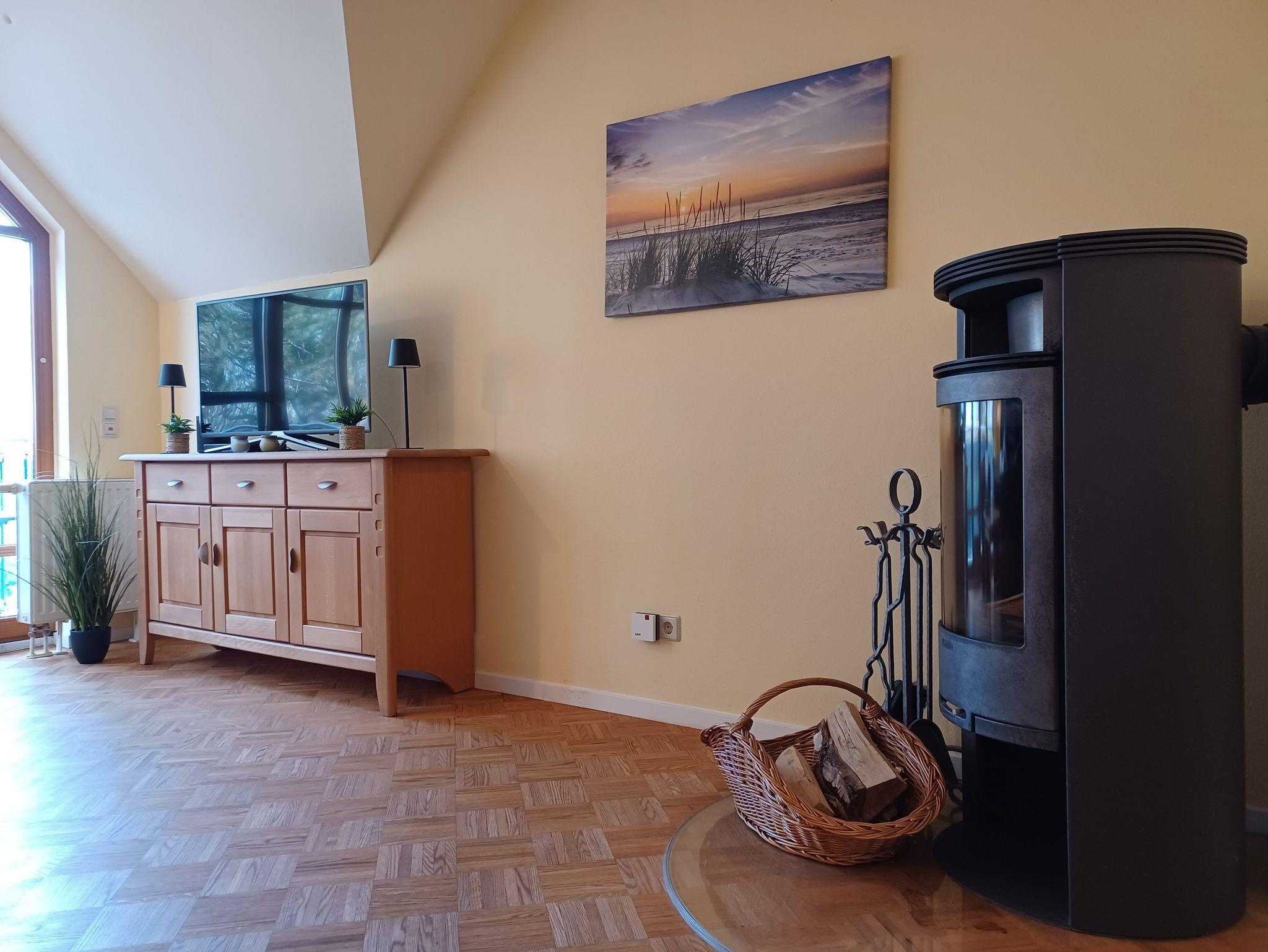 Der offene Wohn- und Küchenbereich ist geschmackvoll eingerichtet und ist mit einem Kaminofen, einem TV mit USB/HDMI und Radio ausgestattet. Zur Küchenausstattung gehören Kaffeemaschine, Wasserkocher, Kühlschrank mit Gefrierfach, Mikrowelle, Geschirrspüler und Herd mit Cerankochfeld und Backofen .