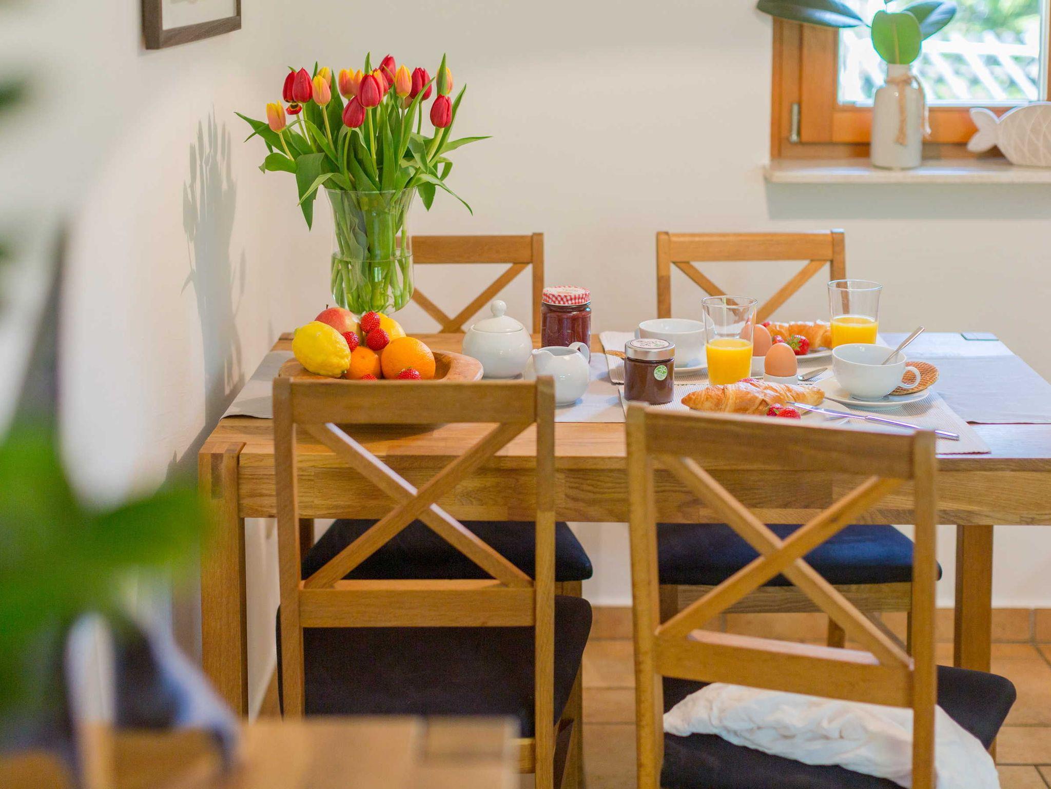 Die Küche ist eine komplett eingerichtete Küche und bietet u.a. Spülmaschine, 2-Felder-Ceran-Kochfeld, Kaffeemaschine, Toaster, Wasserkocher und eine Mikrowelle sowie einen großen Esstisch für 4 Personen. Der Kühlschrank besitzt ein Gefrierfach.