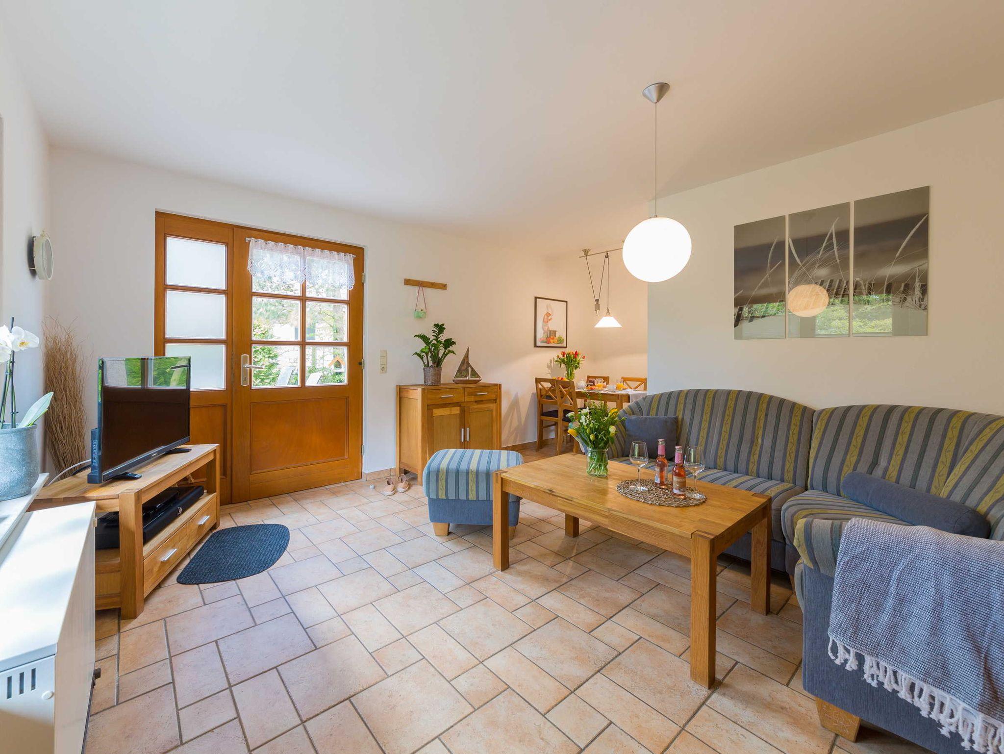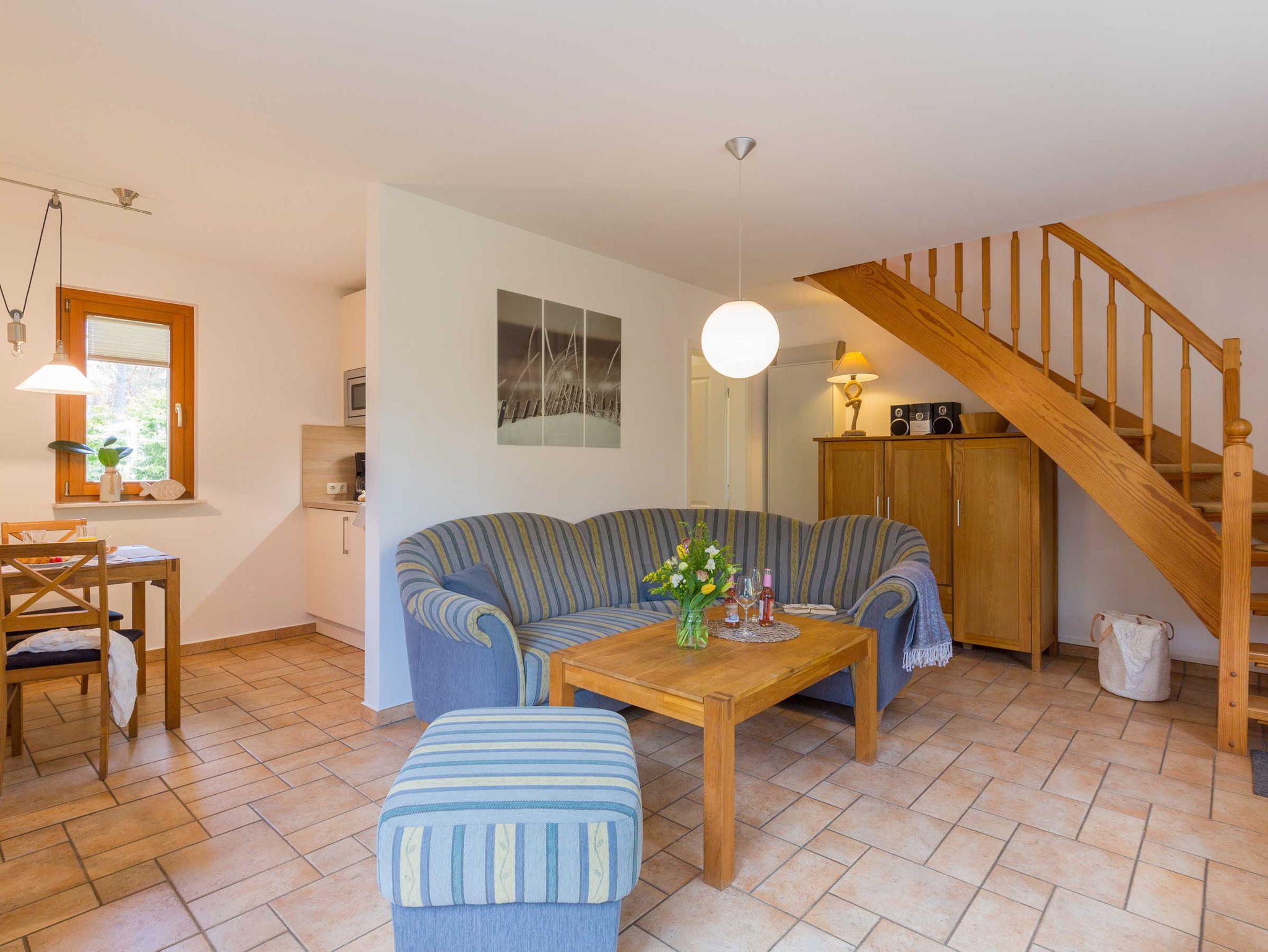 Das Ferienhaus in Wustrow ist ca. 60 qm groß und bietet Platz für bis zu 4 Personen. Im Erdgeschoss gibt einen großzügigen Wohnbereich, der mit einer offenen Küche kombiniert ist. Der Wohnbereich ist mit Couchgarnitur und Flachbildfernseher ausgestattet.