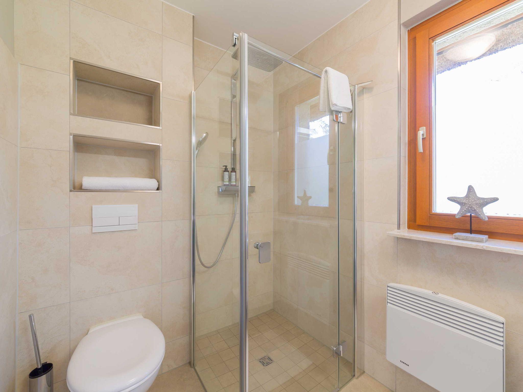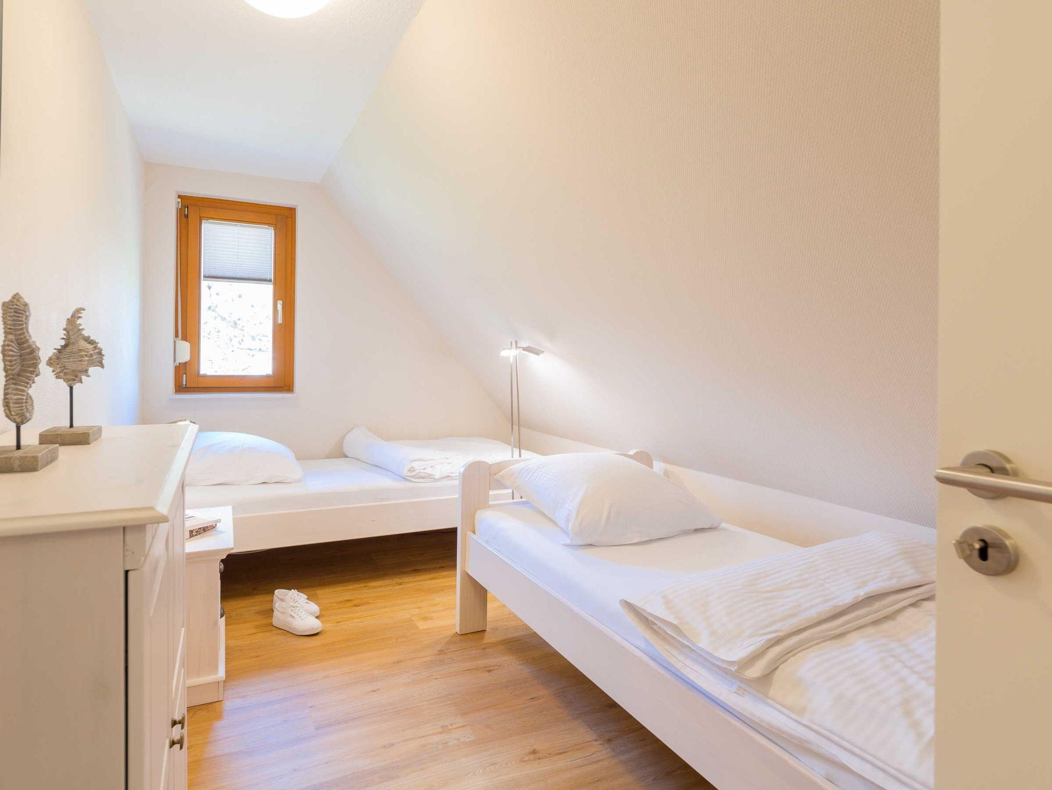 Im Obergeschoss gibt es ein Schlafzimmer mit Doppelbett und ein Schlafzimmer mit zwei Einzelbetten. Das Badezimmer hat Dusche/WC.