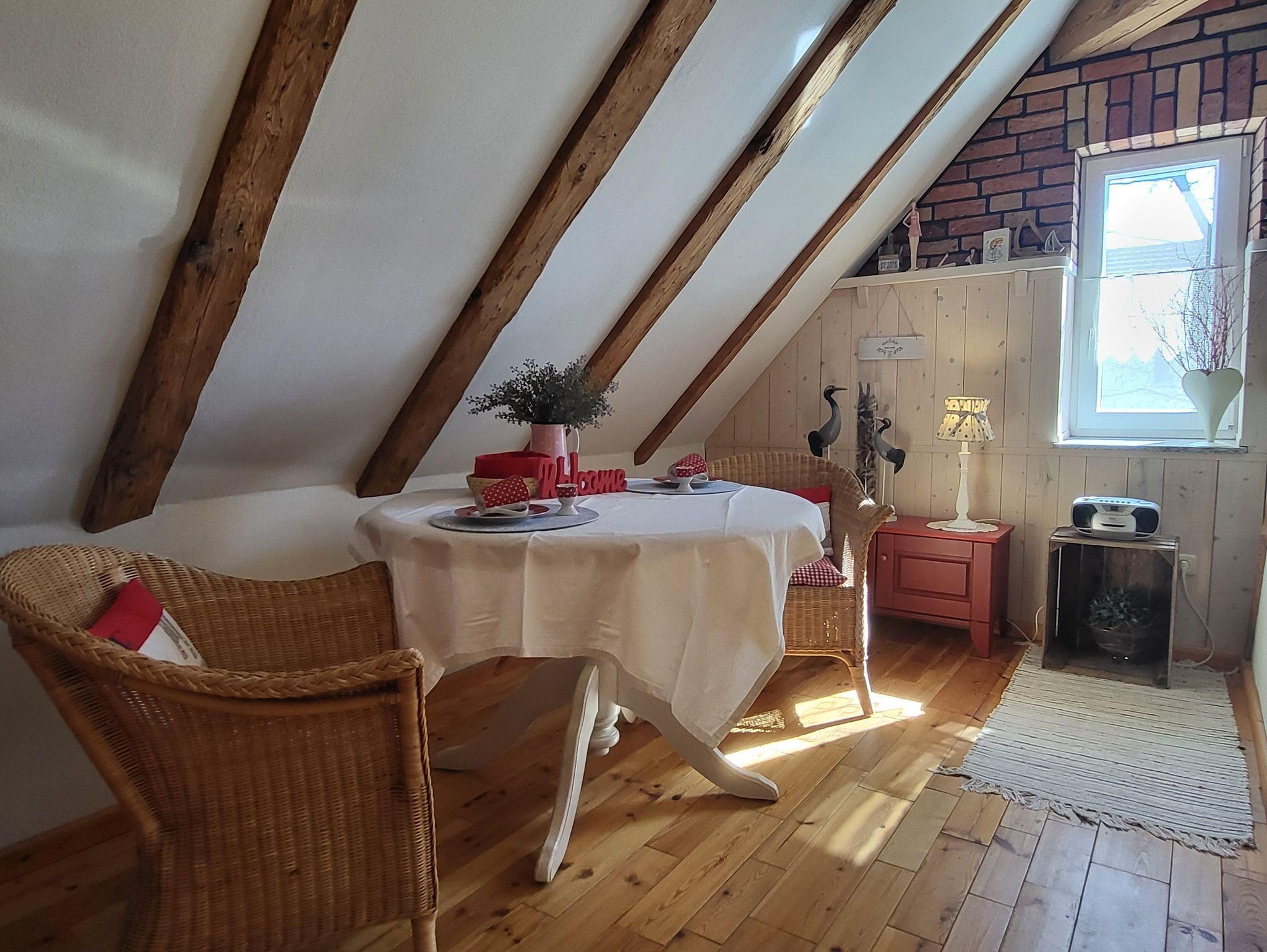 die Ferienwohnung im Obergeschoss erstreckt über 2 Etagen. Schlafen unterm Sternenhimmel im Dachgeschoss, mit Doppelbett 2,00 x 1,80 m (getrennte Matratzen). Liebevoll und fachgerecht 2017 grundsaniert, alles wurde mit natürlichen Baustoffen hergerichtet. Freigelegtes altes Sichtfachwerk und Naturholzböden zeigen die Persönlichkeit der Wohnung. Naturholzmöbel sorgen für ein wohnliches Ambiente. Der offene Wohnstil mit komplett ausgestatteter Küchenzeile, ein lichtdurchflutetes Bad und der großzügige Wohnraum sorgen für Gemütlichkeit. Im großen naturbelassenen Garten lädt eine sonnige Gemeinschaftsterrasse am alten Apfelbaum zum verweilen ein.Ein Parkplatz befindet sich auf dem Grundstück. Die Wohnung ist nicht geeignet für Kinder unter 6 Jahren. Die Ferienwohnung wir mit Bettwäsche und Handtücher übergeben.