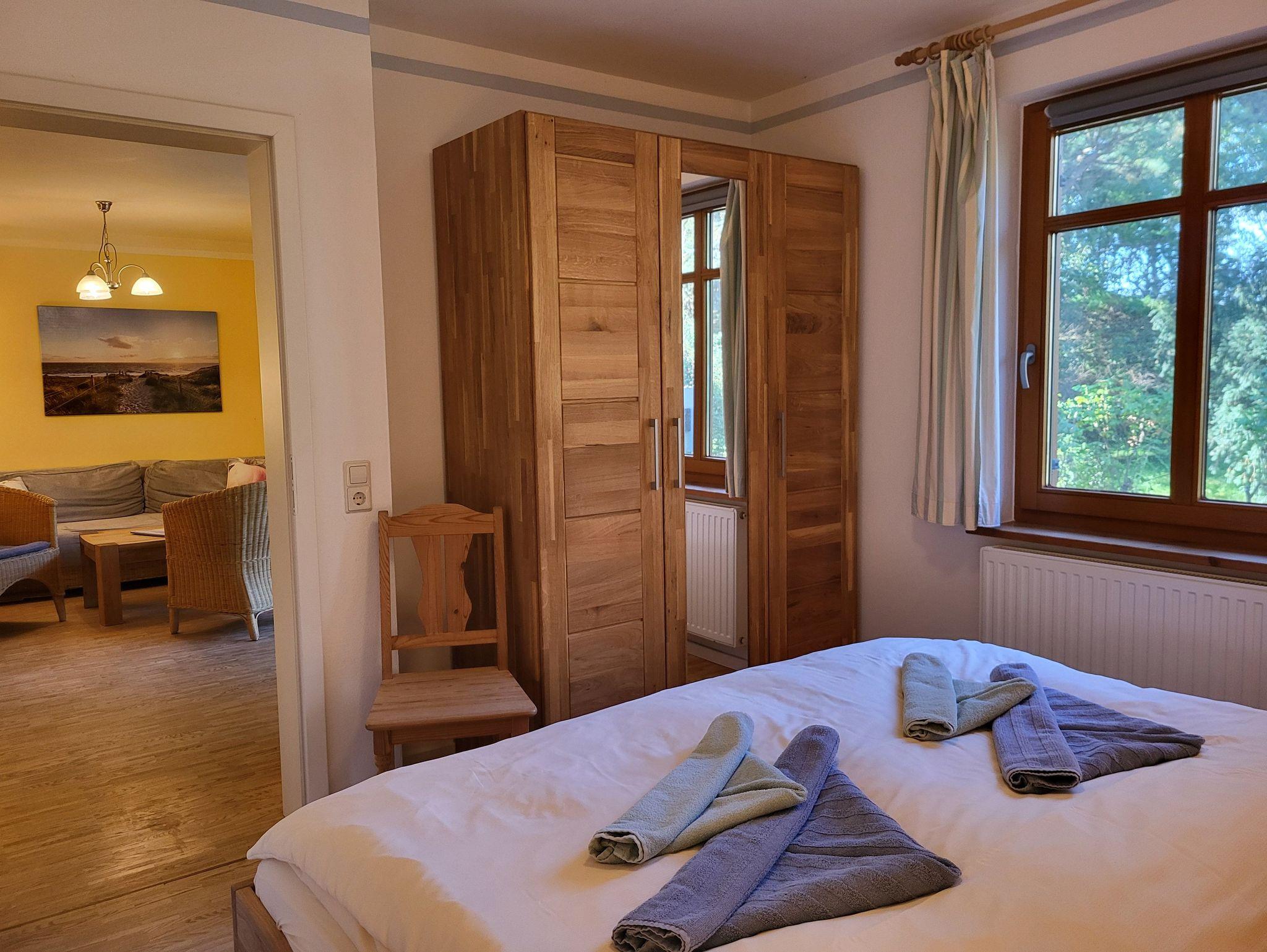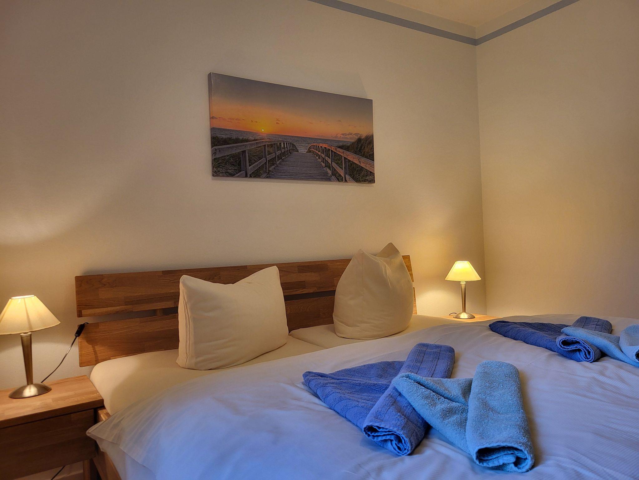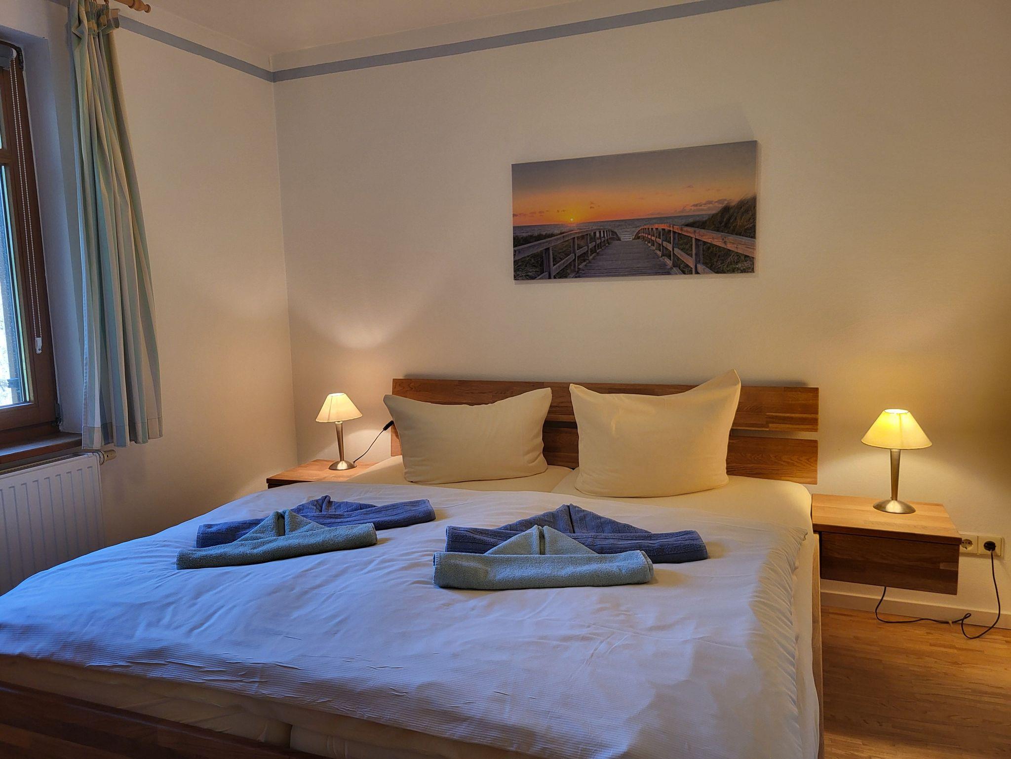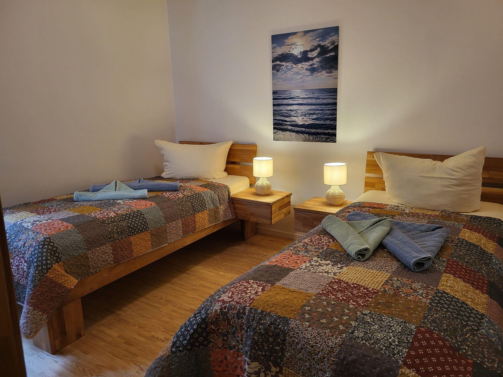 Die Ferienwohnung 2 befindet sich im Erdgeschoss und verfügt über 2 Schlafzimmer mit Doppelbetten (jeweils 1,80 x 2,00 m mit getrennten Matratzen). Die Bettwäsche und Handtücher sind für Sie inklusive.