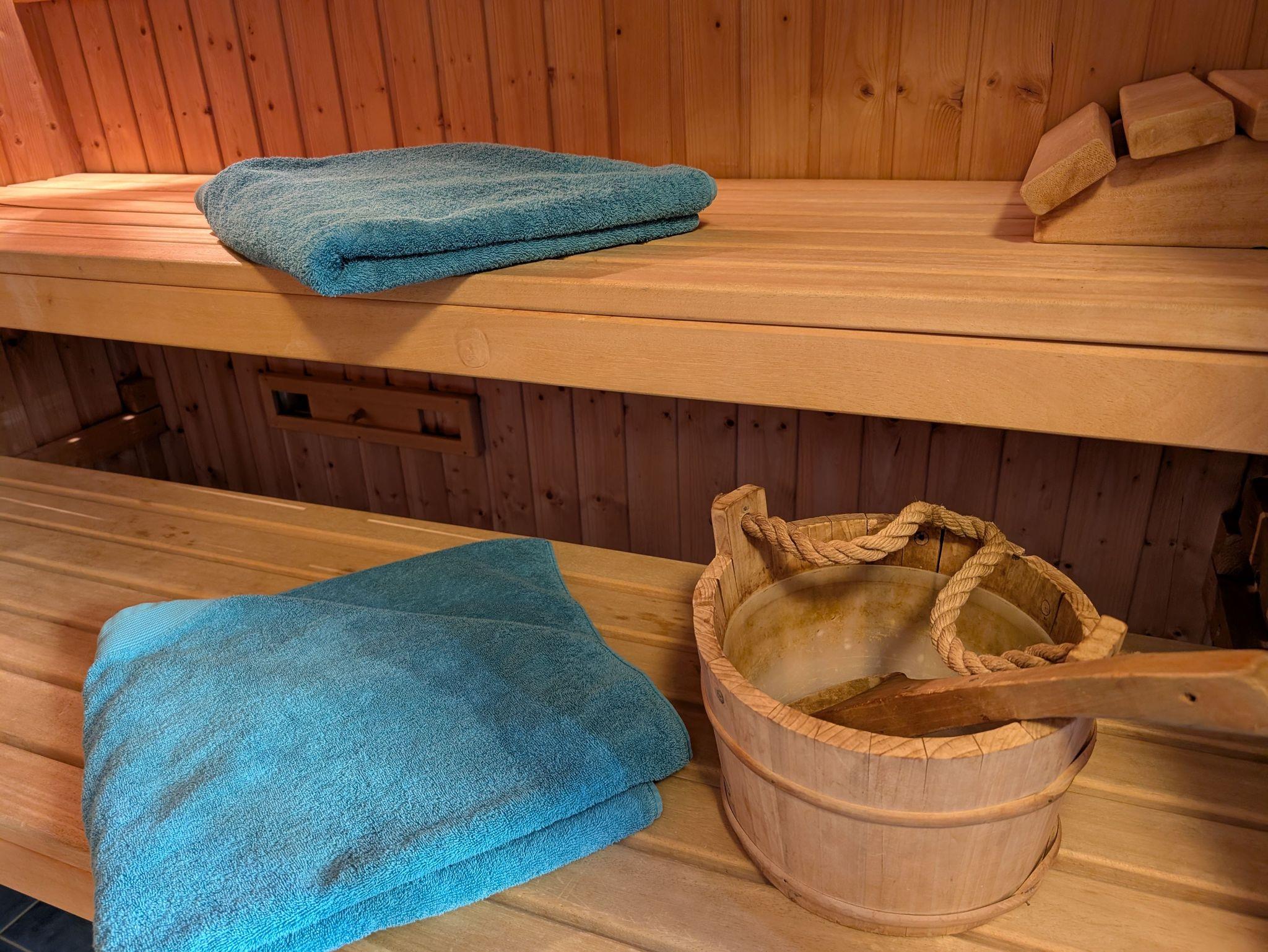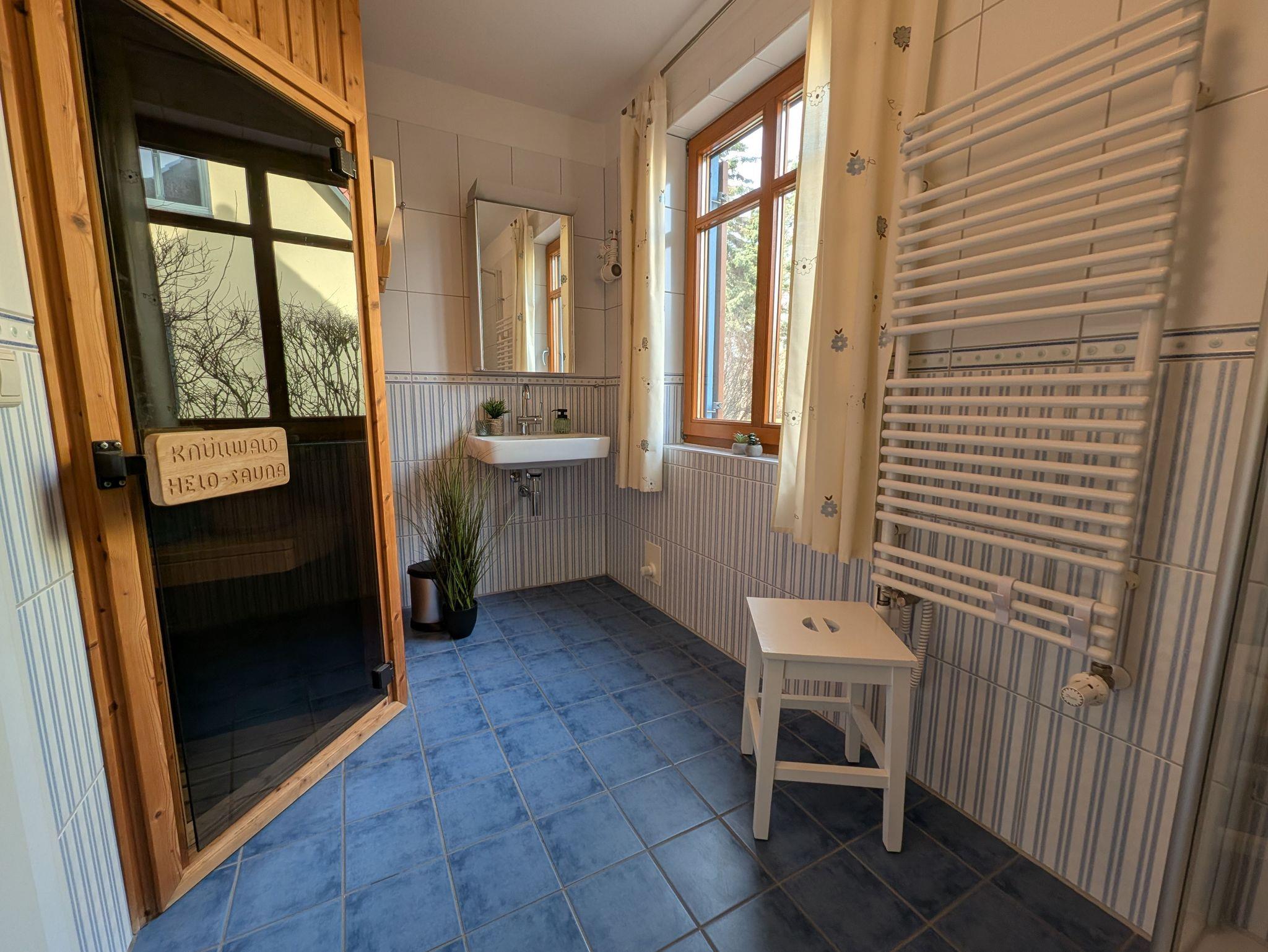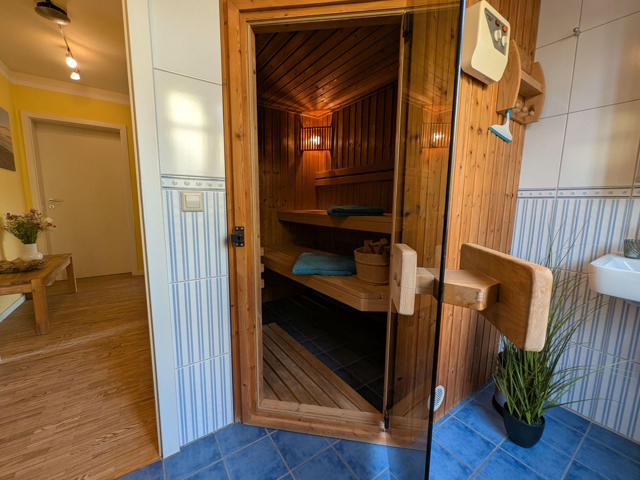Das Badezimmer ist mit Dusche, WC, Fön und einer Sauna , ganzjährig nutzbar, ausgestattet.