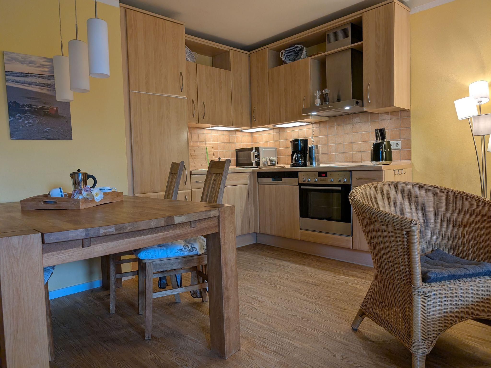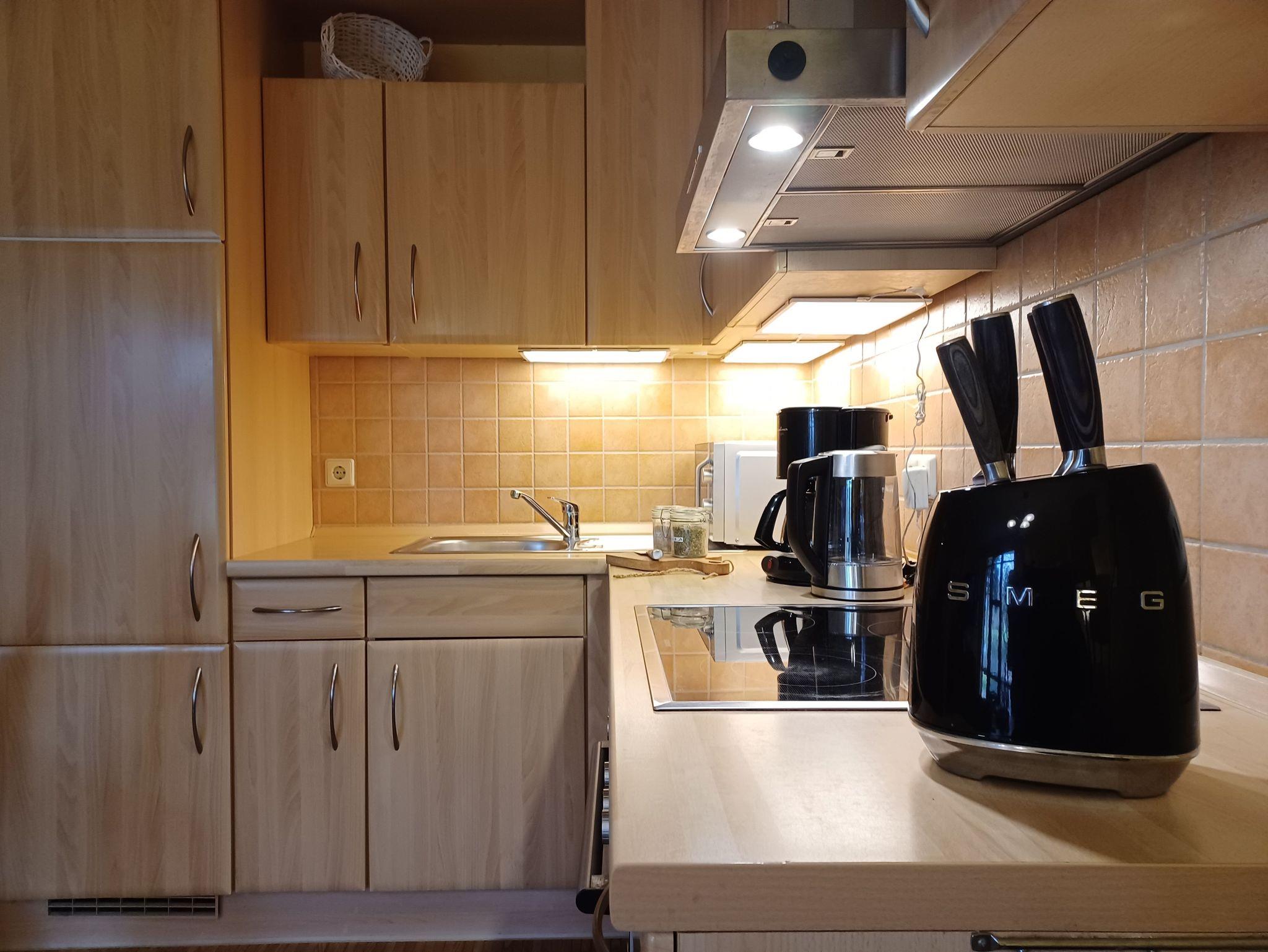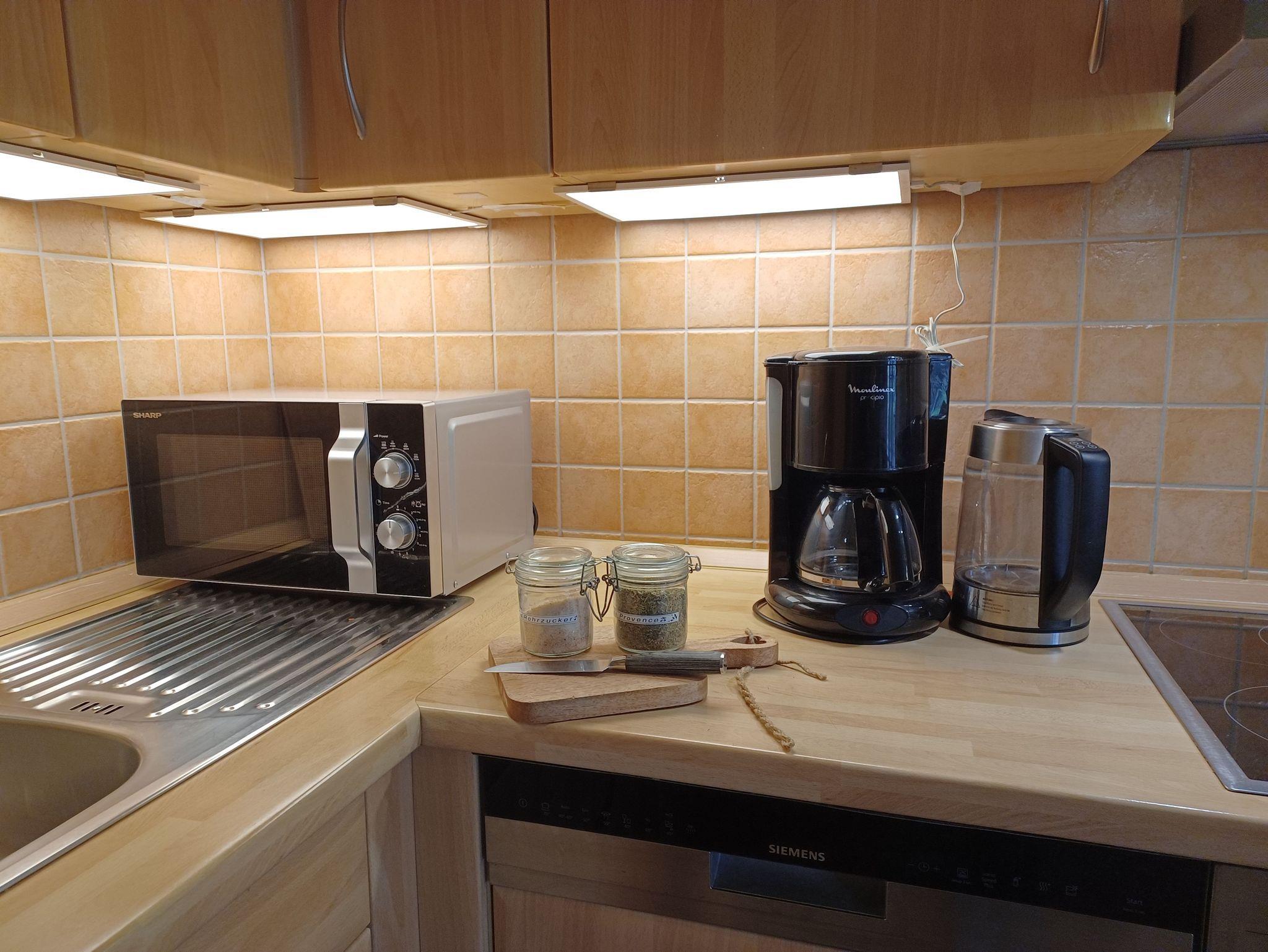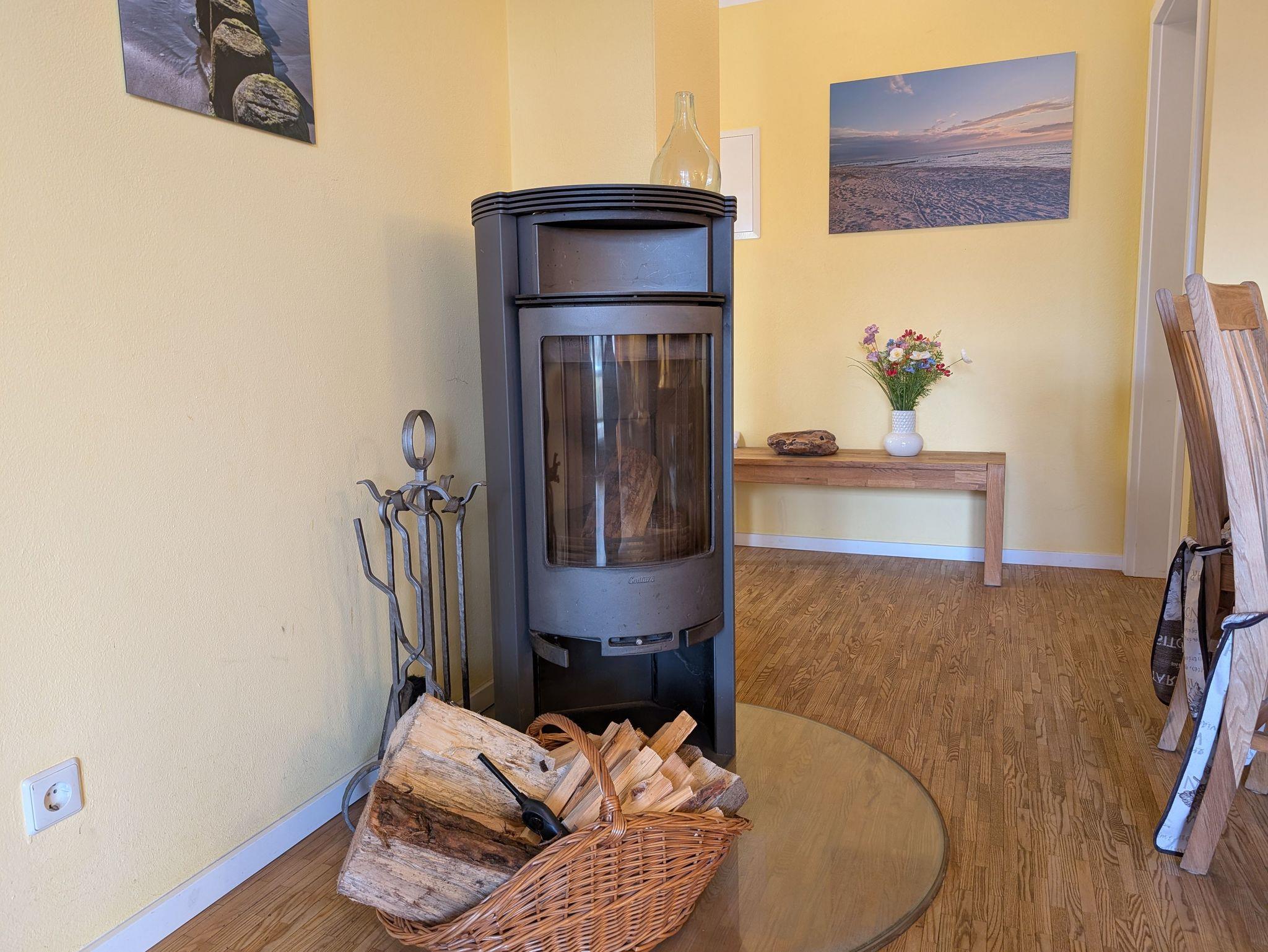 Der offene Wohn- und Küchenbereich ist geschmackvoll eingerichtet und ist mit einem Kaminofen, einem TV mit USB/HDMI und Radio ausgestattet. Die Küchenzeile wurde mit Kaffeemaschine, Wasserkocher, Kühlschrank mit Gefrierfach, Mikrowelle, Geschirrspüler und Herd mit Cerankochfeld und Backofen ausgestattet.
