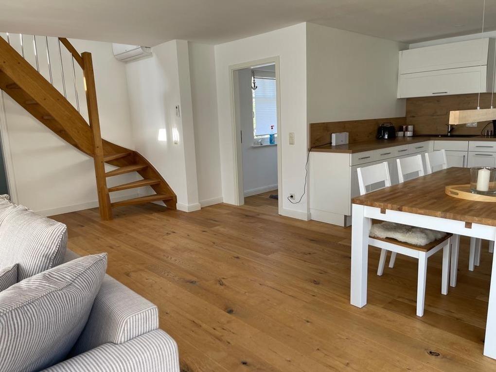 Herzlichen willkommen im Ostseebad Wustrow. Wer den lauten Trubel und überfüllten Stränden entkommen möchte, ist bei uns richtig. Das Reet gedeckte Ferienhaus wurde im regionalen Stil eingerichtet. Auf 2 Etagen steht Ihnen für bis zu sechs Personen ausreichend Platz zur Verfügung. Das Ferienhaus verfügt über ein Glasfaseranschluss für schnelles Internet. Im Erdgeschoss befindet sich der helle und großzügig gestaltete Wohnraum mit Essbereich und offener Küche. Diese ist mit Geschirrspülmaschine, Backofen, Wasserkocher und Toaster ausgestattet. Der vorhandene Kaminofen sorgt in den kühleren Tagen für wohlige Wärme. Weiterhin finden sie im Erdgeschoss ein Schlafzimmer mit Doppelbett und das Bad mit großer Dusche und Fußbodenheizung. Das gesamte Haus verfügt über Klimaanlage. Auf der sehr großzügigen Terrasse können sie ausgiebig das Frühstück genießen. Dort finden sie auch 2 Sonnenliegen.