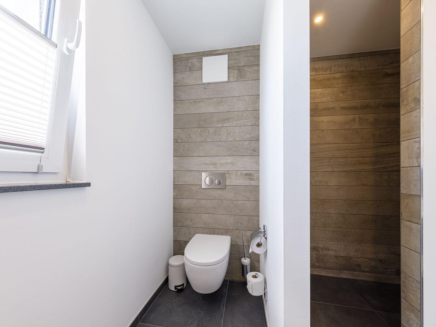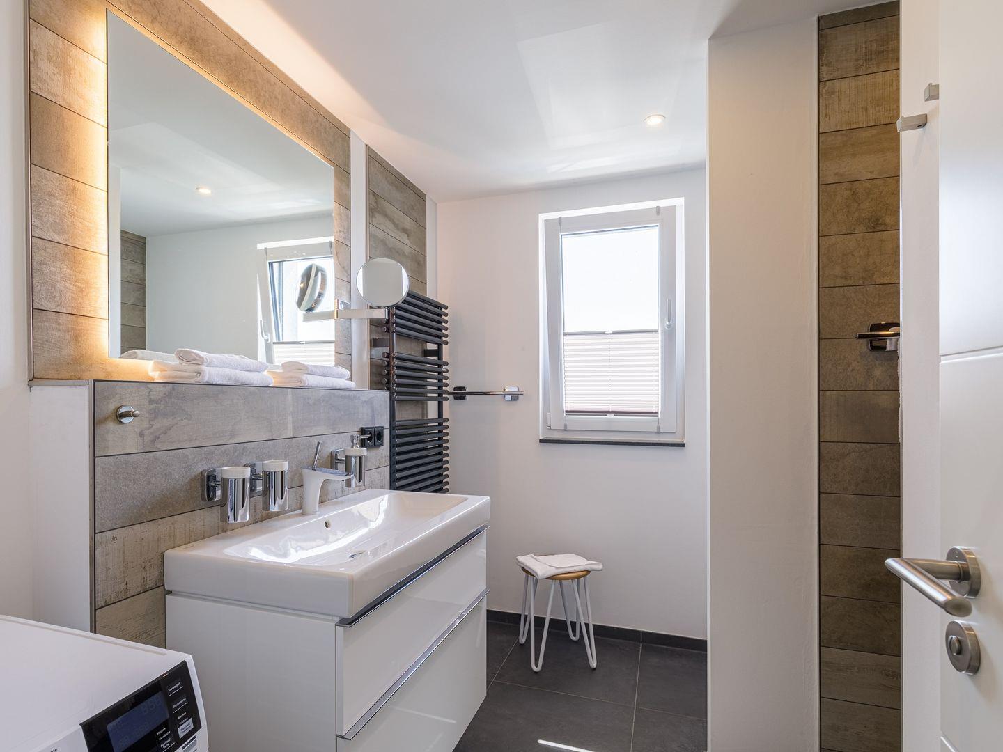 Die Ferienwohnung ist modern und stilvoll eingerichtet. Der im gesamten Wohn- und Schlafbereich der Ferienwohnung verlegte Design-Bodenbelag wirkt schlicht und zurücknehmend. Die installierte Fußbodenheizung, sowie ein Kamin sorgen für wohlige Wärme. Über den Eingangsbereich, in dem Ihnen verschiedene Aufhängemöglichkeiten und ein Sideboard ausreichend Stauraum bieten, gelangen Sie in den großzügigen Wohn-, Ess- und Küchenbereich. Ein großes Sofa mit zwei Lounge-Chair-Sesseln laden zu gemütlichen Abenden mit Freunden und der Familie ein und der Blick aus den bodentiefen Fenstern ist einfach atemberaubend. Für die mediale Unterhaltung sorgen im Wohnbereich eine Hi-Fi-Anlage und ein 50-Flachbild-TV. Kostenfreies W-LAN steht Ihnen selbstverständlich auch zur Verfügung. Ergänzt wird die gemütliche Wohnlandschaft durch den Essbereich, bestehend aus einem Esstisch und vier Stühlen. Geselligen Abenden oder gemeinsamen Essen steht damit nichts im Wege. Die offene, voll ausgestattete NOLTE-Einbauküche hat alles, was ein Kochherz begehrt. Elektro-Einbaugeräte, wie ein Induktionsherd, ein Geschirrspüler, ein Kühlschrank mit Gefrierkombination und eine Mikrowelle, sowie zahlreiche Kochutensilien runden das Angebot ab. Genießen Sie Ihr Essen doch gerne auf dem großen Südwestbalkon. Von dort aus können Sie entspannt auf die gefärbten Segel der Zeesboote auf dem Bodden schauen. Den möblierten Balkon erreichen Sie bequem vom Wohn- und Essbereich über die vollverglasten Türen. Zur Ausstattung gehören ein Tisch, zwei Stühle und zwei Sonnenliegen. Das Schlafzimmer ist mit liebevollen Details eingerichtet. Träumen Sie in dem Boxspringbett (180 x 200 cm) oder genießen Sie die Aussicht aus den bodentiefen Fenstern. Ein Kleiderschrank, mit integriertem Safe für Ihre Wertsachen, bietet ausreichend Stauraum. Außerdem befinden sich in dem Schlafzimmer zwei Nachttische mit je einer Nachttischlampe und ein 32-Zoll Flachbild-TV. Gerne können 2 weitere Gäste auf der Schlafcouch übernachten. In dem Tageslicht-Badezimmer, welches Sie über den Eingangsbereich erreichen können, stehen Ihnen eine ebenerdige Dusche, ein Waschbecken mit Unterschrank, ein WC, sowie ein Kosmetikspiegel und ein Föhn zur Verfügung. Große Fliesen und warme Töne runden das Gesamtbild ab und spiegeln den Strandhaus-Stil wider.