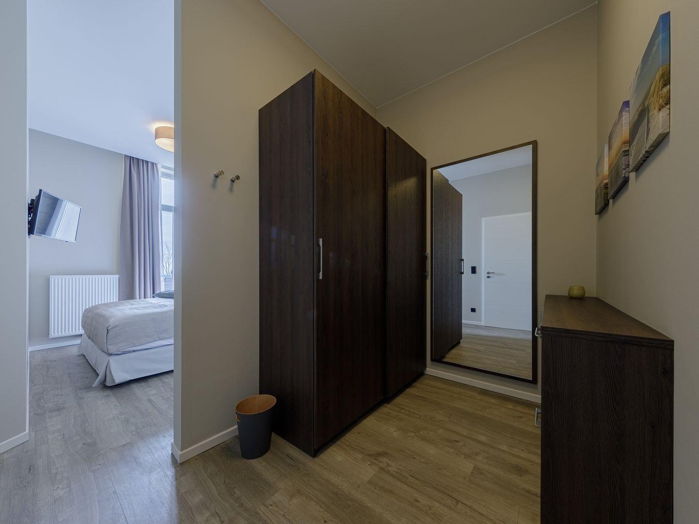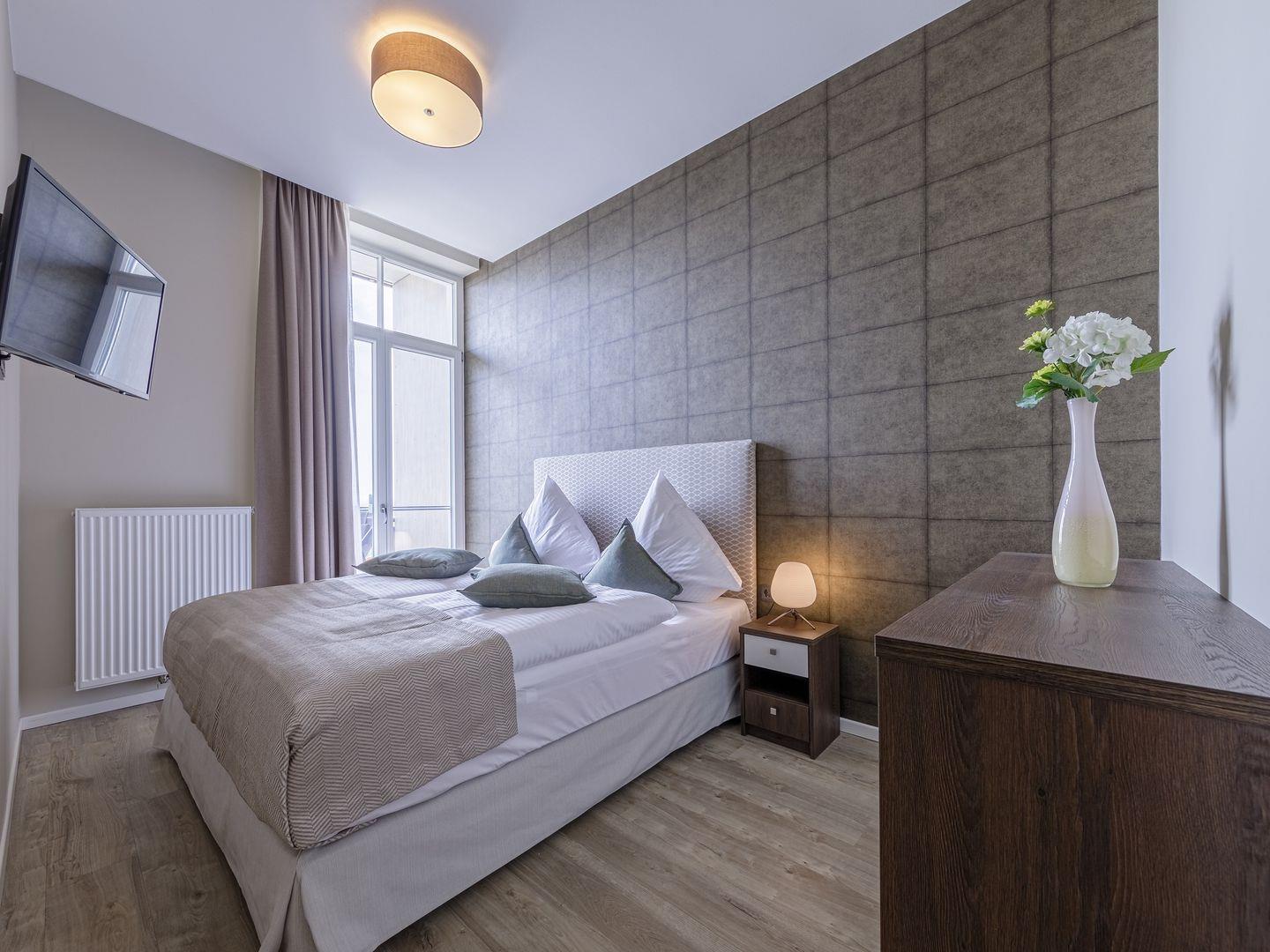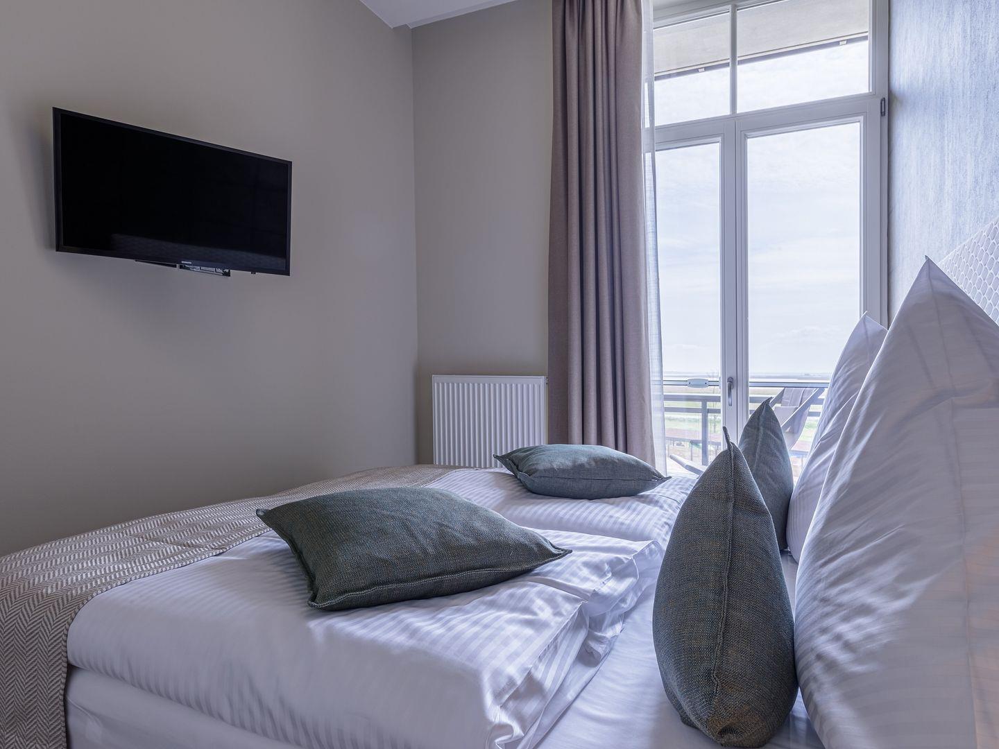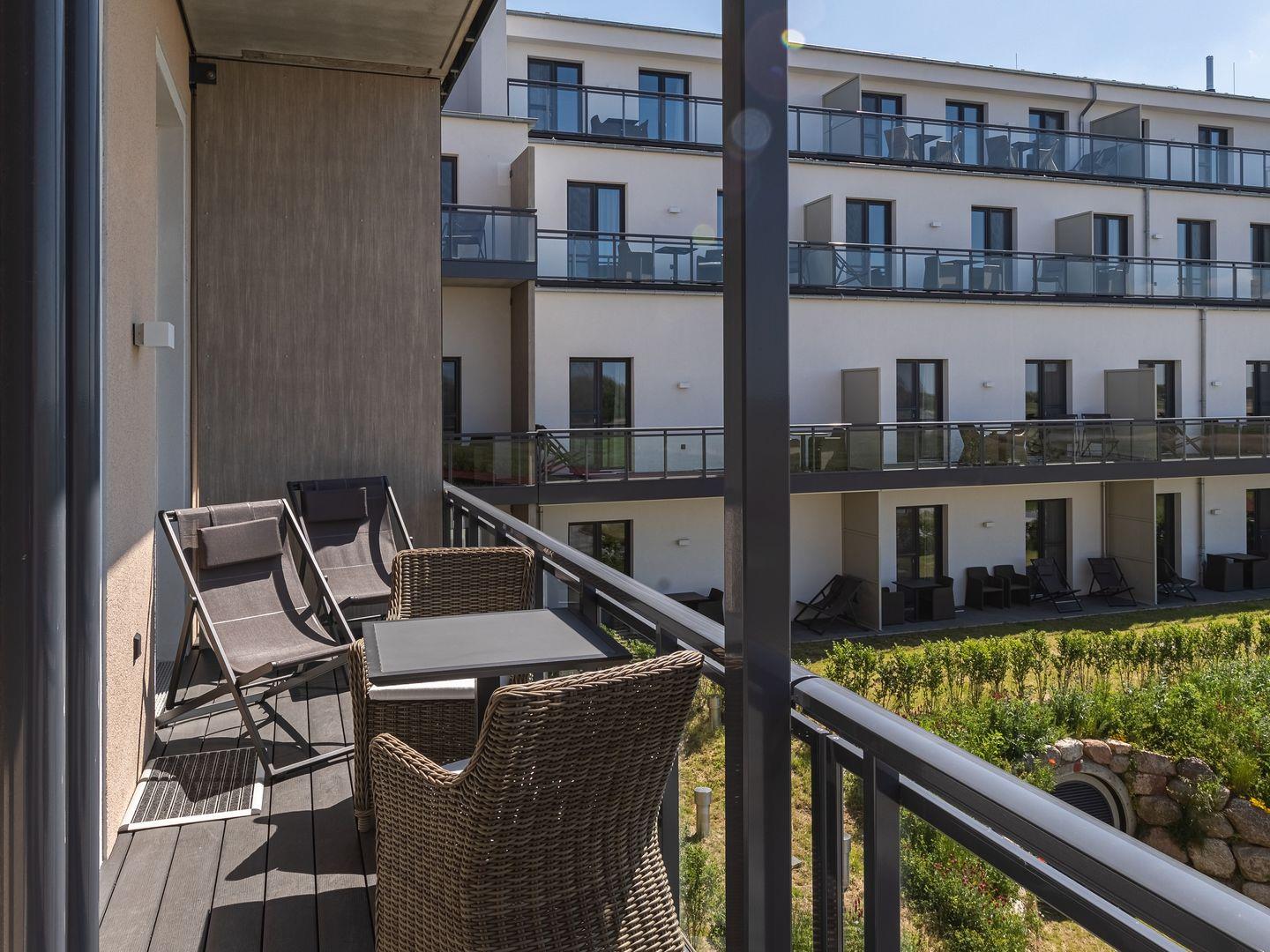 Das Apartment gehört zur neu errichteten Ferienanlage "Alte Seefahrtschule" im Ostseebad Wustrow. Erreichen können Sie das mit 69 m² sehr großzügige Appartement im 1. Obergeschoss problemlos über einen Fahrstuhl. Von dem Südbalkon, wo Sie den ganzen Tag die Sonne für Sie schein, können traumhaften Ausblick über Bodden und Ostsee genießen. Nutzen Sie dafür doch gerne die Sonnenliegen oder den Tisch mit Balkonstühlen. Zum Entspannen ist auch der Wohnbereich ideal geeignet - ein gemütliches Sofa mit zwei Sesseln laden hier zu schönen gemeinsamen Stunden ein. Das Sofa kann außerdem mit einem Handgriff zum Schlafsofa umgeklappt werden und bietet somit einen weiteren Schlafplatz. Kochen können in der offenen NOLTE-Einbauküche. Diese verfügt über einen Induktionsherd, einen Backofen, einen Geschirrspüler, einen Kühlschrank mit Gefrierkombination, eine Mikrowelle sowie zahlreiches Kochzubehör. In dem modernen und lichtdurchfluteten Schlafzimmer erwartet Sie für erholsame Nächte ein bequemes Boxspringbett. Das ebenfalls sehr große Badezimmer mit Fußbodenheizung verfügt über ebenerdige Dusche, ein WC, ein Waschtisch mit Unterschrank sowie ein Waschtrockner der von Ihnen kostenfrei genutzt werden kann.
