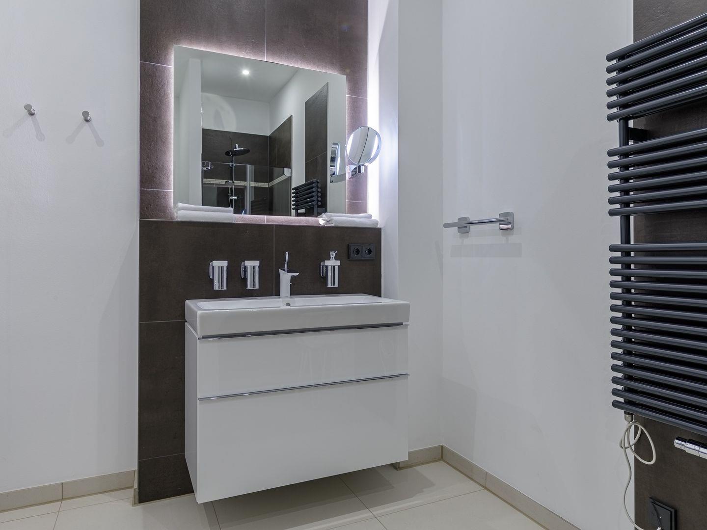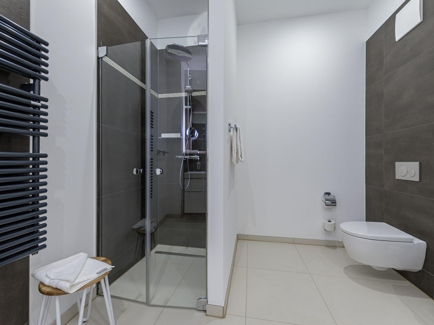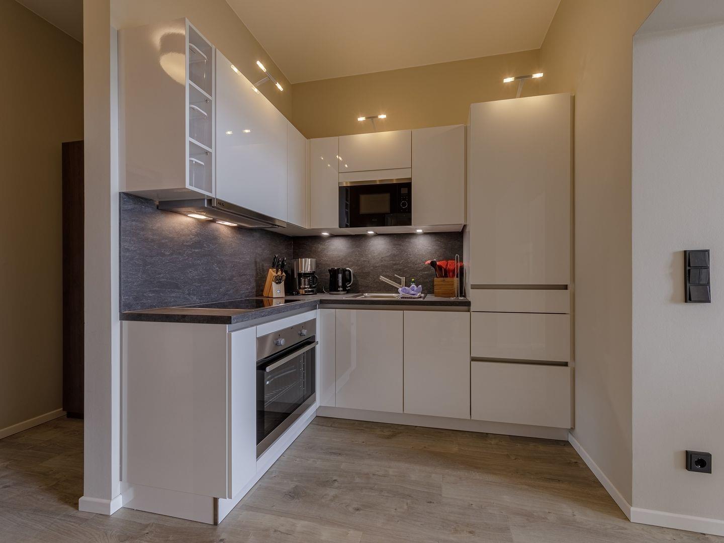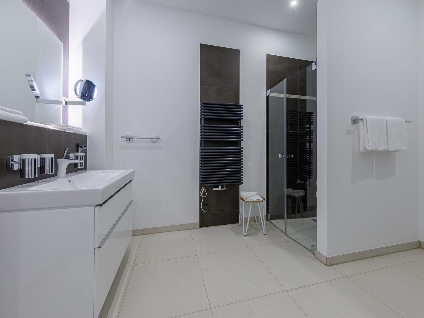 Das Apartment gehört zur neu errichteten Ferienanlage "Alte Seefahrtschule" im Ostseebad Wustrow. Erreichen können Sie das mit 69 m² sehr großzügige Appartement im 1. Obergeschoss problemlos über einen Fahrstuhl. Von dem Südbalkon, wo Sie den ganzen Tag die Sonne für Sie schein, können traumhaften Ausblick über Bodden und Ostsee genießen. Nutzen Sie dafür doch gerne die Sonnenliegen oder den Tisch mit Balkonstühlen. Zum Entspannen ist auch der Wohnbereich ideal geeignet - ein gemütliches Sofa mit zwei Sesseln laden hier zu schönen gemeinsamen Stunden ein. Das Sofa kann außerdem mit einem Handgriff zum Schlafsofa umgeklappt werden und bietet somit einen weiteren Schlafplatz. Kochen können in der offenen NOLTE-Einbauküche. Diese verfügt über einen Induktionsherd, einen Backofen, einen Geschirrspüler, einen Kühlschrank mit Gefrierkombination, eine Mikrowelle sowie zahlreiches Kochzubehör. In dem modernen und lichtdurchfluteten Schlafzimmer erwartet Sie für erholsame Nächte ein bequemes Boxspringbett. Das ebenfalls sehr große Badezimmer mit Fußbodenheizung verfügt über ebenerdige Dusche, ein WC, ein Waschtisch mit Unterschrank sowie ein Waschtrockner der von Ihnen kostenfrei genutzt werden kann.