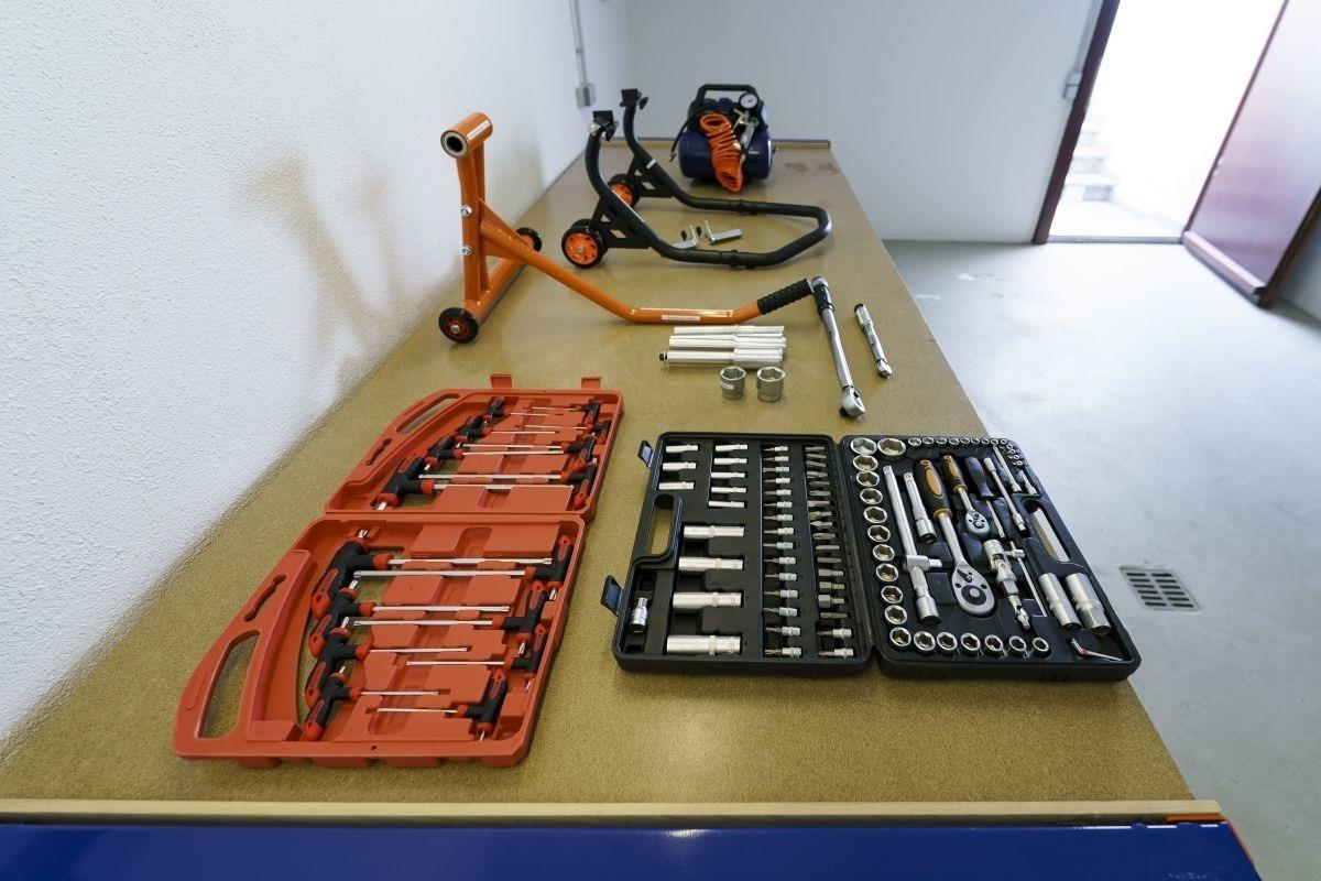 Speziell für Motorradfahrer haben wir im Keller stabile Kleiderstangen für die Lederkombis angebracht, ebenso können dort die Helme deponiert und die Gegensprechanlagen aufgeladen werden. Gegen eine Kaution stellen wir Ihnen Werkzeug für kleinere Wartungsarbeiten am Fahrrad oder Motorrad zur Verfügung.