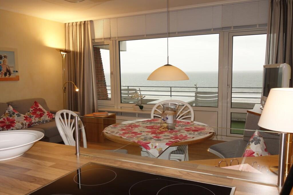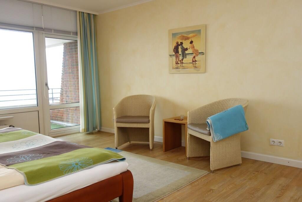 Here, two small apartments have been combined to create one large apartment for two people. The size is wonderful! The living room has a comfortable sofa, there's a dining area next to the open-plan kitchen, a bedroom with a spacious layout, two shower rooms, and plenty of closet space for your luggage. Not to mention two balconies with sun loungers, a table, and chairs. Both rooms offer sea views all day long, and they're beautiful in any weather... see for yourself.
