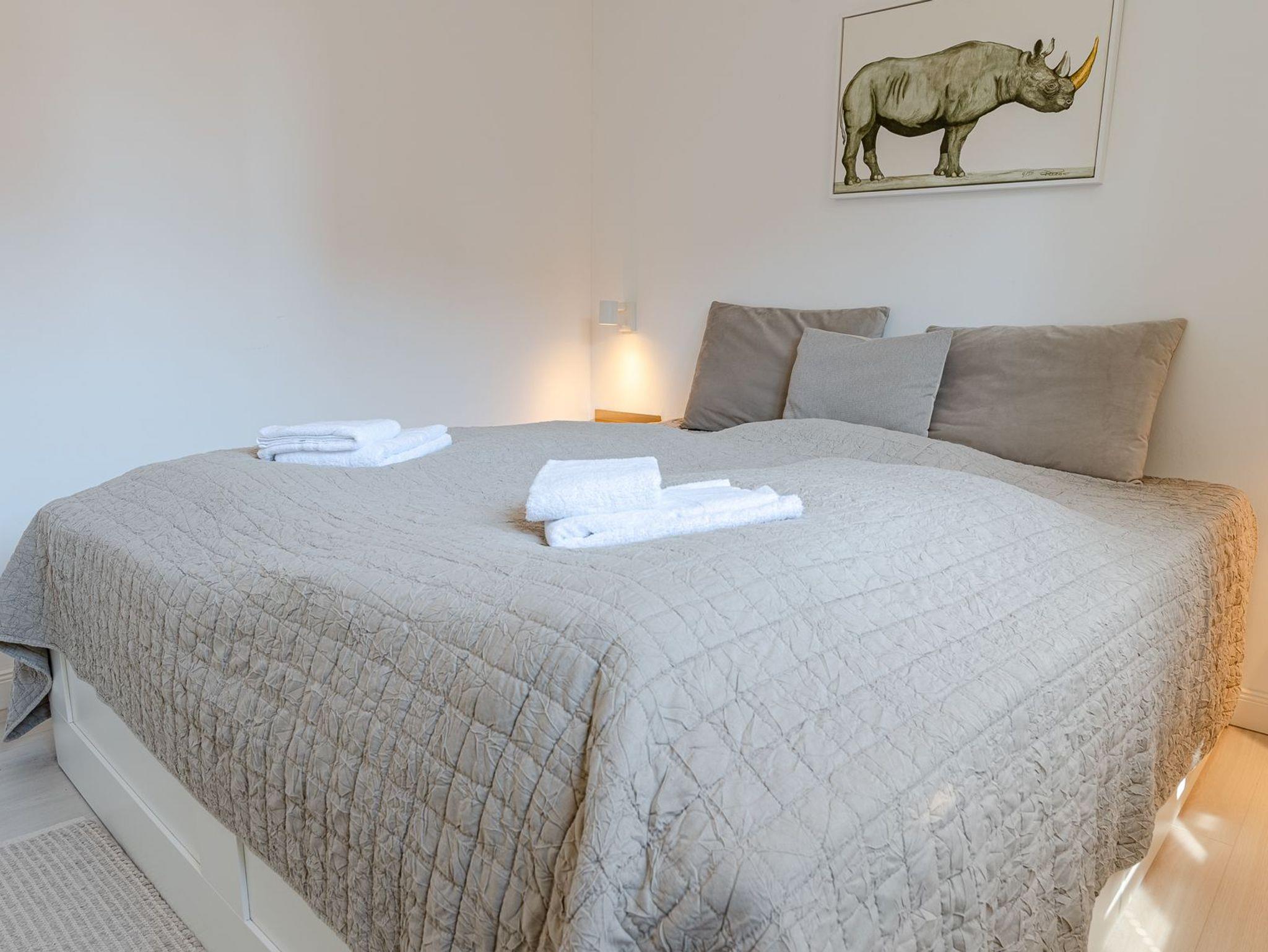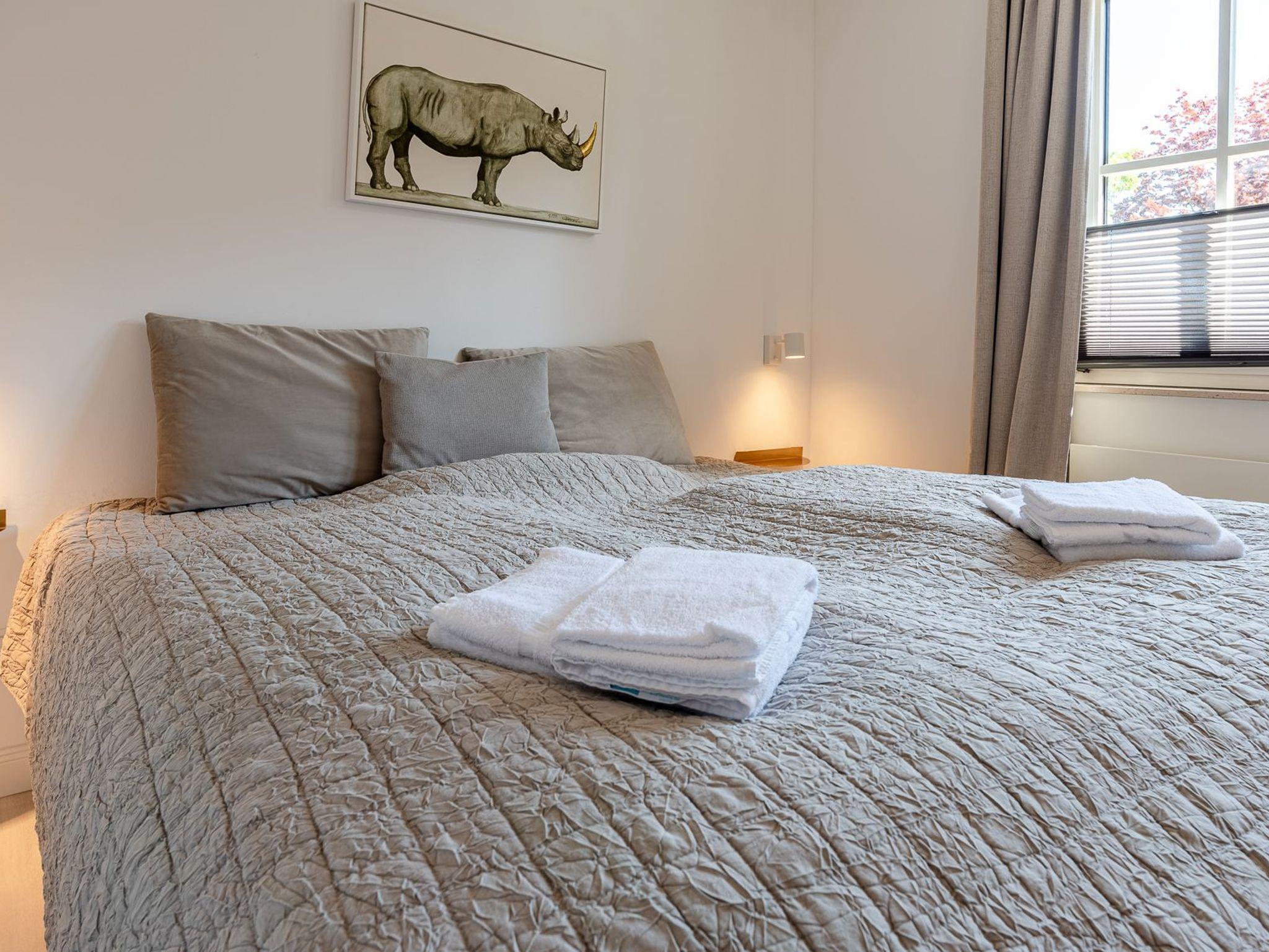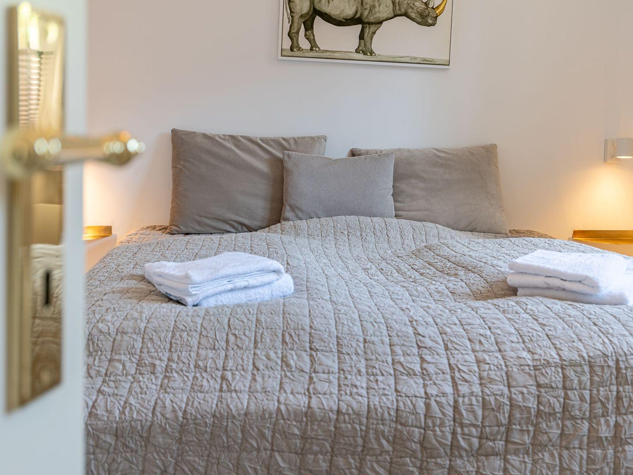 Das Schlafzimmer ist mit einem Doppelbett (1,80 x 2,00 m) mit hochwertigen Matratzen, Allergikerbezügen und neuen Vierjahreszeiten-Bettdecken sowie einem geräumigen Kleiderschrank ausgestattet. Lassen Sie sich von der Morgensonne wecken oder nutzen Sie die praktischen Verdunkelungsvorhänge oder die Plissees für Ihre erholsame Nachtruhe.