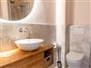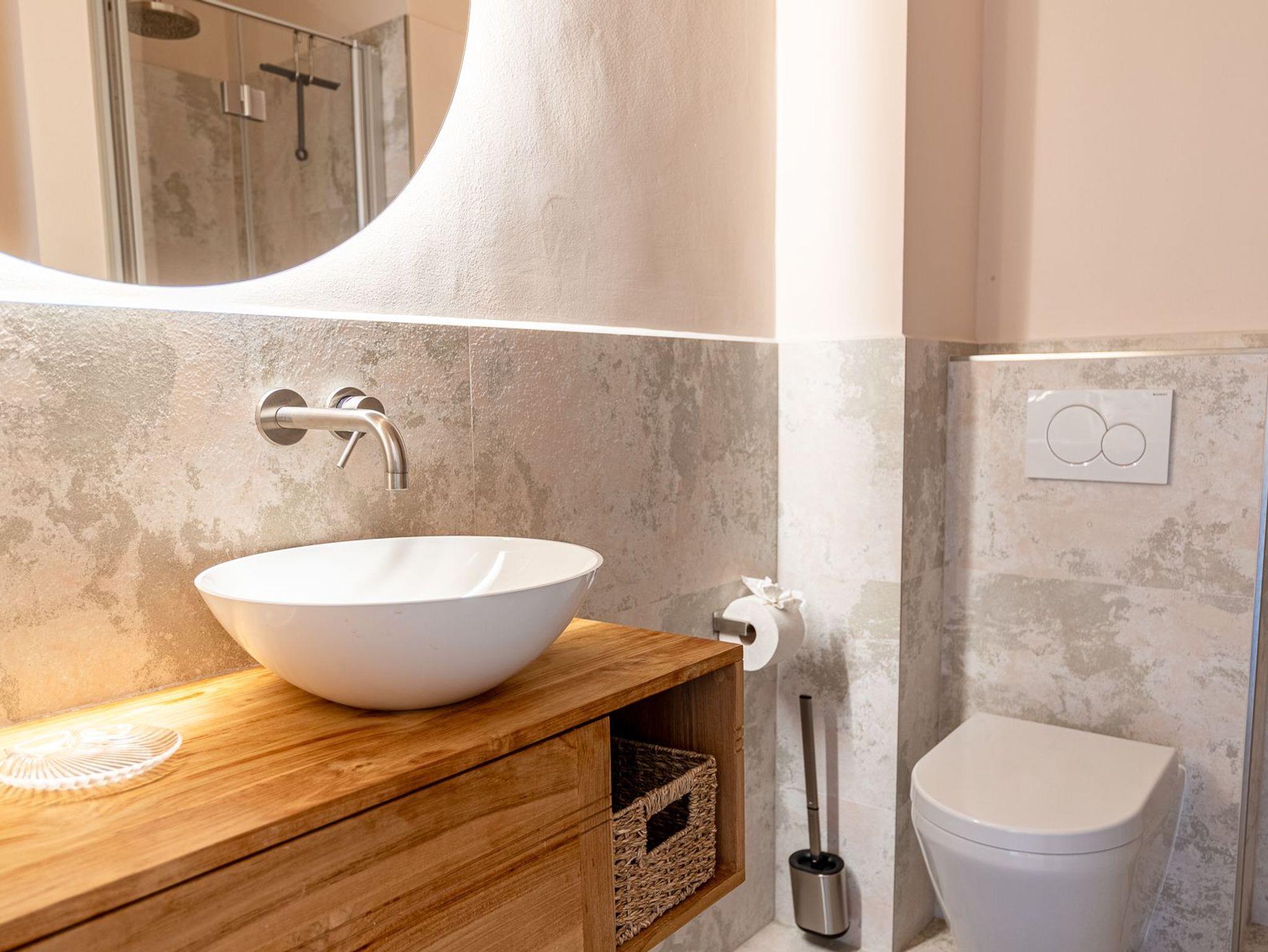 Das Highlight der Wohnung ist das Badezimmer mit geschmackvollen Fliesen aus italienischem Naturstein, dem Echtholz-Waschtisch aus Teak und der Regenschauer-Dusche. Die Fußboden-Heizung und der formschöne Handtuchheizkörper vervollständigen die kleine Wellness-Oase.