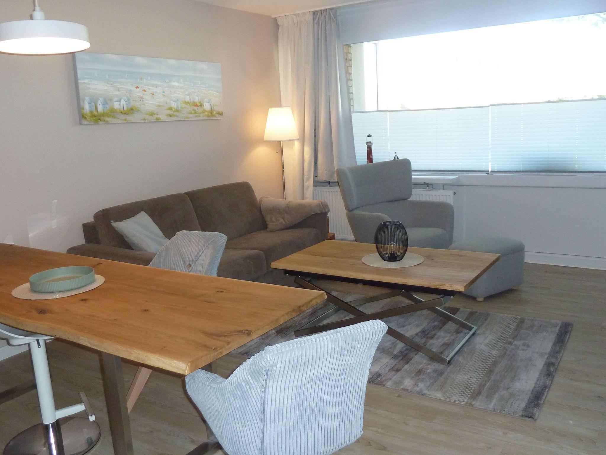 Die strandnahe und helle Ferienwohnung im Hochpaterre bietet Platz für zwei bis drei Personen. Zusätzlich zu dem separaten Schlafzimmer mit einem Doppelbett hat eine Person die Möglichkeit das Schlafsofa zu nutzen. Zudem verfügt die Wohnung über ein gemütliches Wohnzimmer mit integrierter Küche. Hier können Sie die Waschmaschine kostenfrei nutzen.