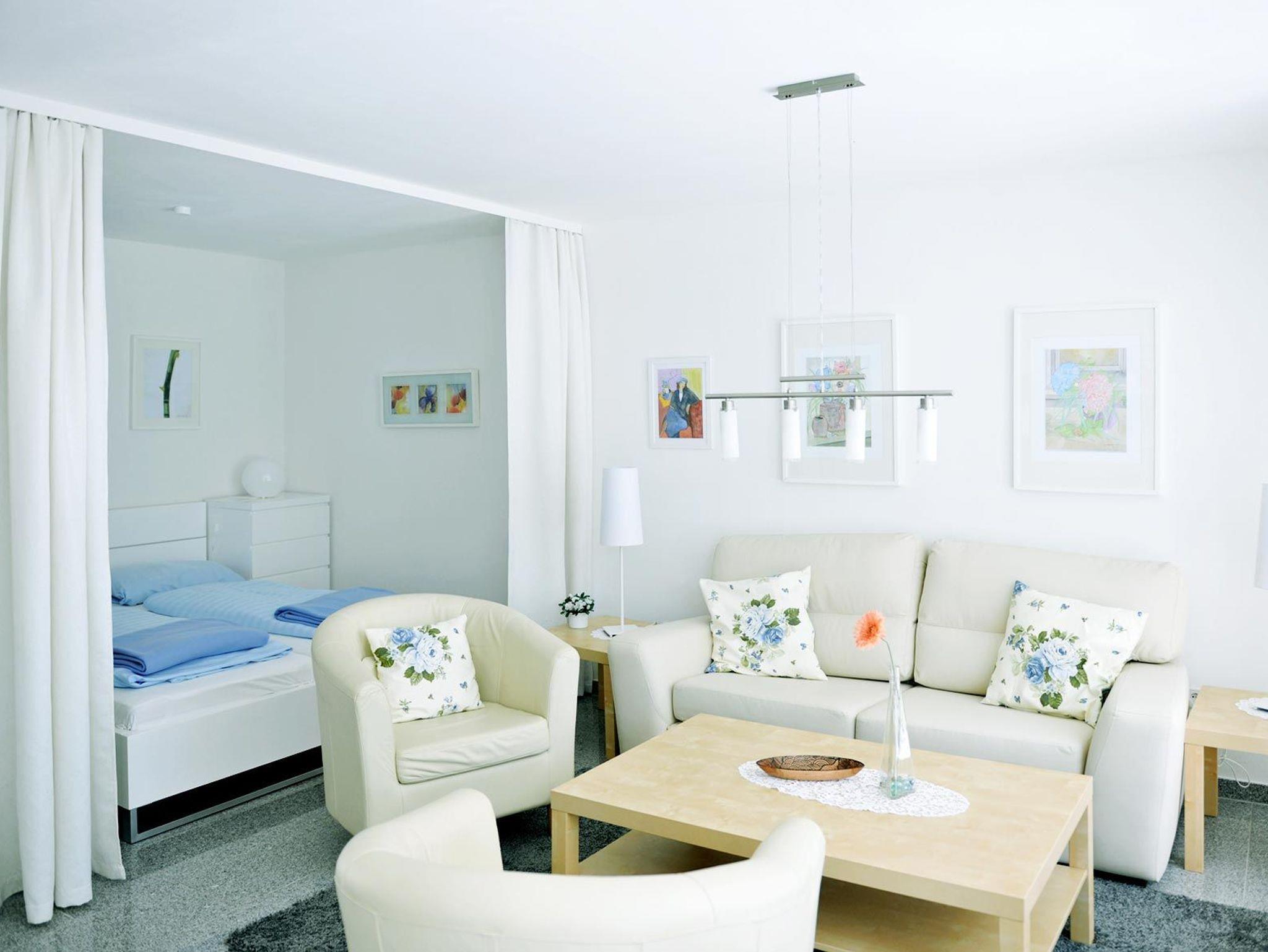 Der gemütliche Wohnbereich bietet neben SAT-TV auch viel Gemütlichkeit z.B. zum Lesen oder Ausruhen. Der Schlafbereich mit Doppelbett ist vom Wohnbereich durch einen Vorhang getrennt.