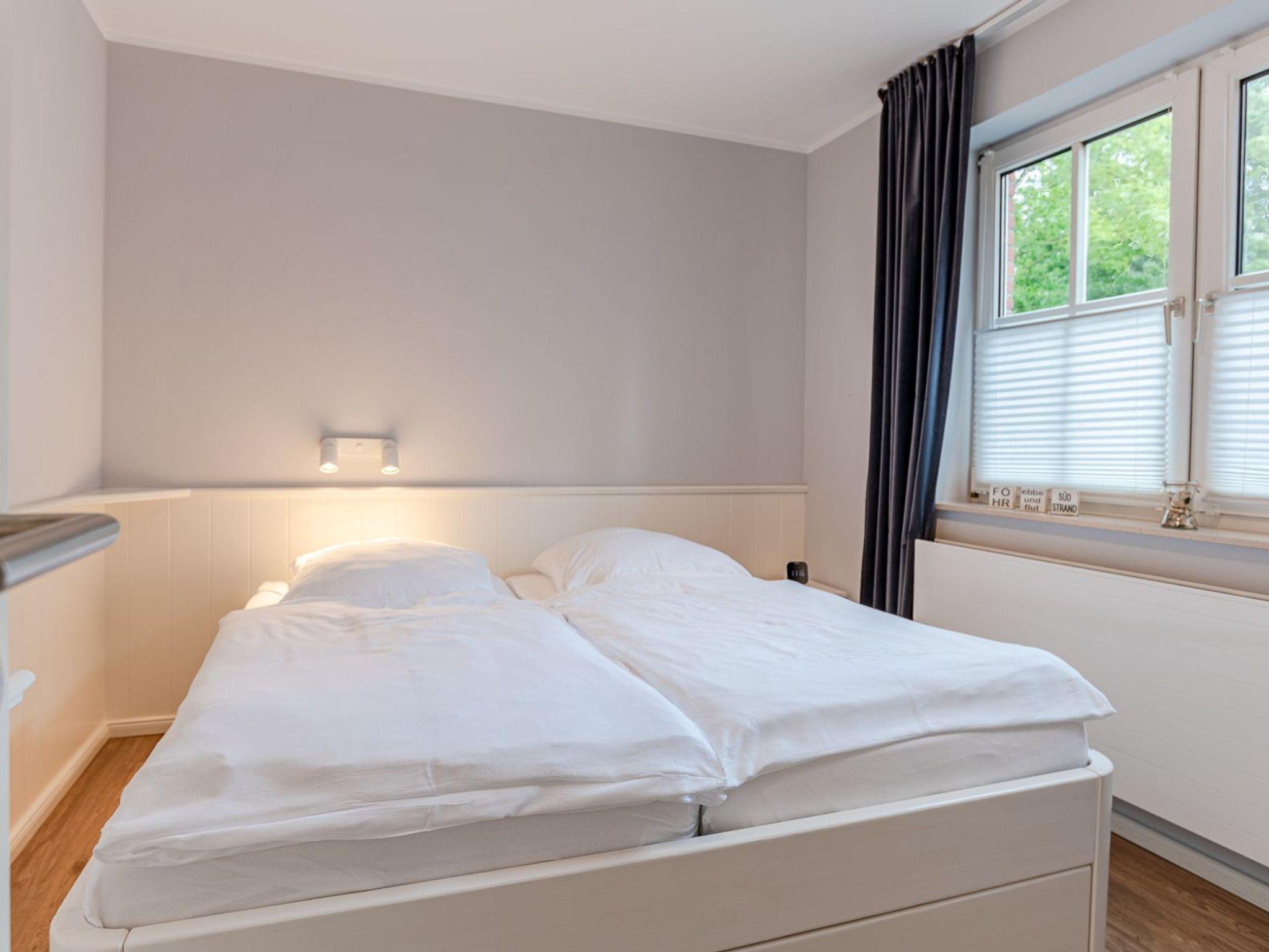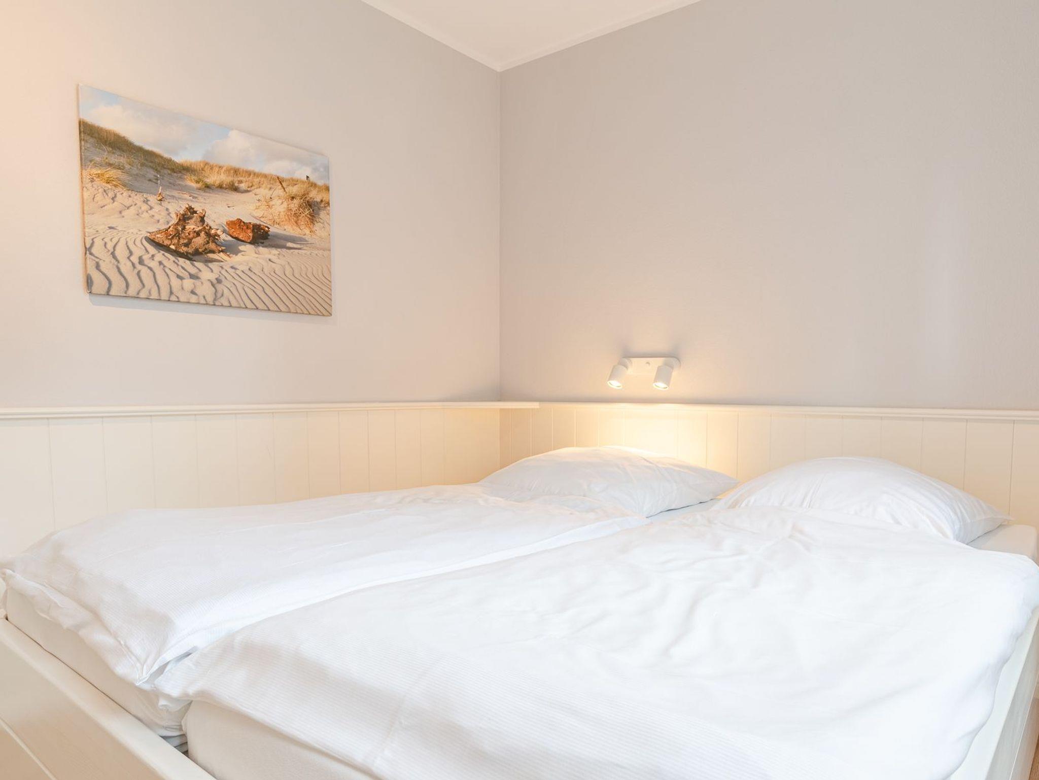 Das Schlafzimmer punktet mit weißen Premium-Massivholzmöbeln. Es ist mit einem Doppelbett (1,80 x 2,00 m) mit hochwertigen Matratzen, Allergikerbezügen, neuen Vierjahreszeiten-Bettdecken und einem geräumigen Kleiderschrank ausgestattet, ebenso wie mit stilvollen Verdunkelungsvorhängen & Plissees.