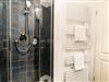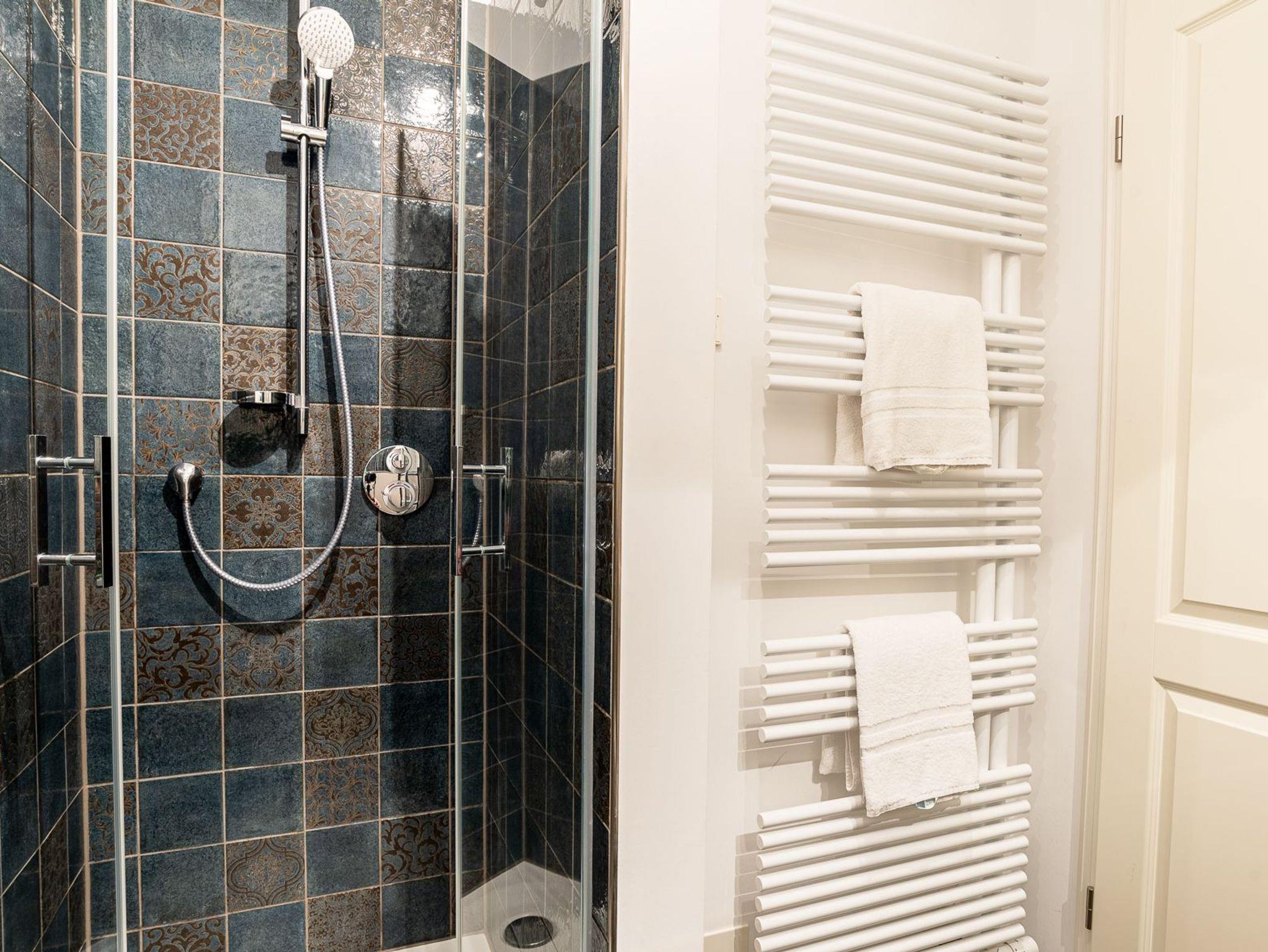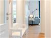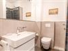 Das luxuriöse Badezimmer erwartet Sie mit geschmackvollen Fliesen aus Naturstein und einem formschönen Waschtisch mit viel Stauraum. Die Fußboden-Heizung und ein Handtuchheizkörper sorgen für wohlige Wärme.