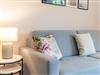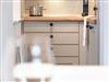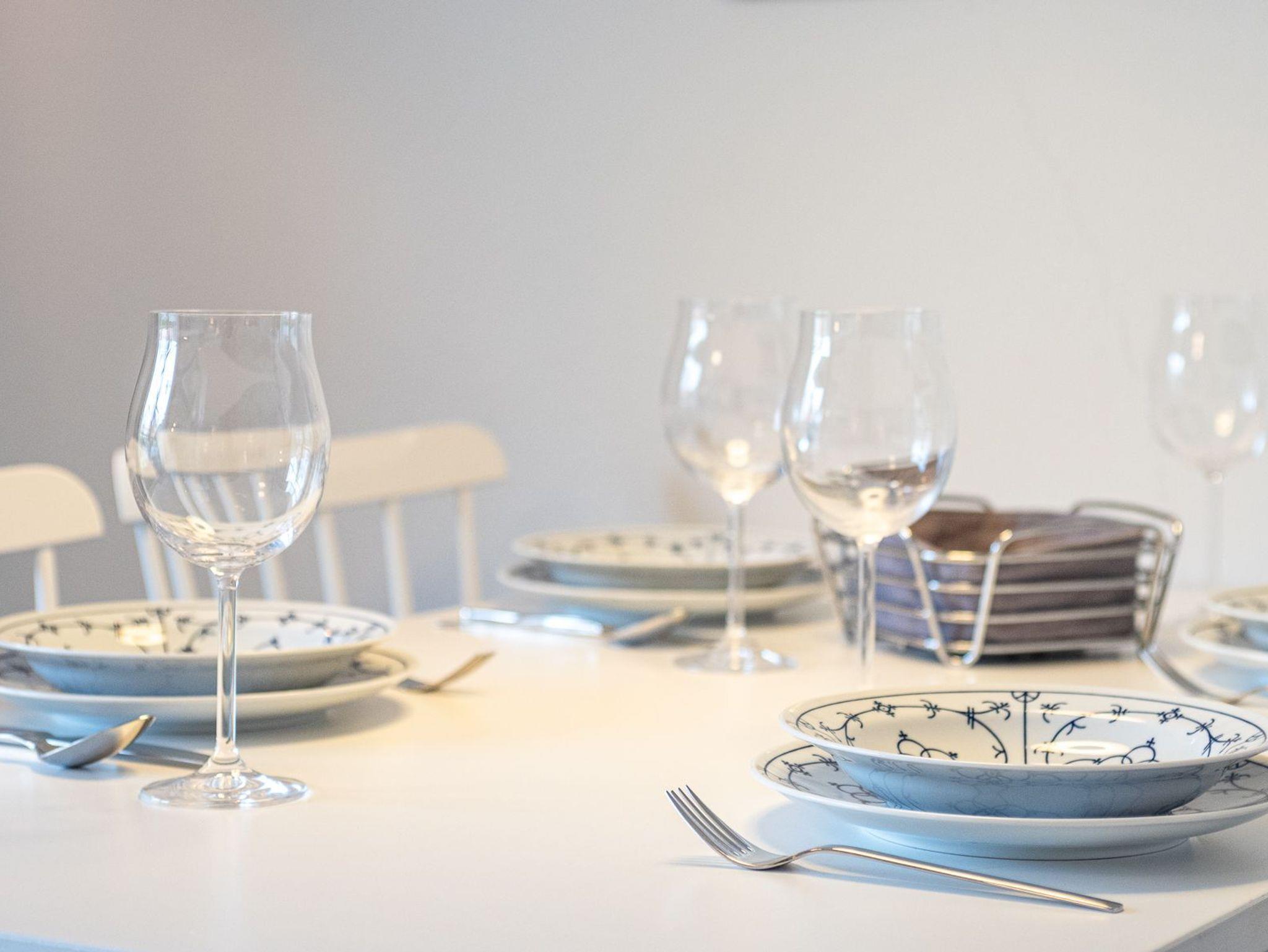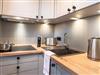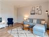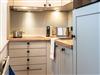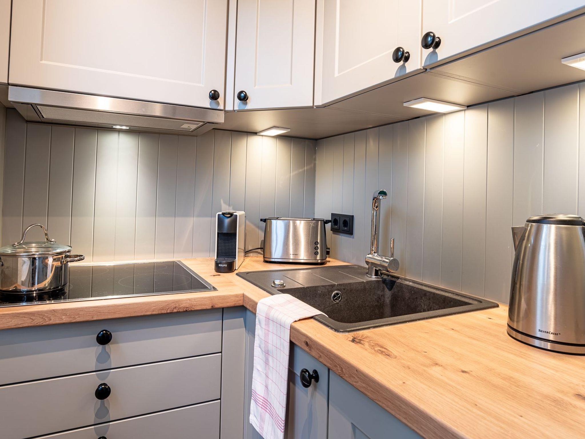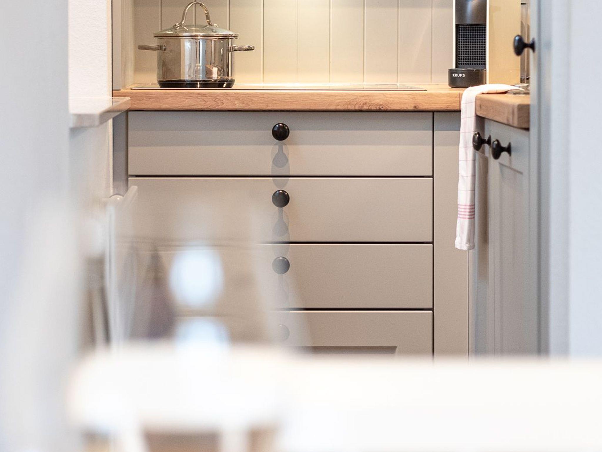 Neben dem hellen Wohn- und Essbereich mit großer Couch, einem Sessel und dem Smart TV ist die hochwertige Marken-Einbauküche ein besonderes Highlight dieser geschmackvoll ausgestatteten Wohnung. Die offene Küchenzeile wartet mit allem Komfort auf Sie: hochgebauter Backofen, großer Kühlschrank mit Gefrierfach, besonders leise Spülmaschine.