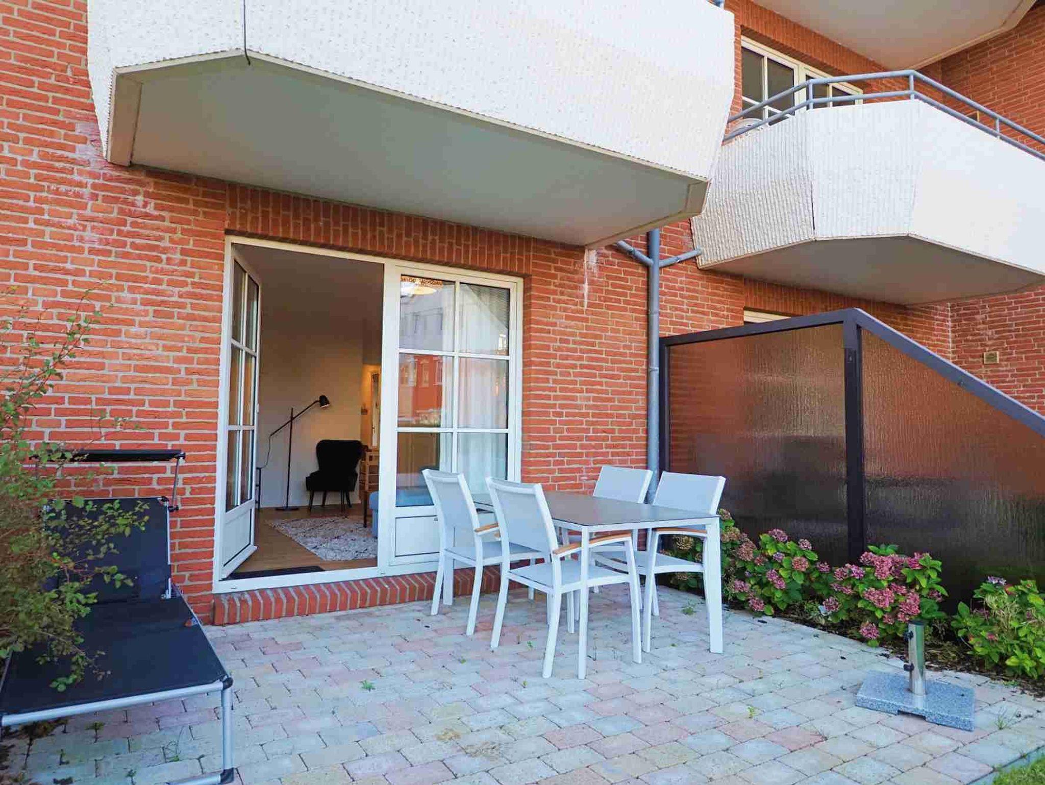 Lassen Sie Ihren Urlaubstag ausklingen auf der sonnigen und windgeschützten West-Terrasse, ausgestattet mit formschönen und bequemen Gartenmöbeln.