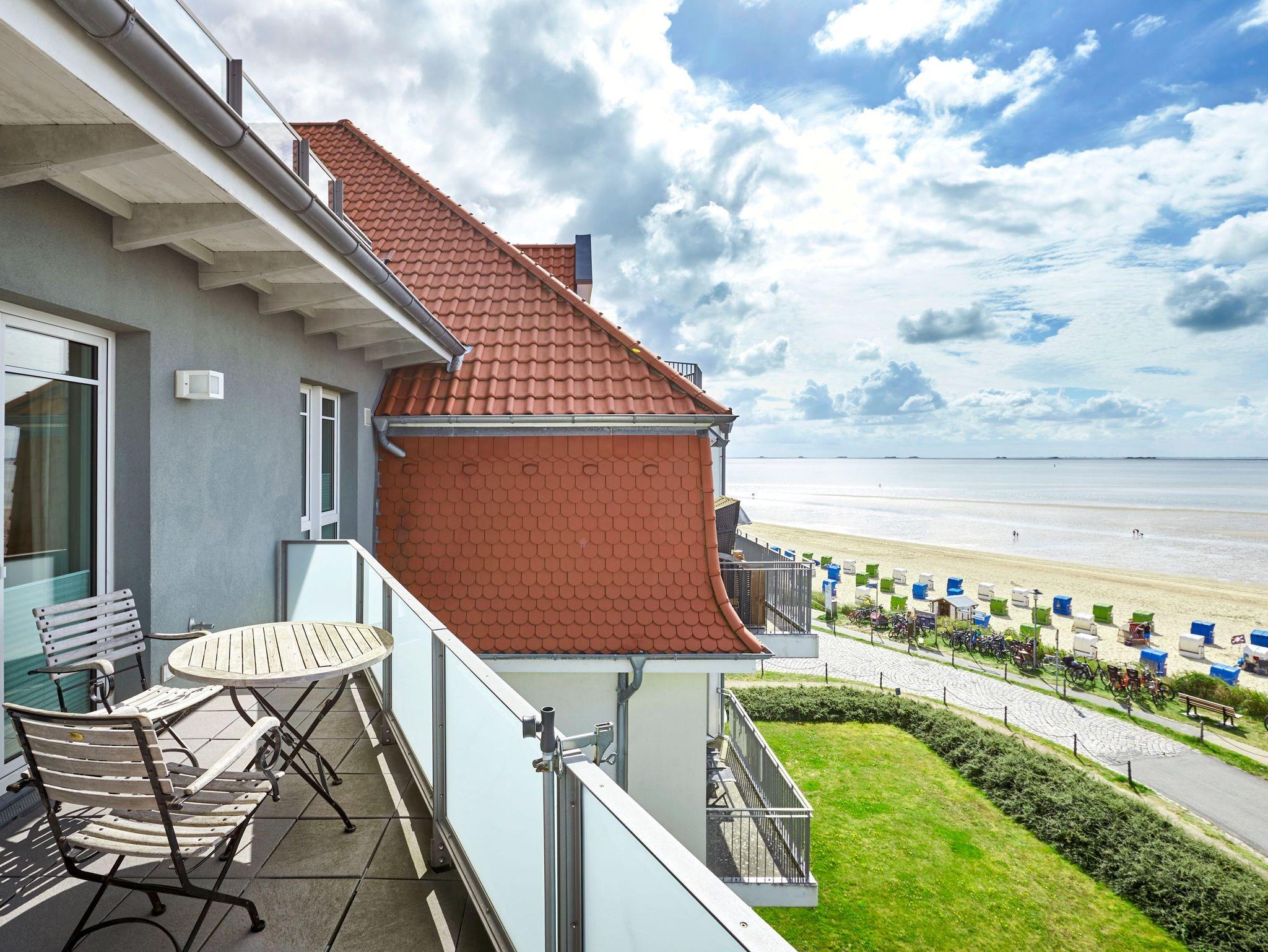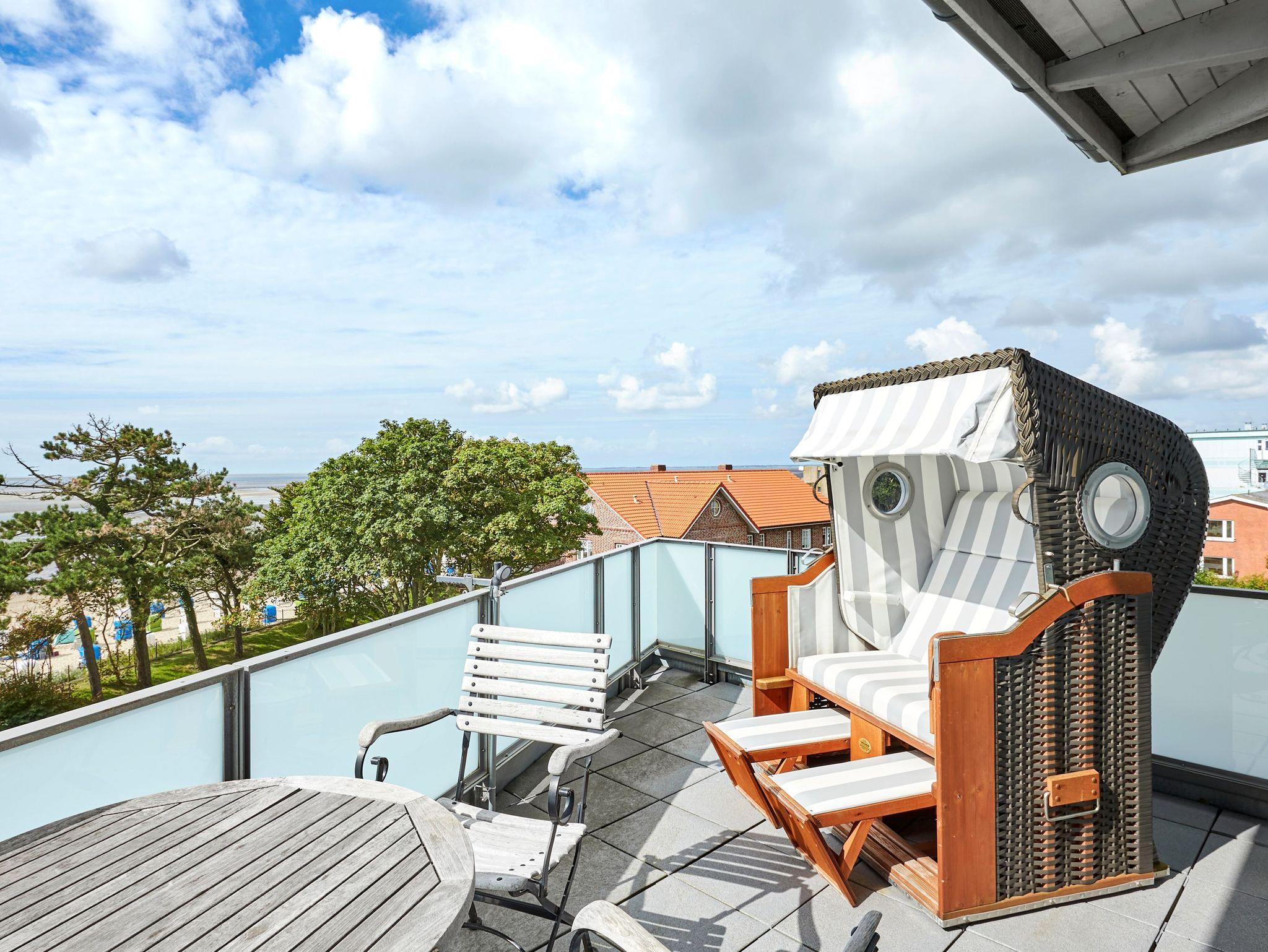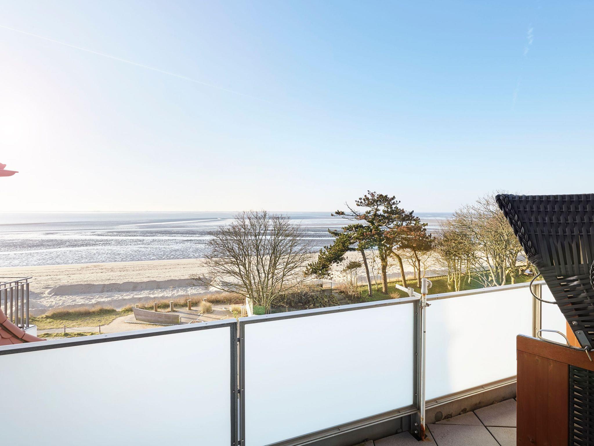 Wir begrüßen Sie im Schloß am Meer, der exklusiven Wohnanlage direkt am Wyker-Südstrand gelegen. Ihre Wohnung liegt im Staffelgeschoss hinter der historischen Fassade, welche beim Neubau erhalten wurde. Hier haben Sie eine Dachterrasse nach Süden gelegen ganz für sich allein und einen Blick auf die Nordsee und die Halligen. Dieser einzigartige Panoramablick ist unvergesslich. In nur wenigen Schritten befinden Sie sich auf der Promenade, die Sie ins Herz von Wyk führt. Hier laden Geschäfte zum Bummeln ein, Cafes und Restaurants verwöhnen Sie mit kulinarischen Köstlichkeiten.