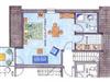 Raumaufteilung: Kombinierter Wohn- und Schlafraum mit Doppelbett, separater Küche, Duschbad.
