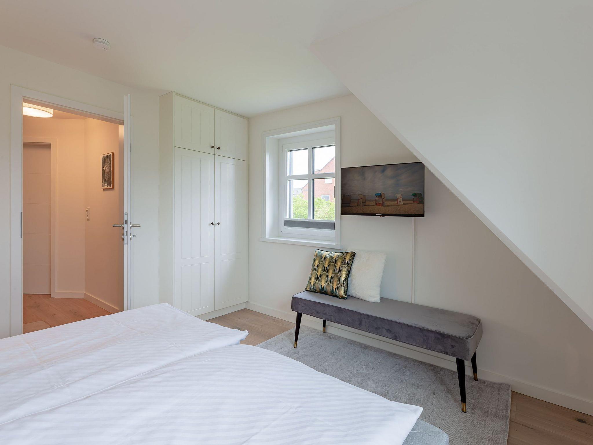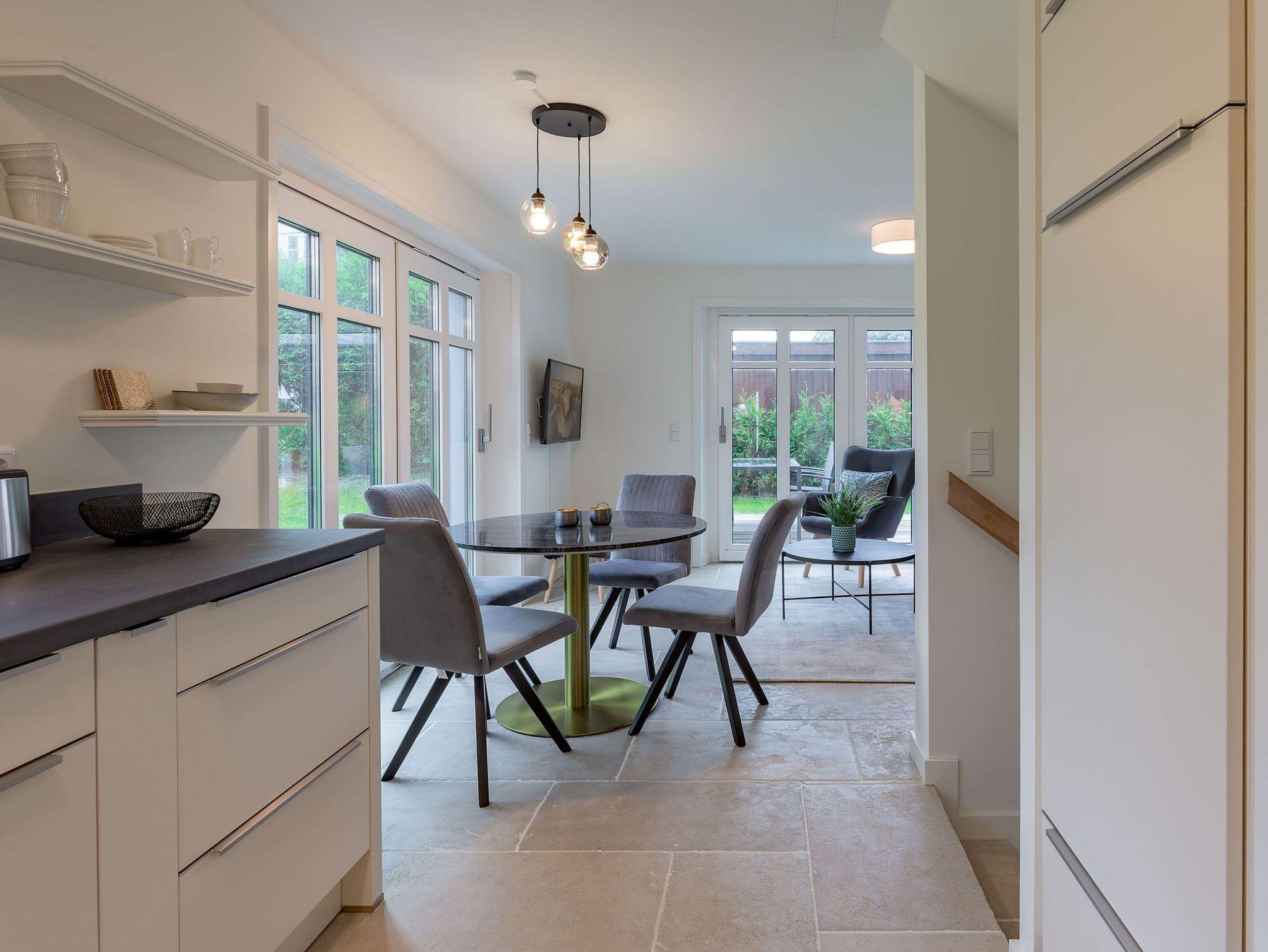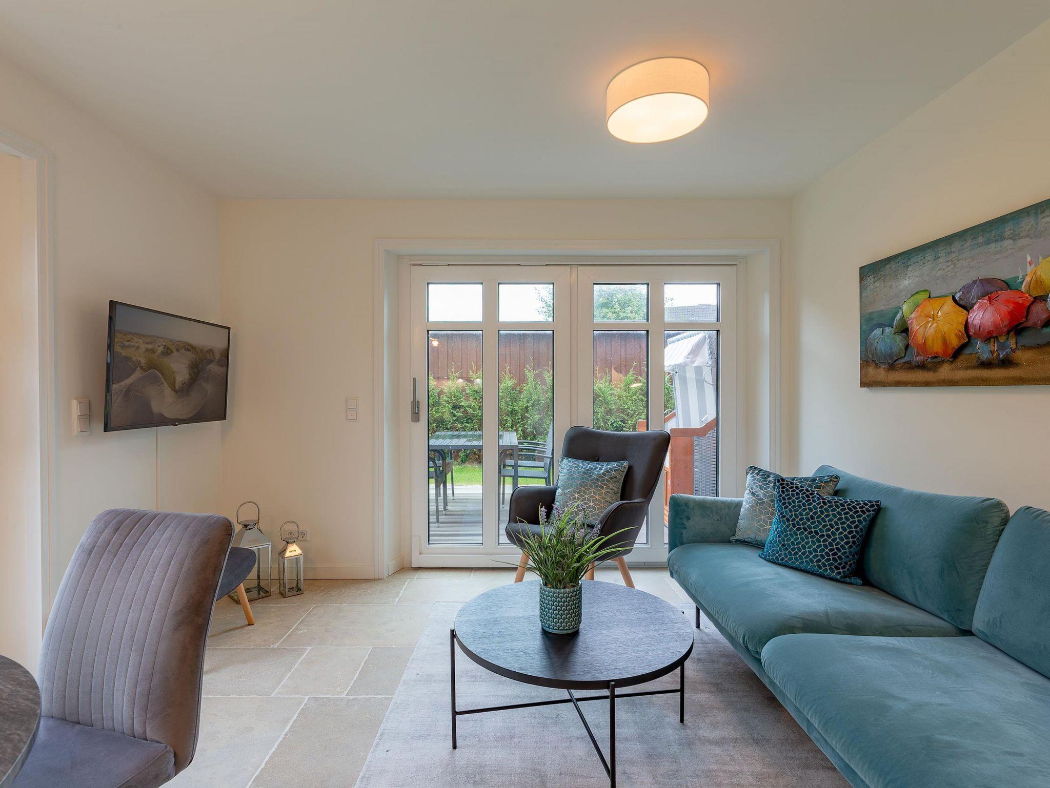 Modernes Wohnen im Stine-Andresen-Weg in Wyk auf Föhr. Der Stine-Andresen-Weg liegt westlich nur wenige Gehminuten vom Zentrum entfernt. Es handelt sich um eine ruhige Nebenstraße, in der sowohl Insulaner als auch Feriengäste leben. In fußläufiger Entfernung gelangen Sie zur Strandpromenade die zum Bummeln einlädt und sich fast 3 km lang erstreckt. Auch der Wyker Stadtwald und der Ortskern in Wyk liegen fußnah zum Stine-Andresen-Weg. Die Haushälfte ist durch die vielen bodentiefen Fenster lichtdurchflutet und modern ausgestattet. Eine Terrasse lädt zum Frühstücken uns relaxen ein. Sowohl im Obergeschoss als auch im Untergeschoss befindet sich ein großes Schlafzimmer mit Doppelbett und jeweils ein Bad mit bodenebener Dusche. Im Untergeschoss steht Ihnen eine Sauna zur Verfügung. Einem erholsamen und entspannten Urlaub steht nichts im Wege ? egal zu welcher Jahreszeit Sie einen Aufenthalt buchen. [nbsp]