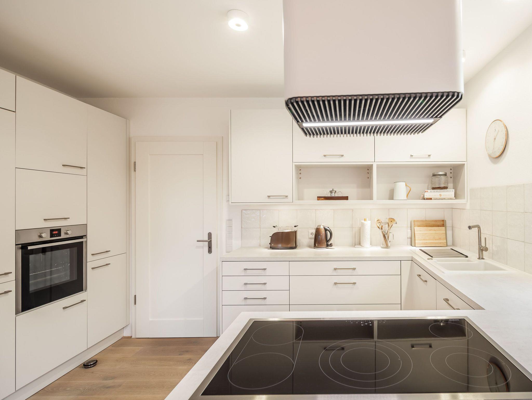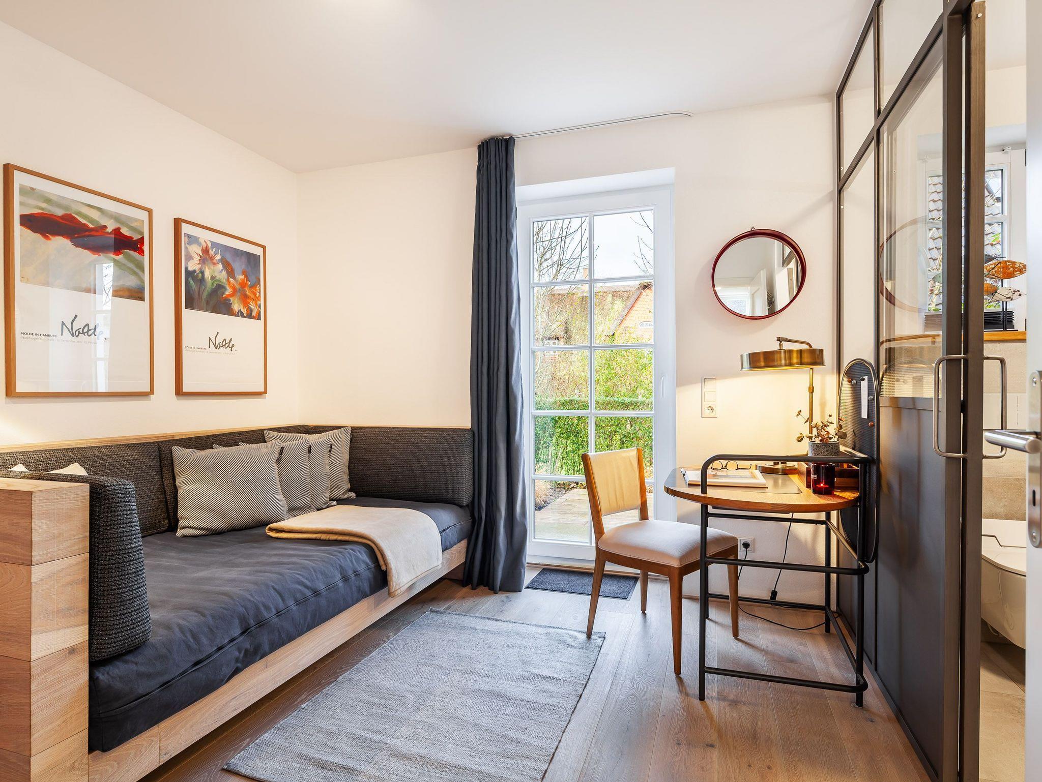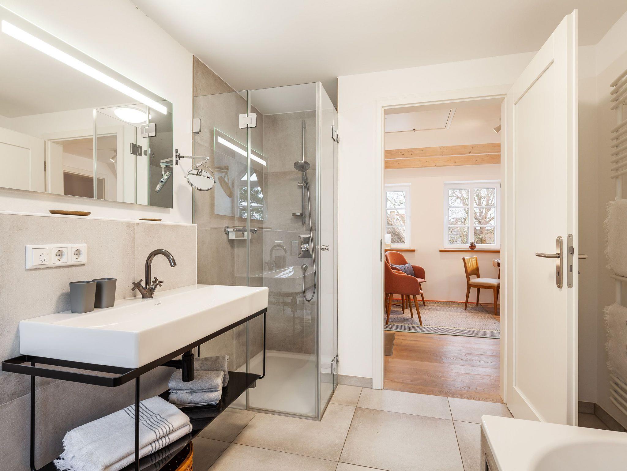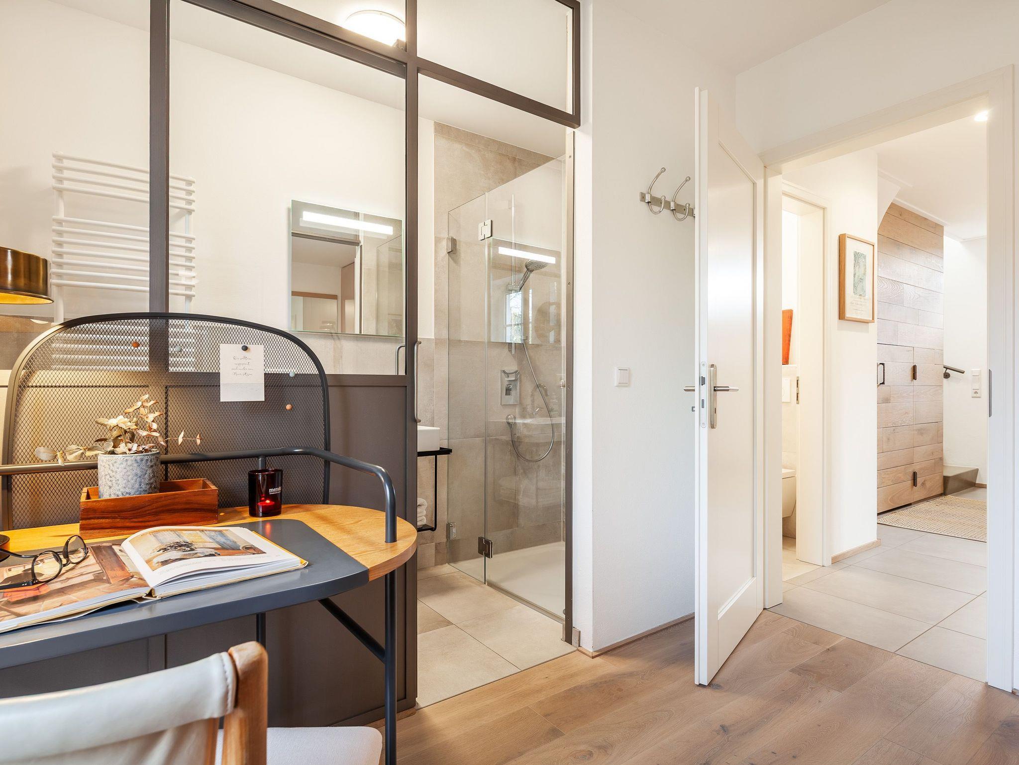Im Erdgeschoss befinden sich der große Wohnbereich mit Zugang zur Terrasse, eine offene Küche mit Essbereich, ein Schlafzimmer/ Rückzugsort mit Dusche en suite sowie eine Gästetoilette.