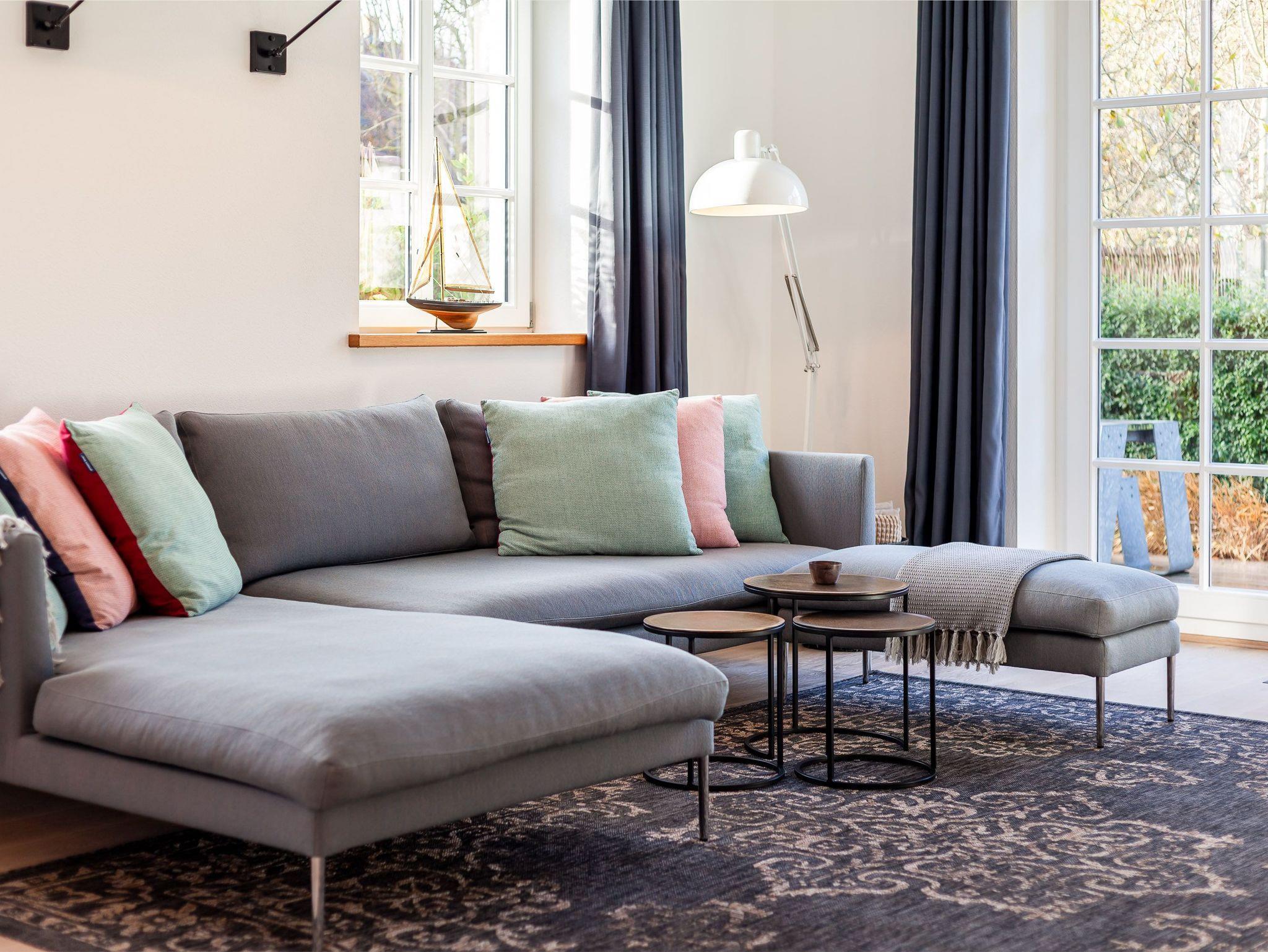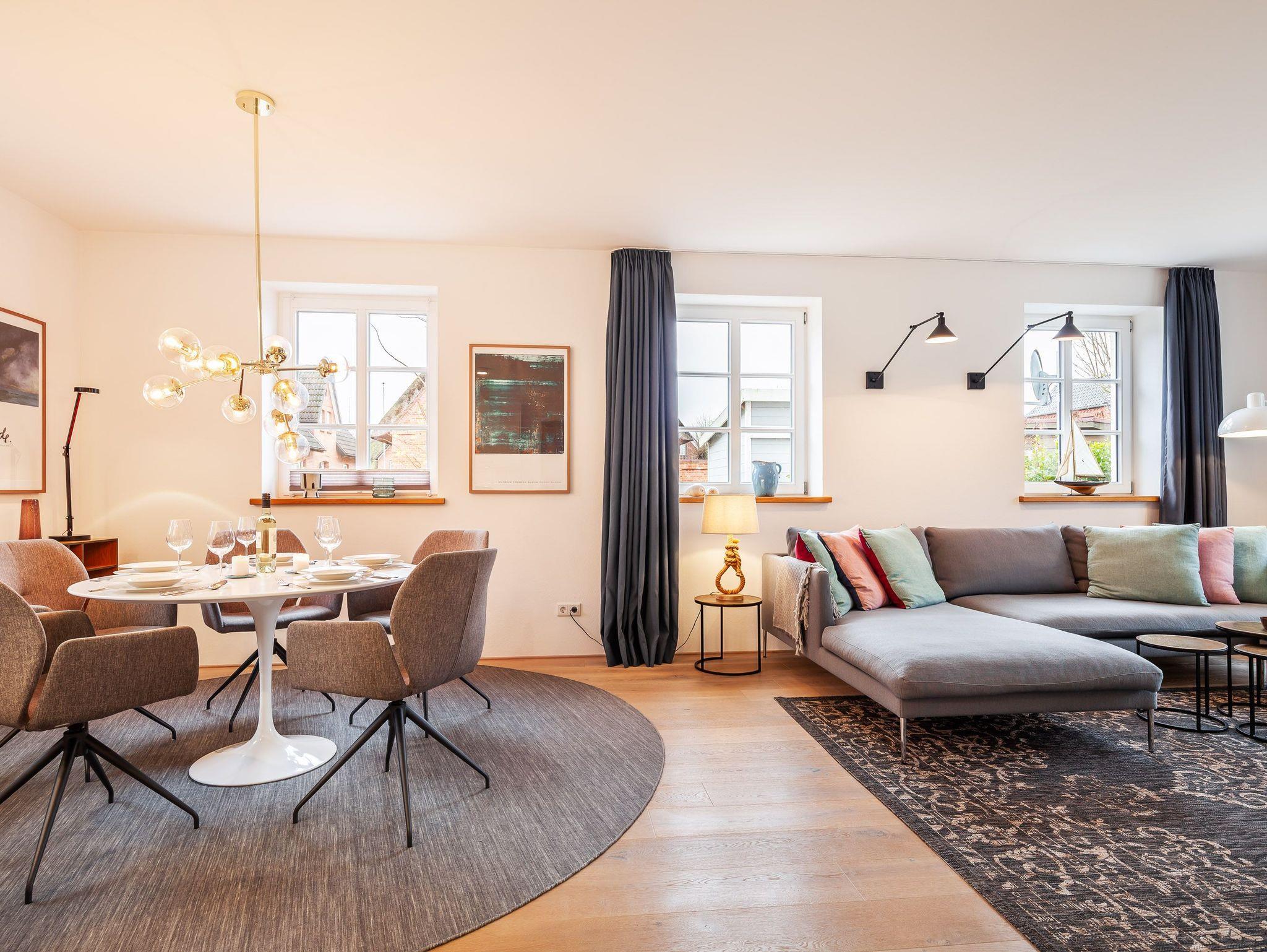 Eichenparkett, hochwertiges Mobiliar, Holzelemente und Betonoptik bilden einen harmonischen Einklang.