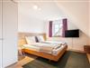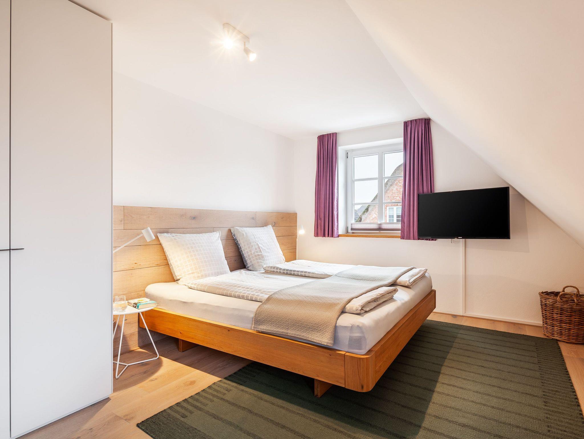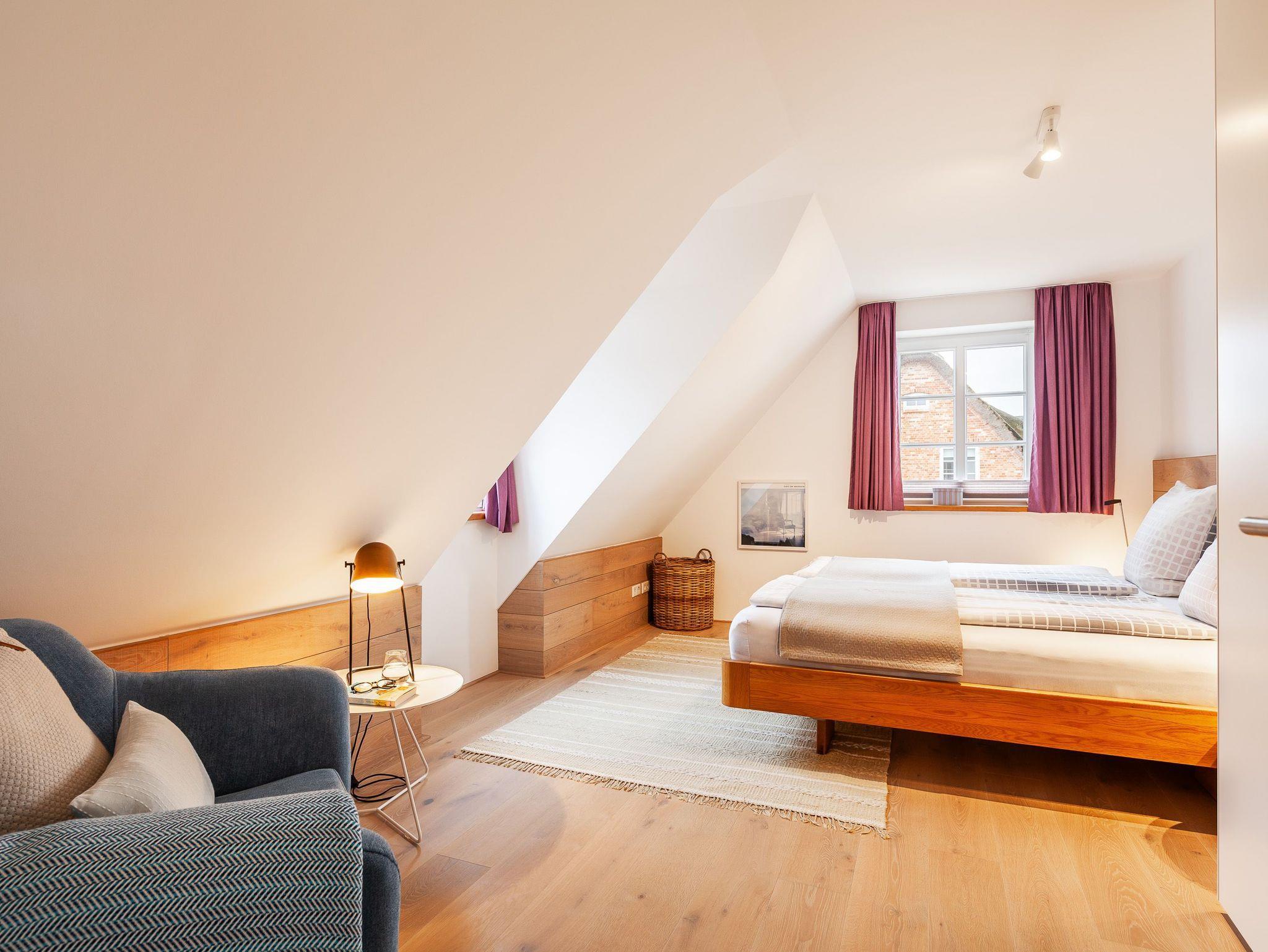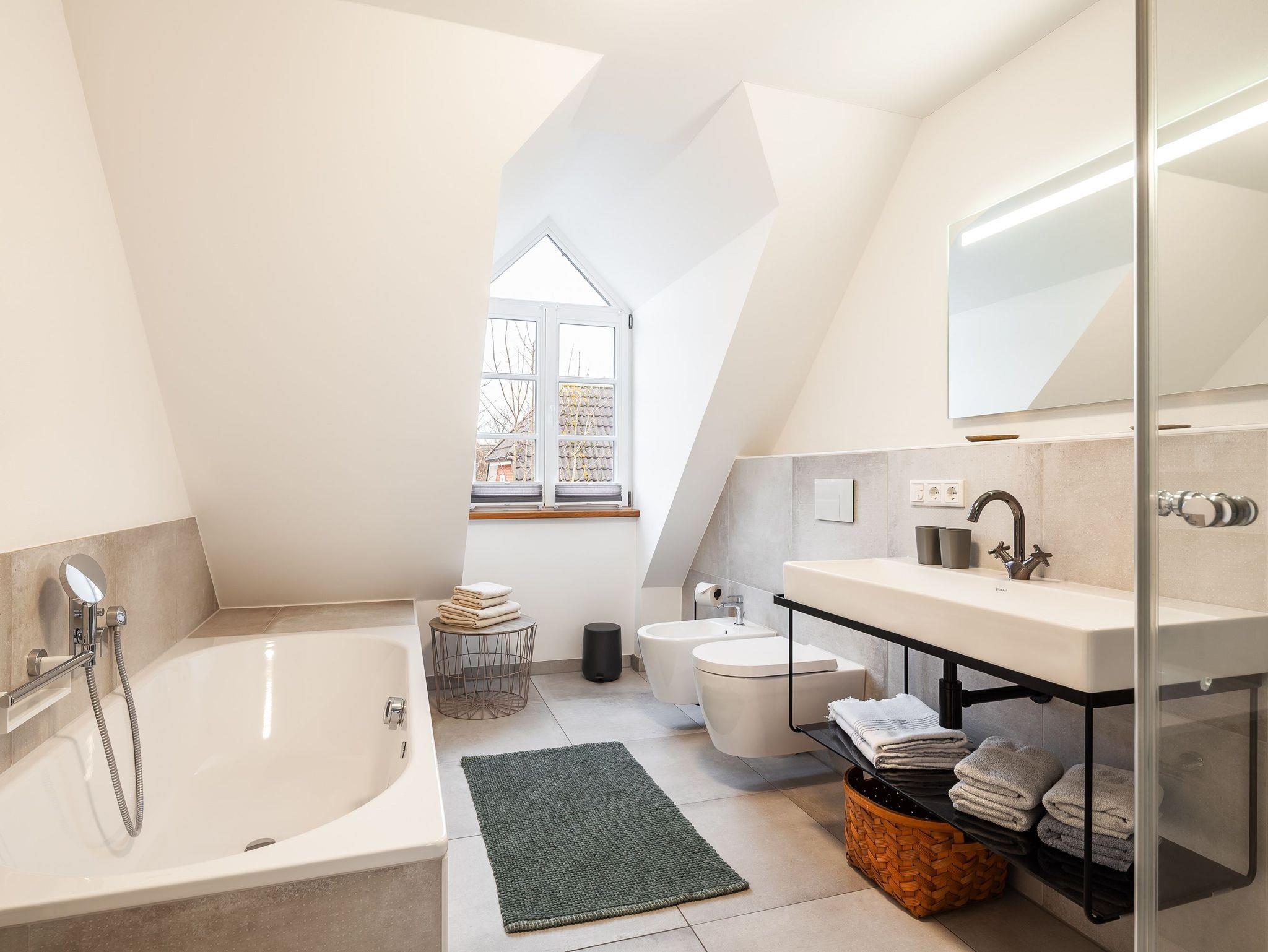 Über die Rohbetontreppe gelangen Sie in das Obergeschoss. Eine offene Galerie mit Schreibtisch, zwei Doppelschlafzimmer mit Fernseher und ein Bad mit Wanne und Dusche erwarten Sie hier.