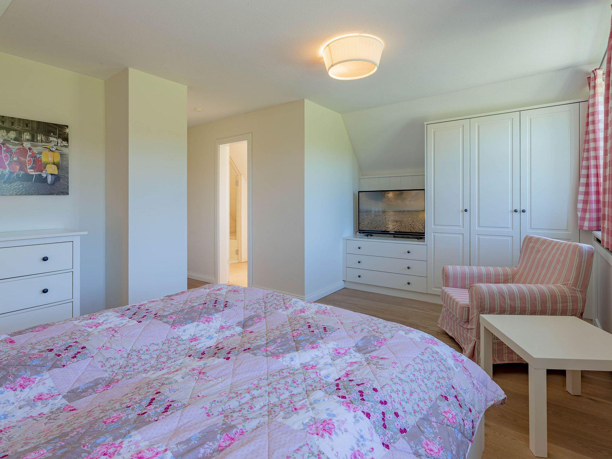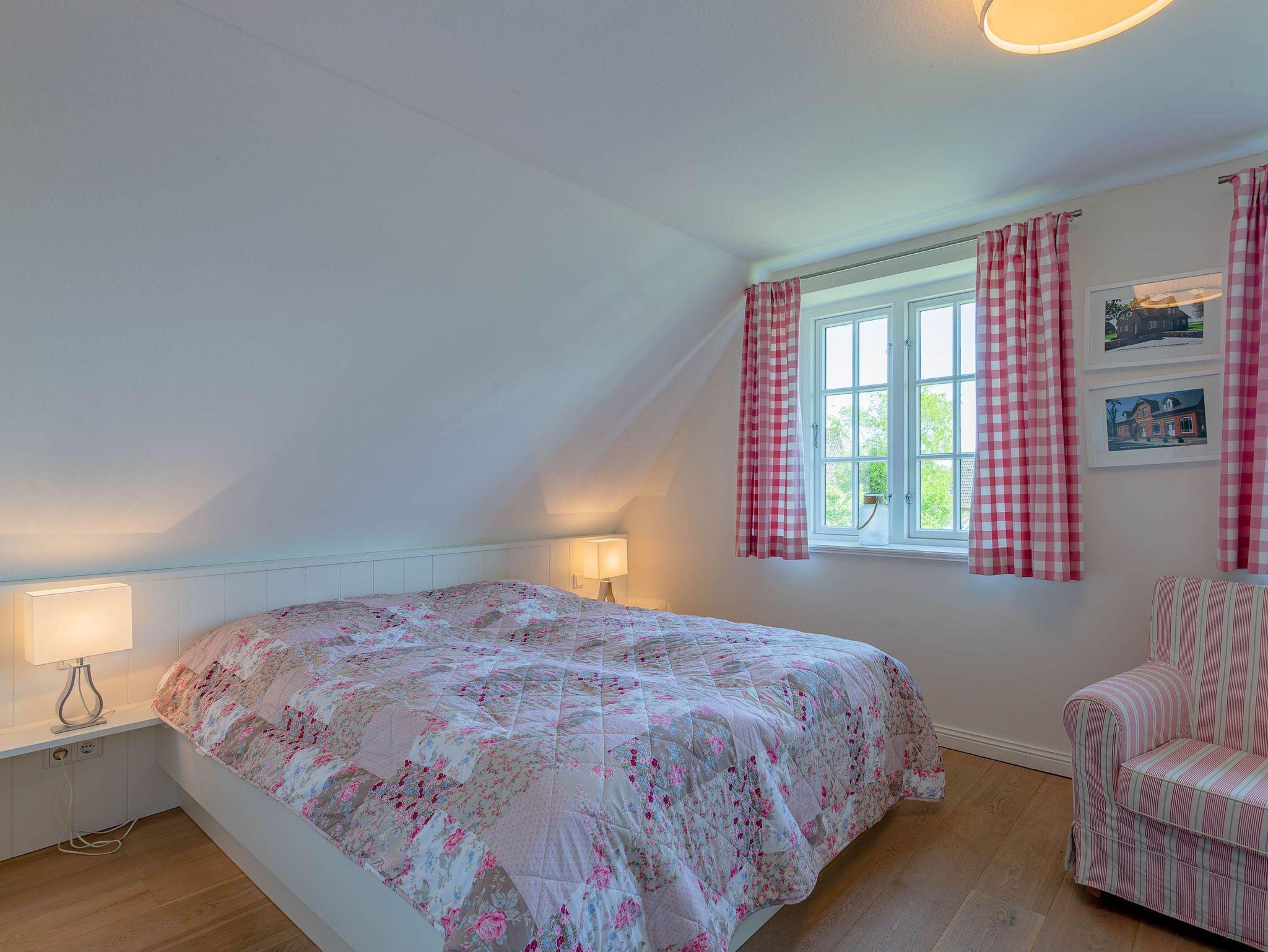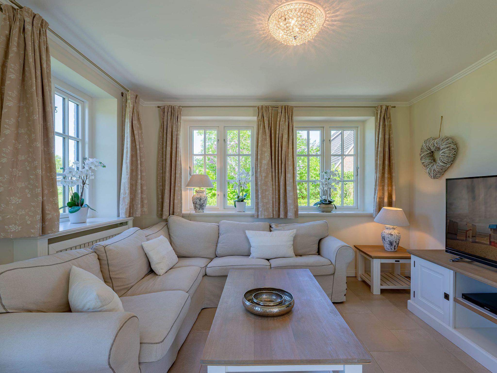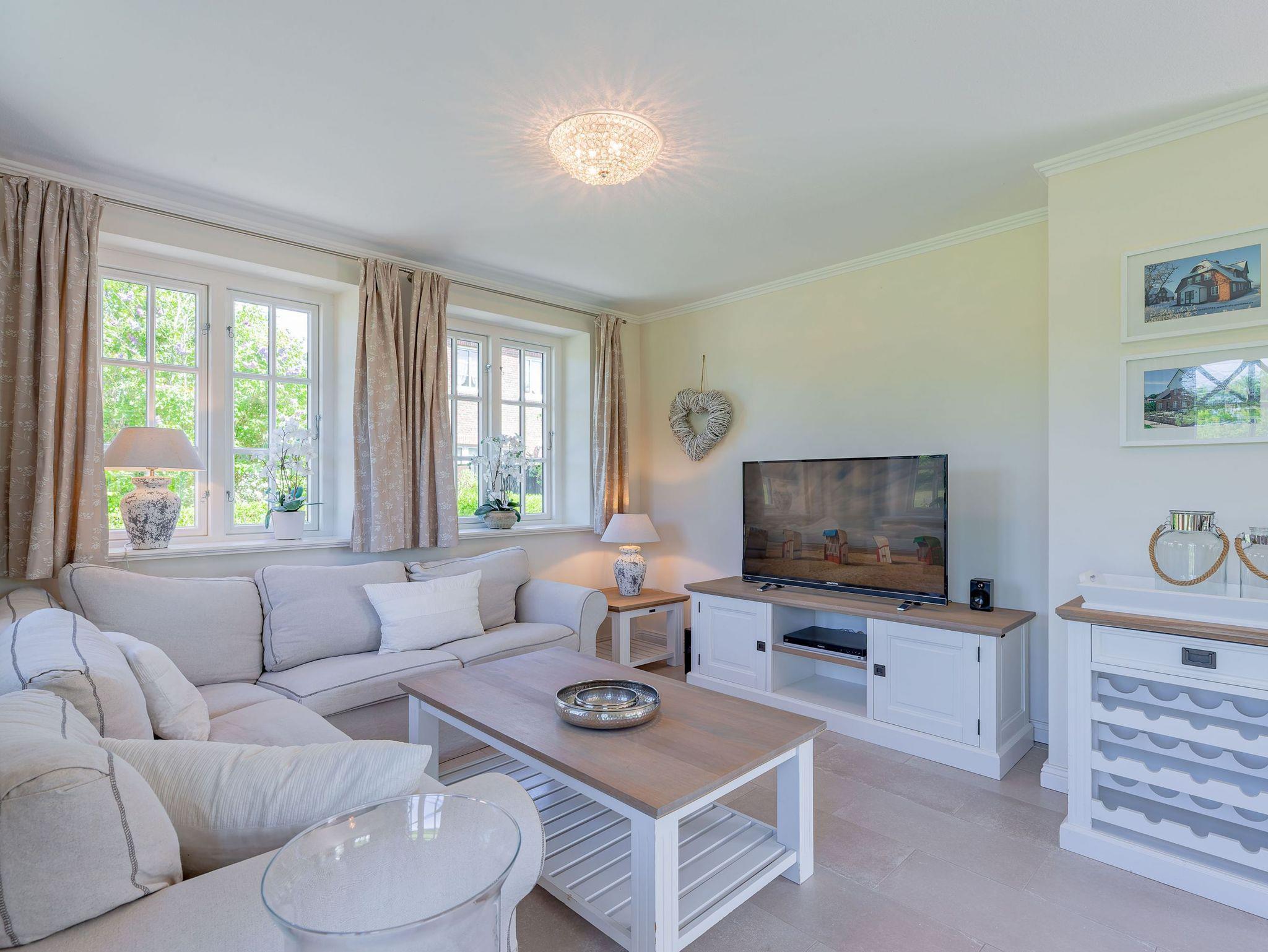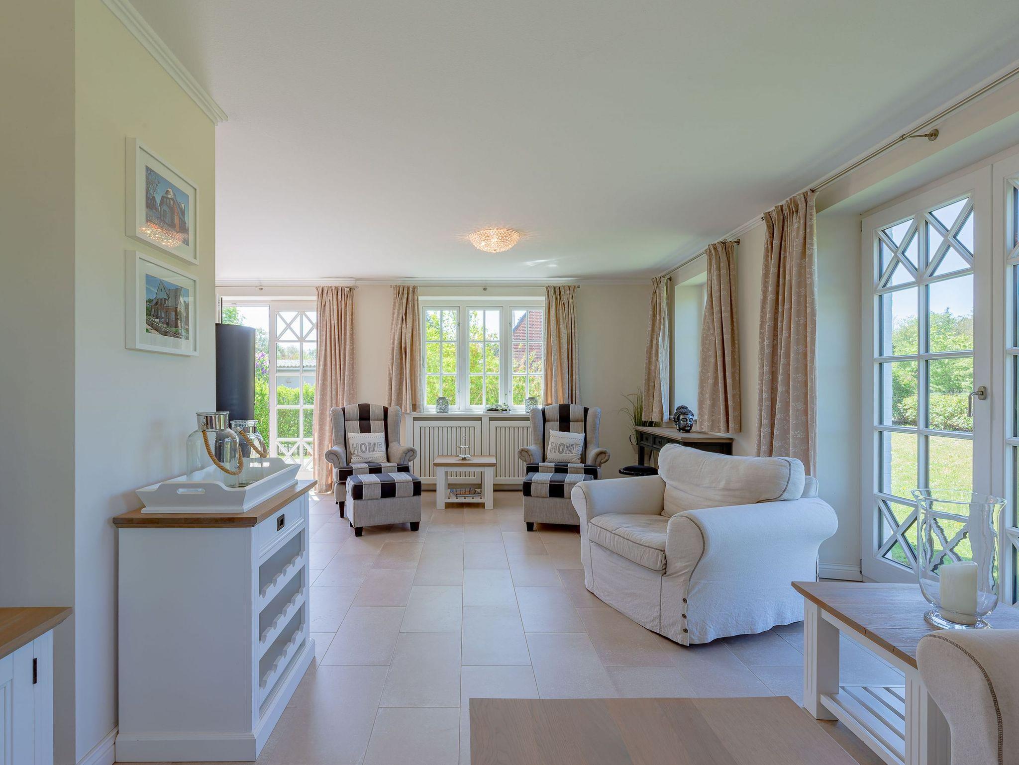 Ein typisches Friesenhaus mit sehr schöner Architektur. Die Summe schöner Details ? Holzsprossenfenster, Reetdach, schöne Fliesen und Holzarbeiten - schafft eine wunderbare Atmosphäre. Im Erdgeschoss befindet sich ein großes, modern eingerichtetes Wohnzimmer mit Essplatz, von welchem Sie direkt auf die ca. 36 qm große Terrasse gelangen. Desweiteren eine moderne Küche, ein Schlafraum, sowie Diele, Bad und HWR. Im Obergeschoss sind zwei Schlafzimmer mit integrierten Bädern und die hauseigene Sauna. In nur wenigen Gehminuten gelangen Sie zum Südstrand, oder Golfplatz. Waldspaziergänge können direkt vor der Tür starten. Alle Erholungs- und Einkaufsmöglichkeiten sowie Cafés und Restaurants liegen ca. 1,5 km entfernt.