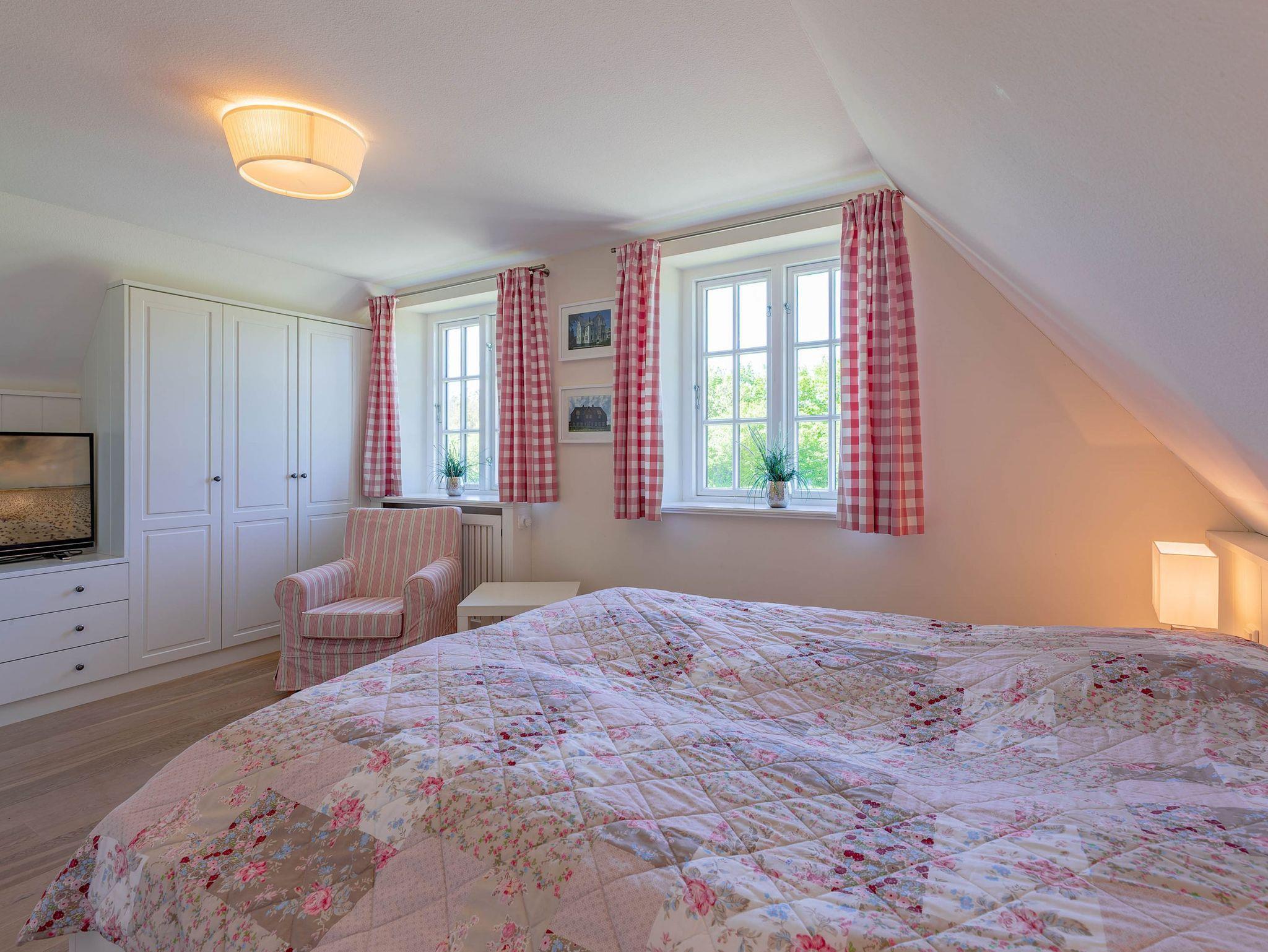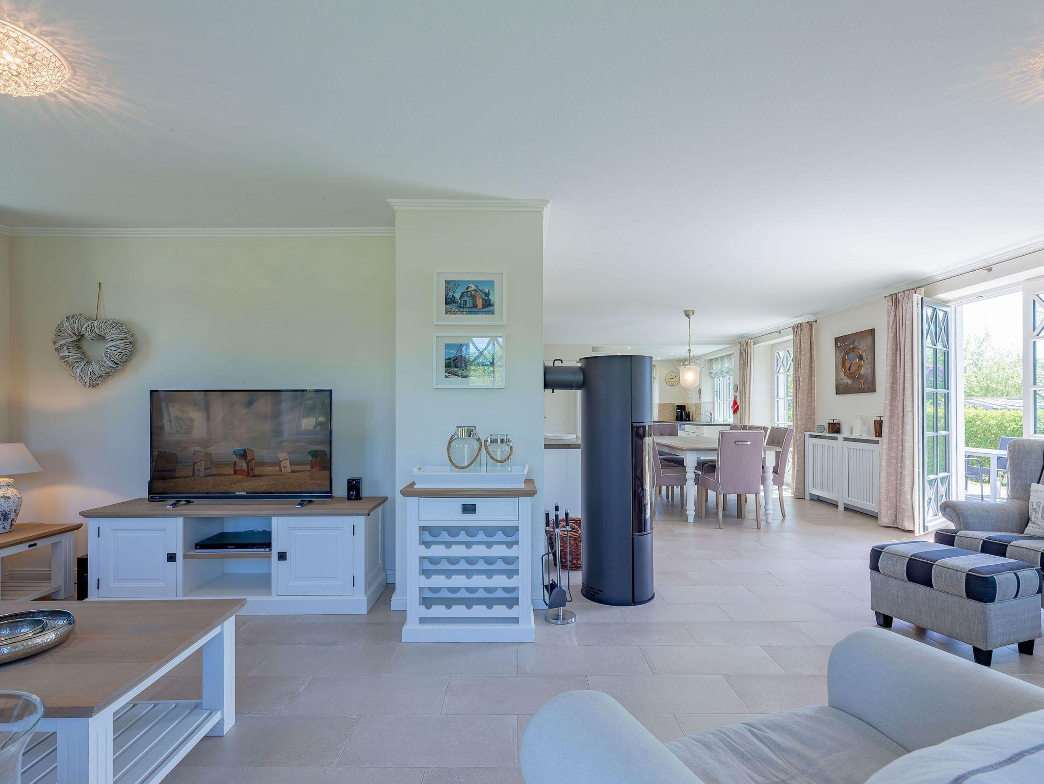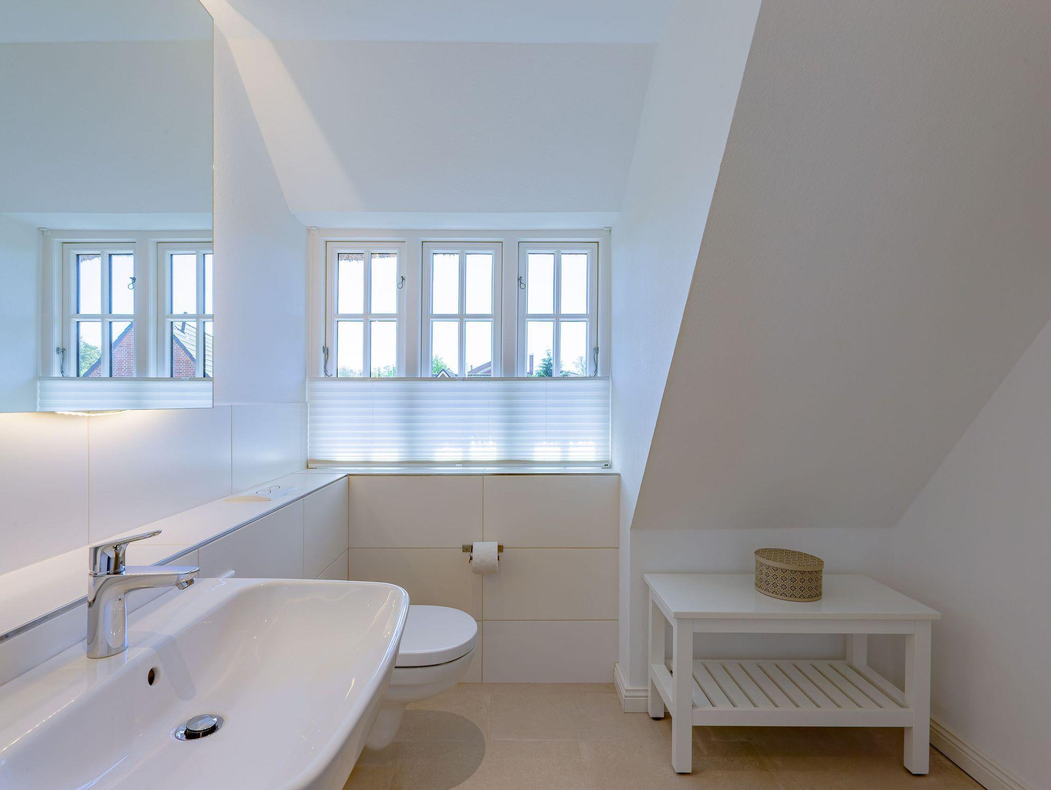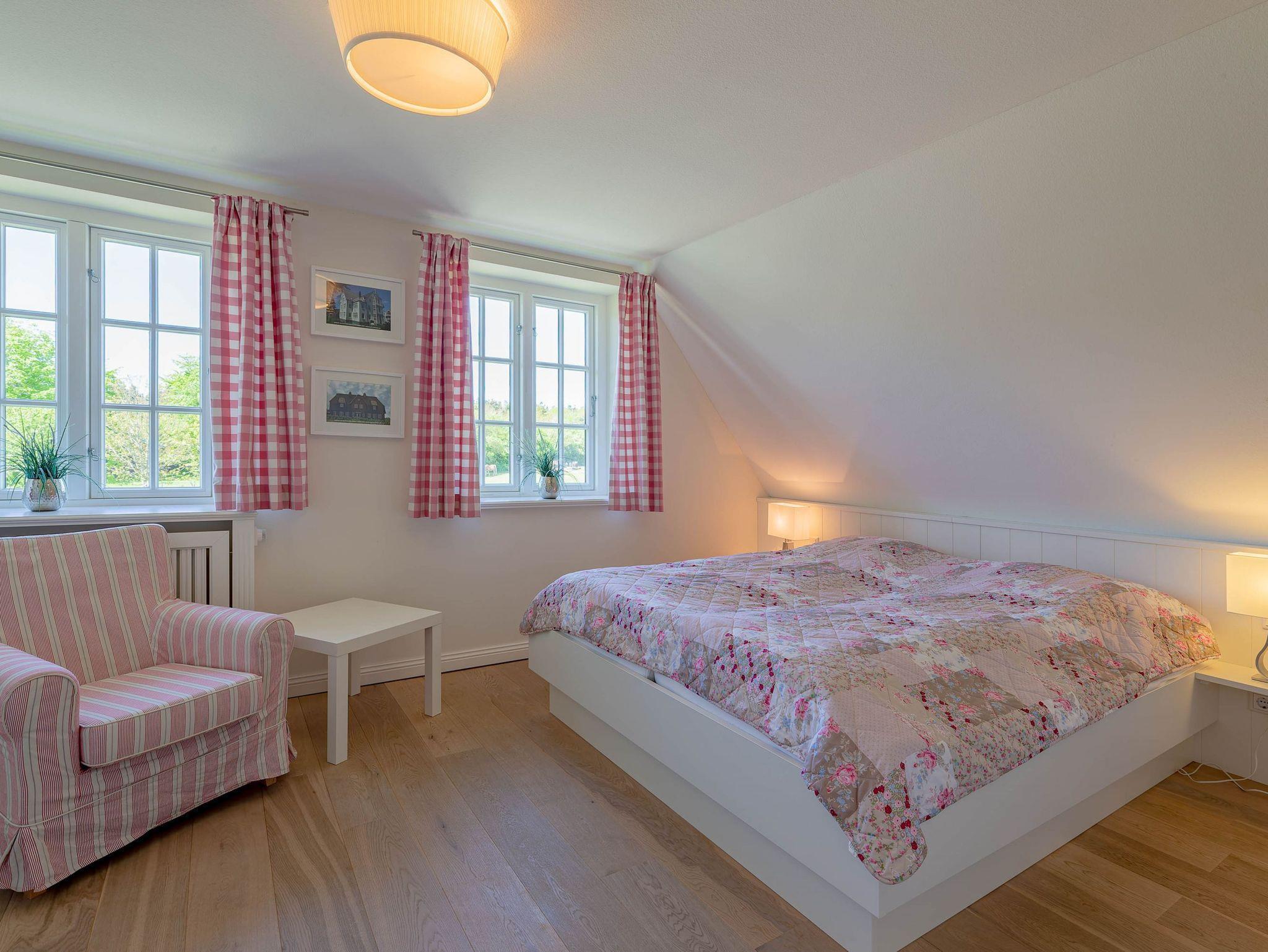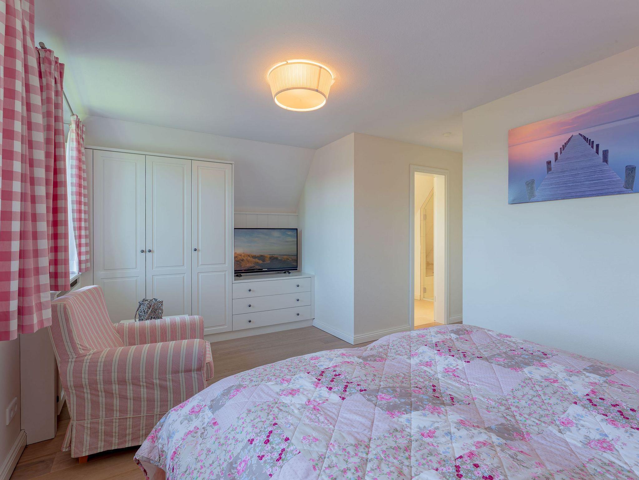 Ein typisches Friesenhaus mit sehr schöner Architektur. Die Summe schöner Details ? Holzsprossenfenster, Reetdach, schöne Fliesen und Holzarbeiten - schafft eine wunderbare Atmosphäre. Im Erdgeschoss befindet sich ein großes, modern eingerichtetes Wohnzimmer mit Essplatz, von welchem Sie direkt auf die ca. 36 qm große Terrasse gelangen. Desweiteren eine moderne Küche, ein Schlafraum, sowie Diele, Bad und HWR. Im Obergeschoss sind zwei Schlafzimmer mit integrierten Bädern und die hauseigene Sauna. In nur wenigen Gehminuten gelangen Sie zum Südstrand, oder Golfplatz. Waldspaziergänge können direkt vor der Tür starten. Alle Erholungs- und Einkaufsmöglichkeiten sowie Cafés und Restaurants liegen ca. 1,5 km entfernt.