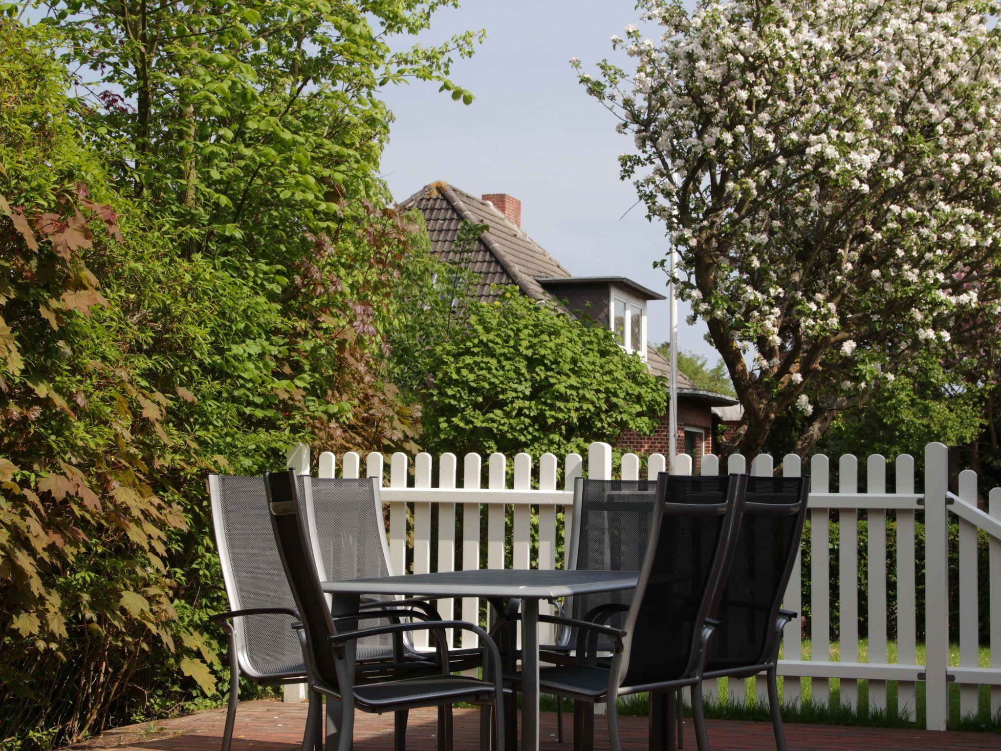 Außenbereich: Parkplatz, Terrasse, Terrassenmöbel.