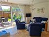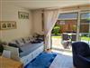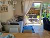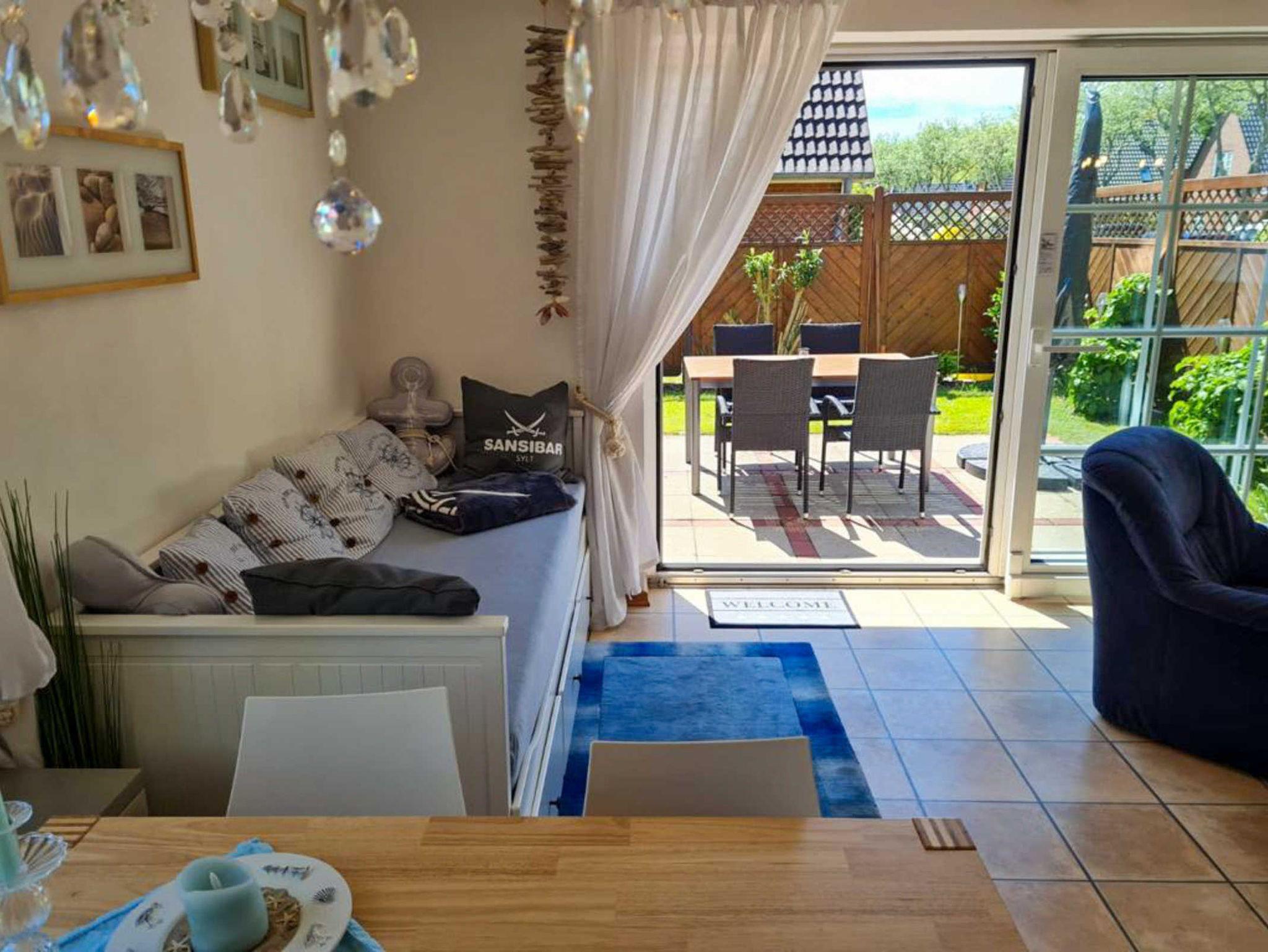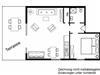 Eingerichtet ist das Wohnesszimmer mit einer bequemen Couch und zwei Sesseln, einem Esstisch mit vier Stühlen sowie einem zusätzlichen Tagesbett mit Schaffunktion (160x200cm).