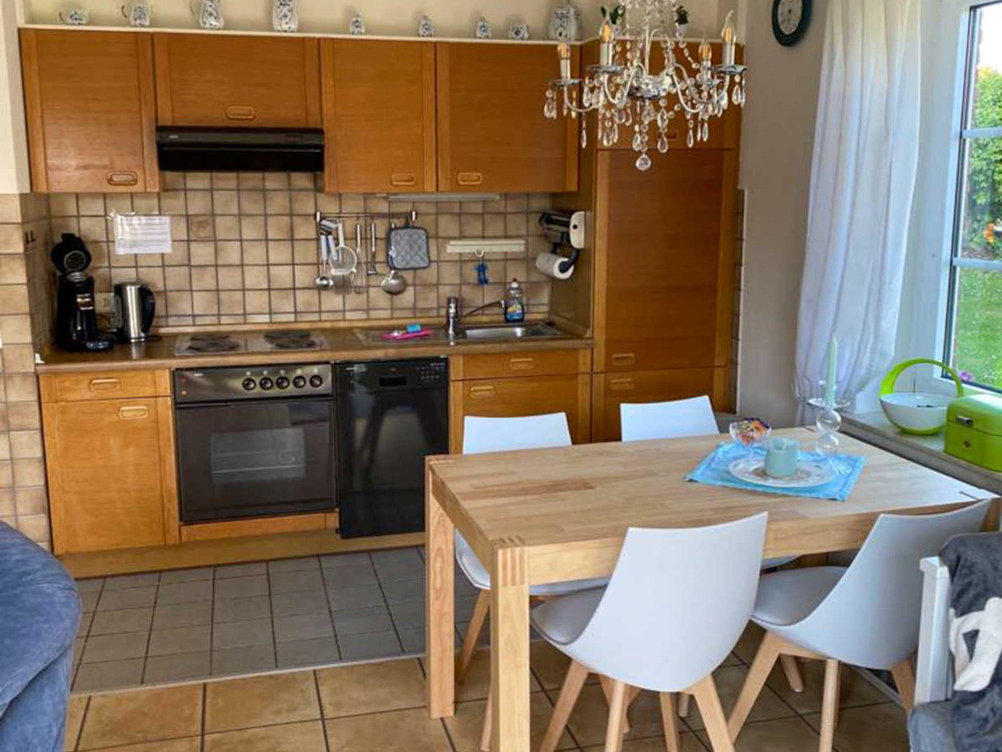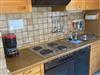 Die integrierte Küchenzeile ist mit Backofen, Kühlschrank und Geschirrspüler ausgestattet.
