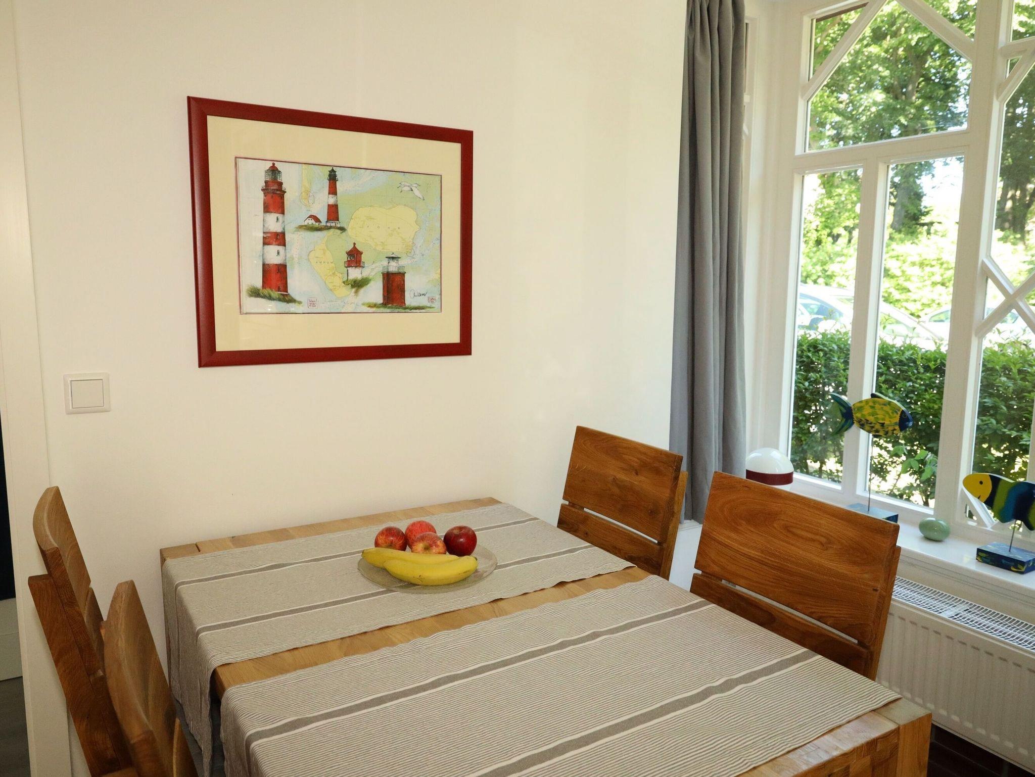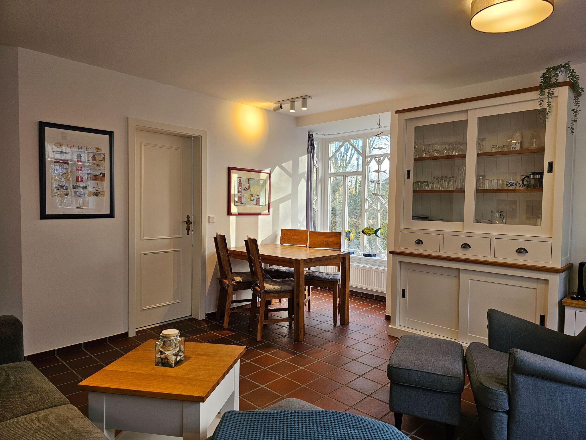 Unsere ca. 50 qm große Erdgeschosswohnung im Haus Gud Tidj erstrahlt seit Anfang 2022 im neuen Glanz und bietet bis zu 4 Personen Platz, um herrliche Urlaubstage zu verbringen. Die zentrale Lage in der Badestraße ist der ideale Ausgangsort für Ausflüge. Das Aquafoehr, die Wyker Innenstadt, das Friesenmuseum und der schöne Strand sind in wenigen Minuten zu erreichen. Das einladende Wohnzimmer mit integriertem Essbereich ist der Mittelpunkt der Wohnung und wurde von den Eigentümer zeitgemäß und gemütlich eingerichtet. Neben einem Flachbild- TV, DVD- Player, einer Musikanlage und WLAN finden Sie hier auch einige Gesellschaftsspiele und einen bequemen Lesesessel. Am Wohnbereich angrenzend befindet sich die moderne und gut ausgestattete Küchenzeile mit Ceranfeld und Backofen, Mikrowelle, Geschirrspüler, Wasserkocher und Kaffeemaschine und einer Senseo Maschine. Hier finden Sie alles, was Sie fürs tägliche Kochen benötigen. Des Weiteren verfügt die Wohnung über ein hellgefliestes Bad mit Dusche und Fenster und zwei liebevoll hergerichtete Schlafräume.
