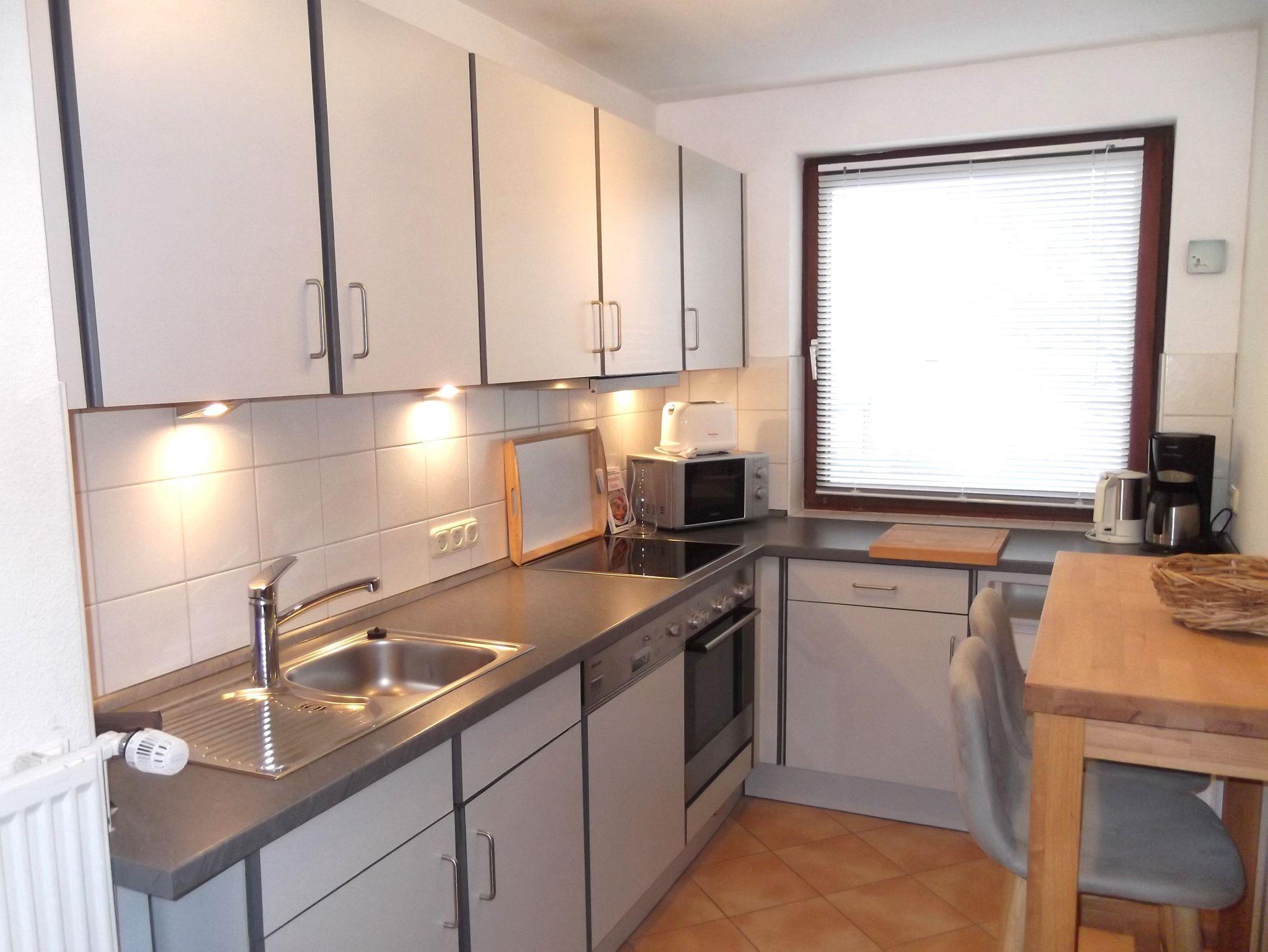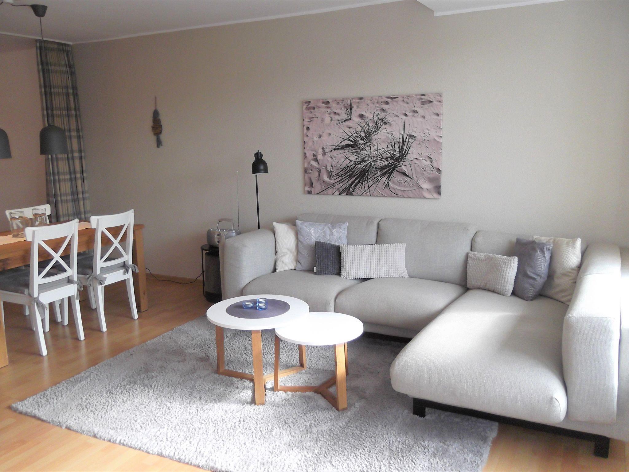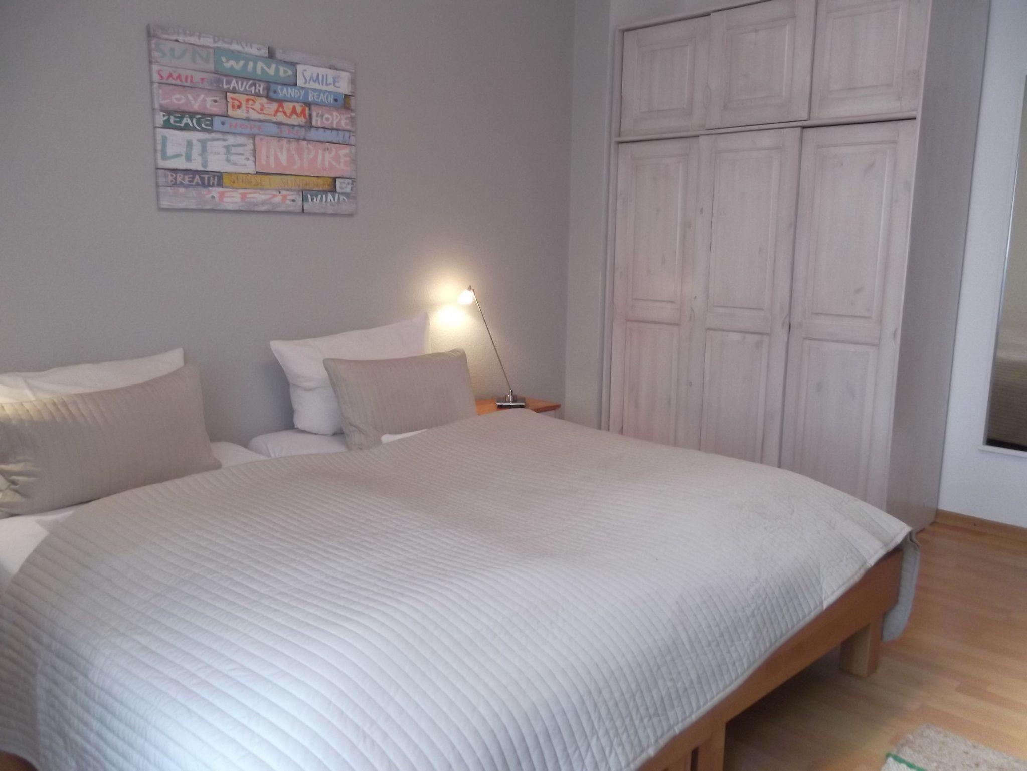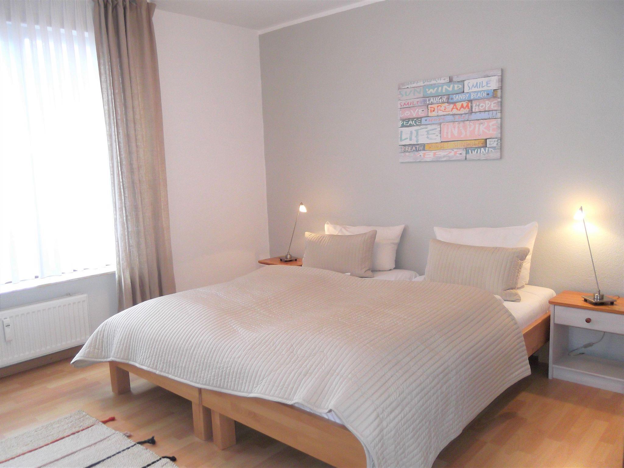Die strandnahe und helle Erdgeschoßwohnung bietet Platz für bis zu vier Personen. Zusätzlich zu dem großen separaten Schlafzimmer mit einem Doppelbett kann man auch die schöne, helle Schlafnische mit dem zweiten Doppelbett nutzen. Die Schlafnische kann durch einen Vorhang vom Wohnzimmer separiert werden.
