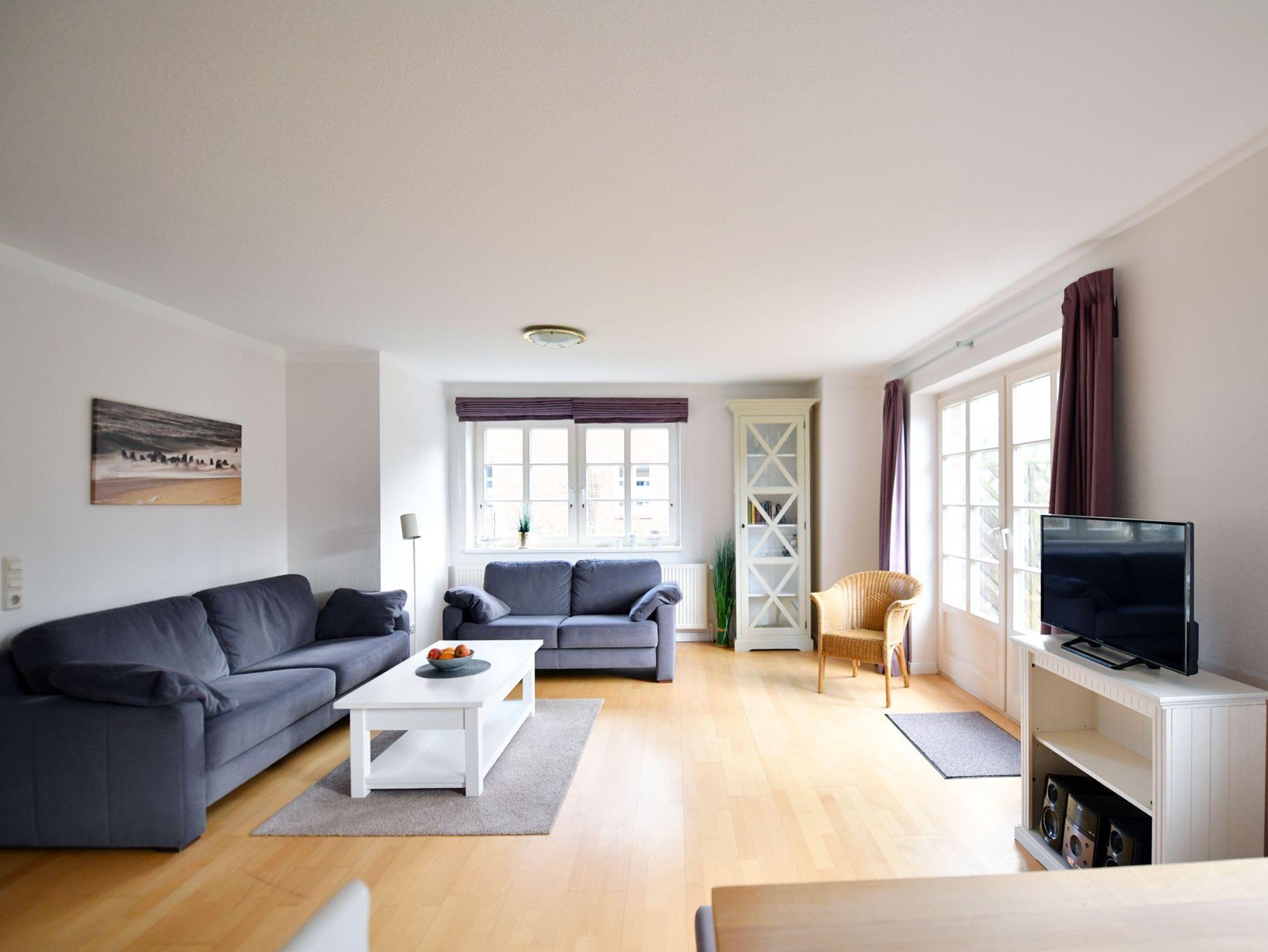 Die Erdgeschosswohnung Nr. 2 bietet Platz für zwei bis drei Personen. Ein großzügiges und helles Wohnzimmer mit bequemen Sofas, ein Essplatz sowie eine moderne Küchenecke lassen keine Wünsche offen. Vom Wohnzimmer aus geht es direkt auf die windgeschützte Südterrasse mit [nbsp]Mobiliar. Ein Schlafzimmer mit hochwertigem Boxspringbett, ein Ruheraum im Souterrain sowie ein Duschbad mit Fenster gehören ebenfalls zur Wohnung.